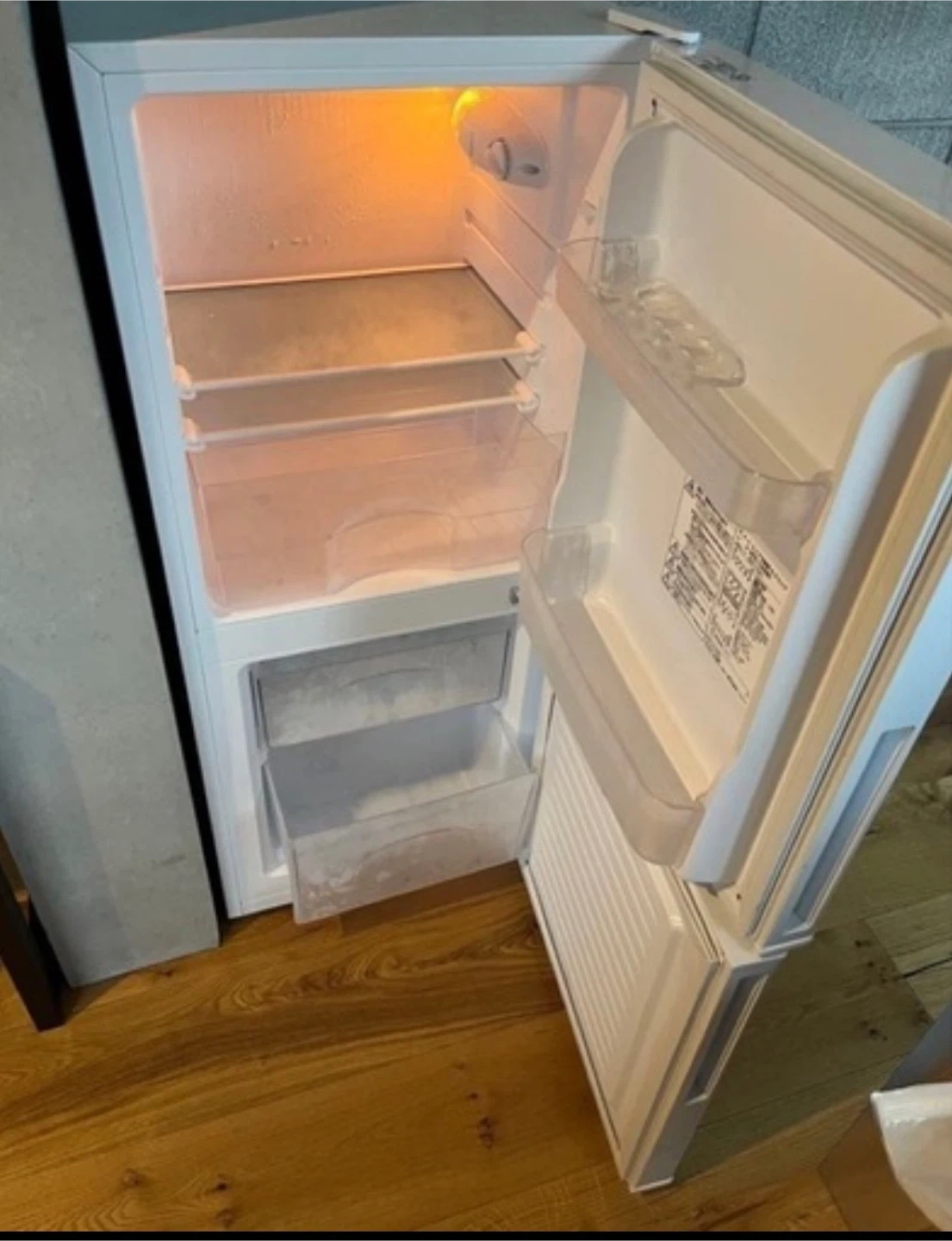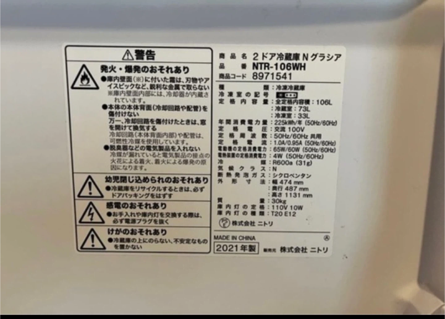 ニトリの2ドア冷蔵庫です。 【情報】 ブランド:ニトリ 型番:NTR-106WH 年式:2021年製 サイズ:全定格内容積106L(冷蔵室:73L、冷凍室:33L) 【状態】 使用感あり、傷あり 中古品であることをご了承ください。 使用していたため傷や多少の汚れありますが、できる範囲で消毒、清掃済みです 写真に写っていない部分の傷や汚れなど、確認できる範囲で追加お写真おくれますのでメッセージください(素人なので見落としがあるかもしれません) 2枚目の写真にある卵ケースはつきません 中古品にご理解のある方のご購入をお願いします 自宅まで引き取りお願いします 引越しのため出品、時間が限られているため期間限定出品となります