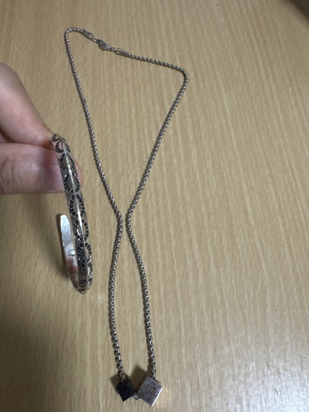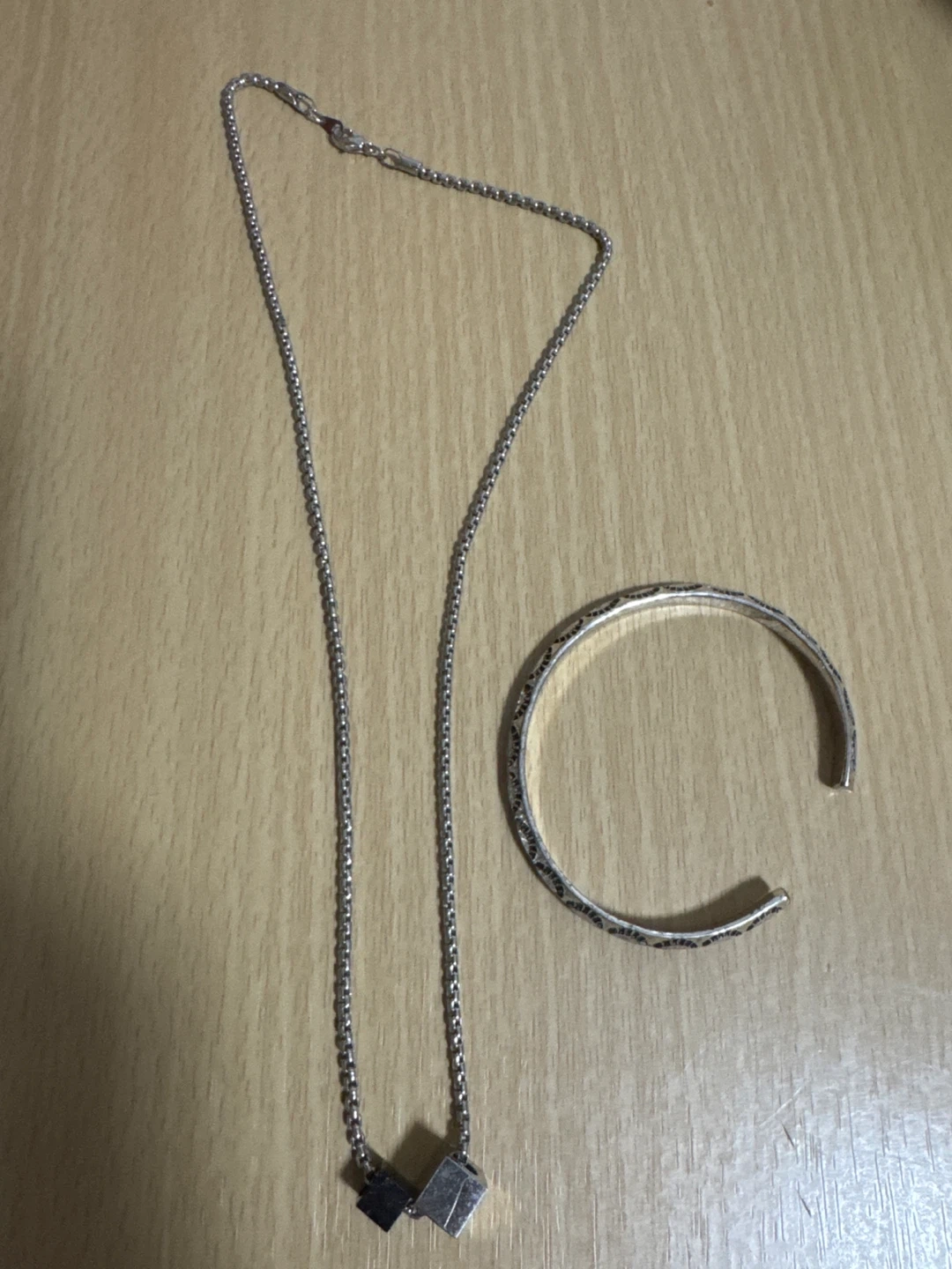 ネックレスとバングルのセットです。 Rageblue ブランドです。 ・ネックレス:シルバーカラー、キューブ型チャーム付き ・バングル:シルバーカラー、模様入り 値下げいたしました。 中古品であることご了承ください。 新大久保駅から池袋駅まで対応します!