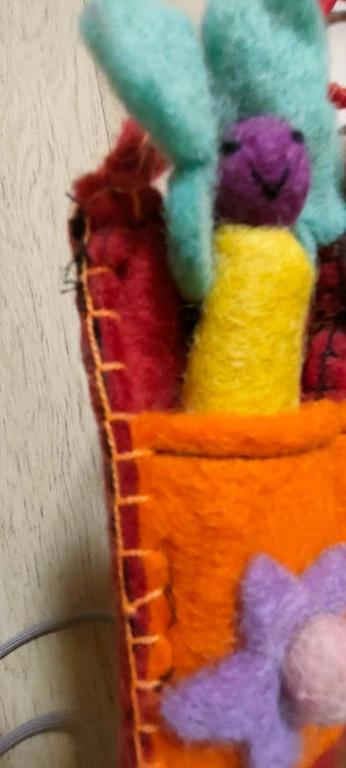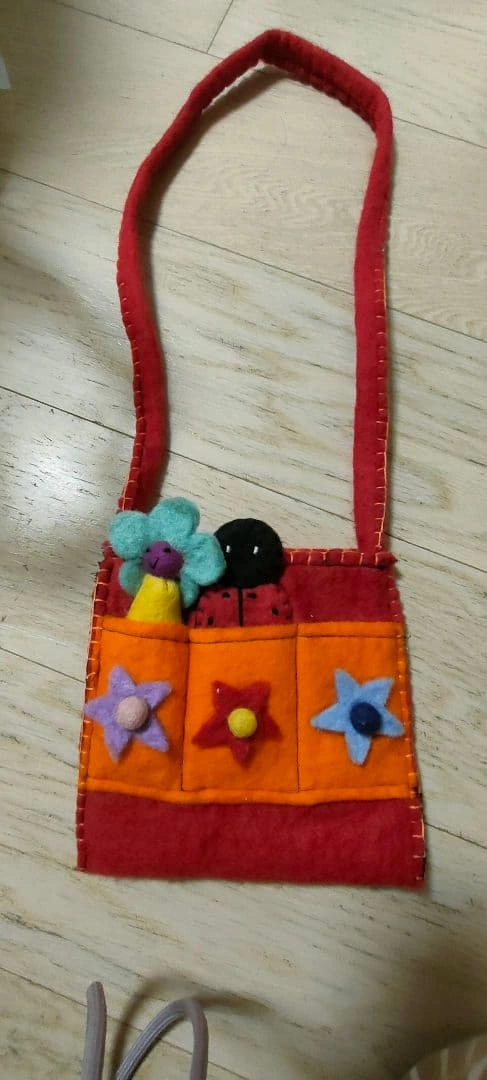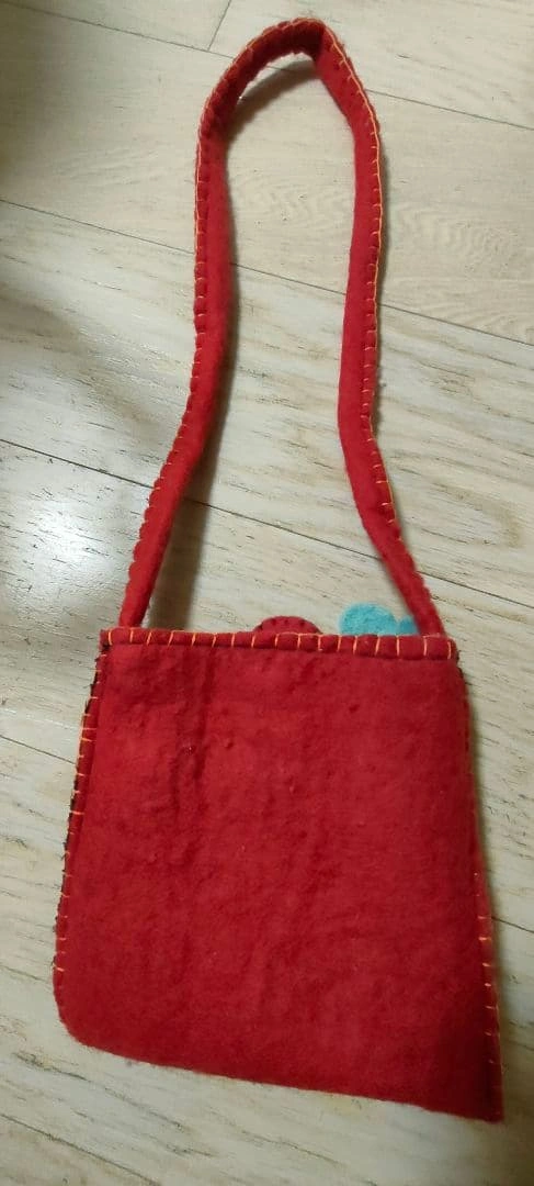 数年前のネパールのお土産です。 ウール生地のハンドメイドの可愛らしい子供用ショルダーバッグです。指人形が3つ付いていたのですが、ひとつ紛失してしまいました。 サイズ縦18センチ 横19センチ ショルダー部分40センチ 現地のハンドメイドのため、多少糸のほつれ感あり。自宅保管であり、子供が2.3回使用したため、その点気になさらない方ご検討お願い致します。 カ ラー...レッド 柄・デザイン...その他 素材...ウール