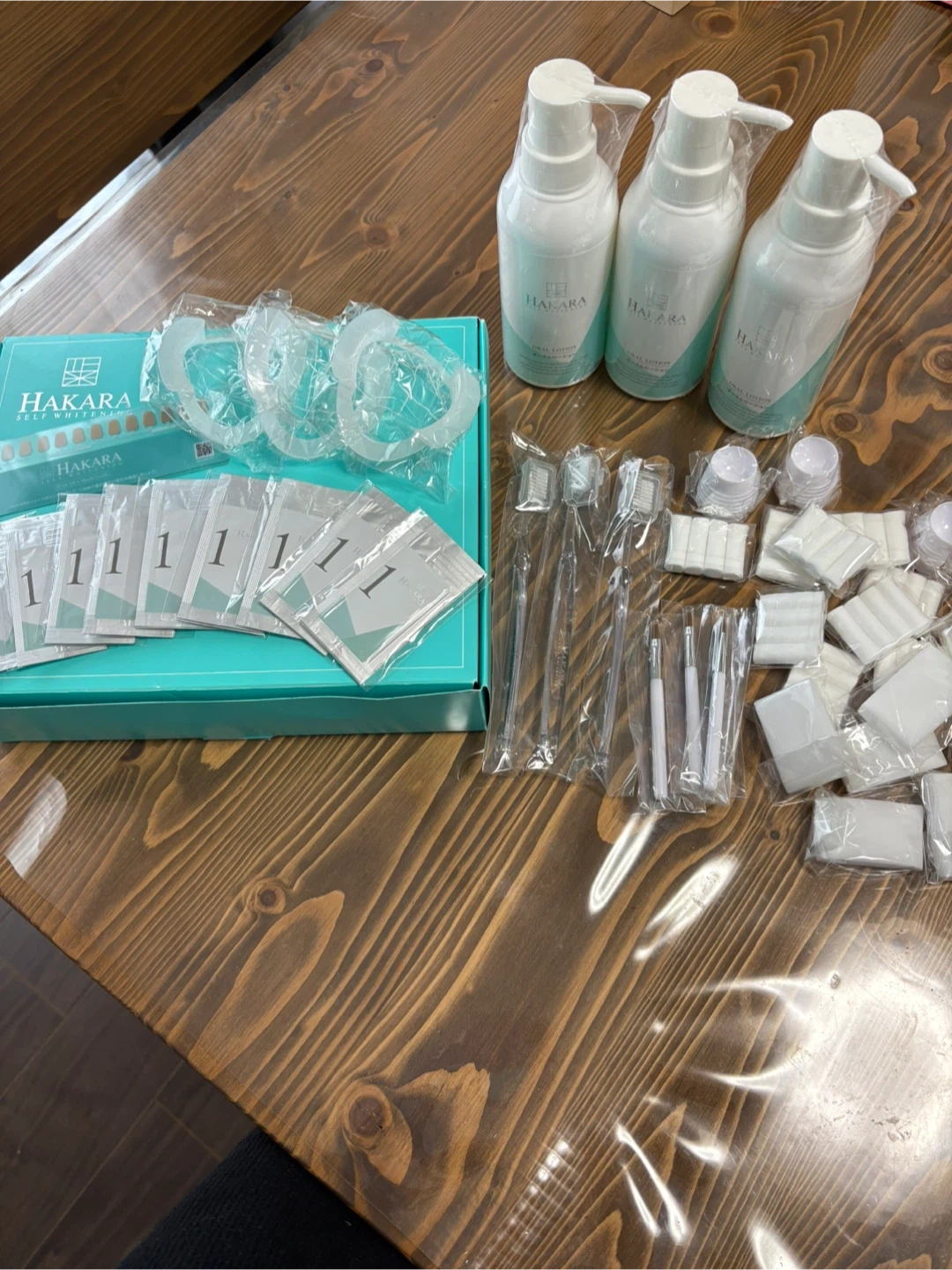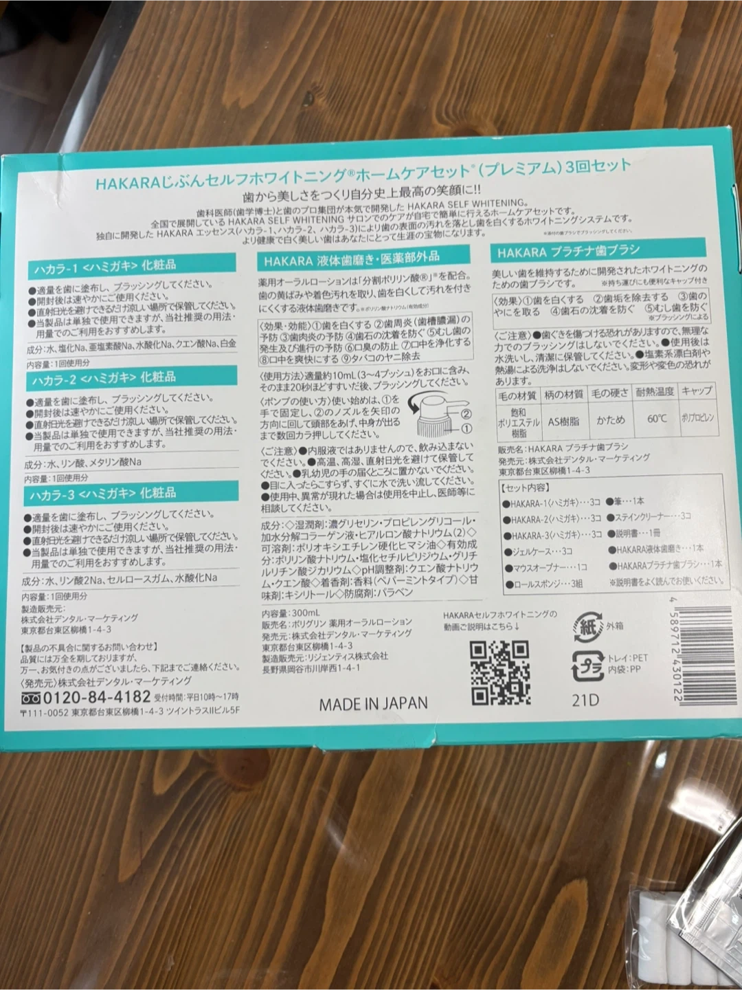 ハカラのセルフホワイトニング プレミアム3個セットです 【情報】 ブランド:ハカラ 商品:セルフホワイトニング プレミアムホームケアセット(プレミアム)3Dセット セット内容:ハカラ1(ハミガキ)3個、ハカラ2(ハミガキ)3個、オーラルローショ ン 3個、ジェリ―シート12個、マウスオープナー 3個、スケールブラシ 3個、ハカラプラチナブラシ 1本、ロールスポンジ 3個 容量:300ml (オーラルローション) 上記商品を3セット分あります。1セッ¥12000の商品。 ワンセット¥3000円で販売しますのでワンセットが良ければチャット下さい!! 【状態】 未使用品 箱、説明書捨ててしまってます。 中古品であることご了承ください