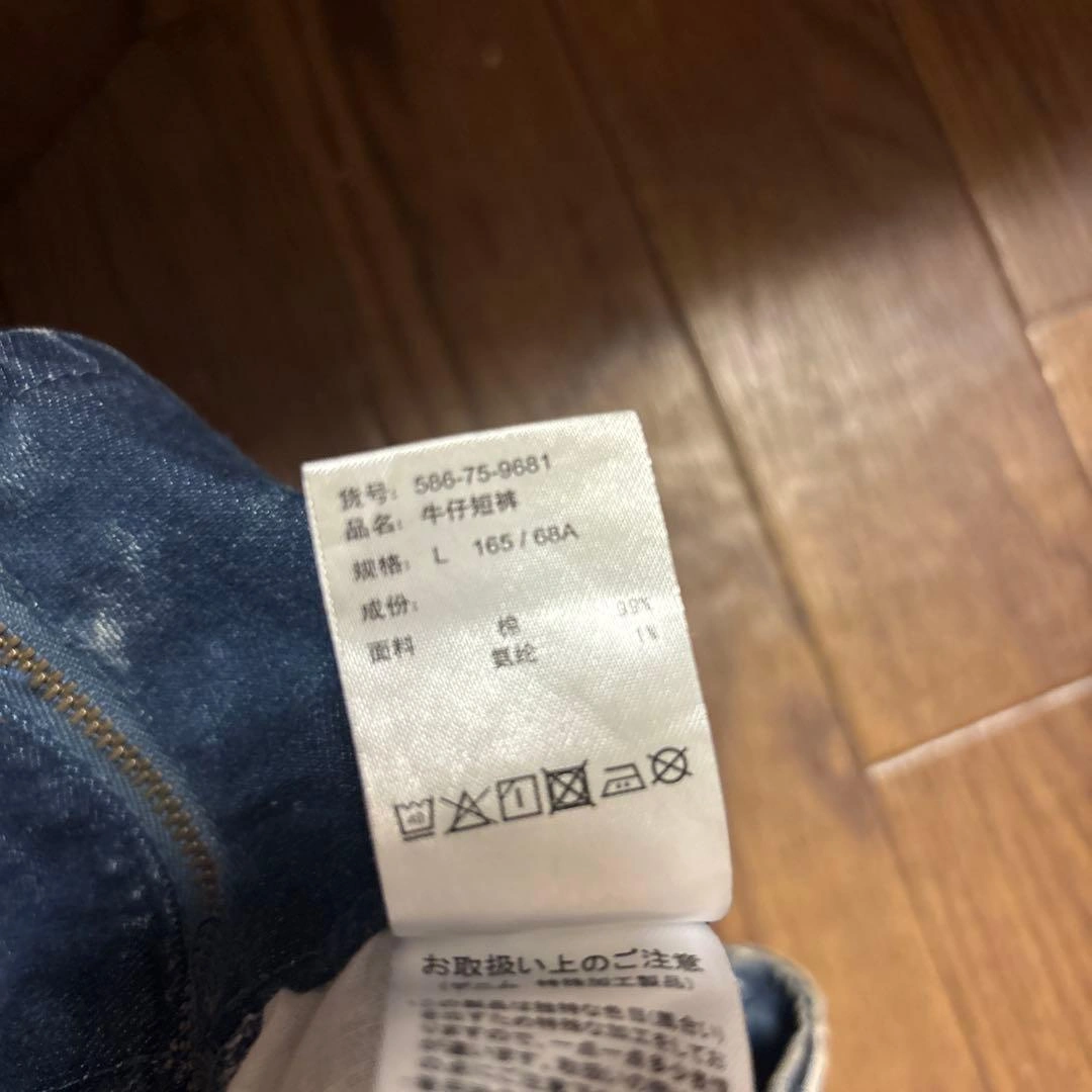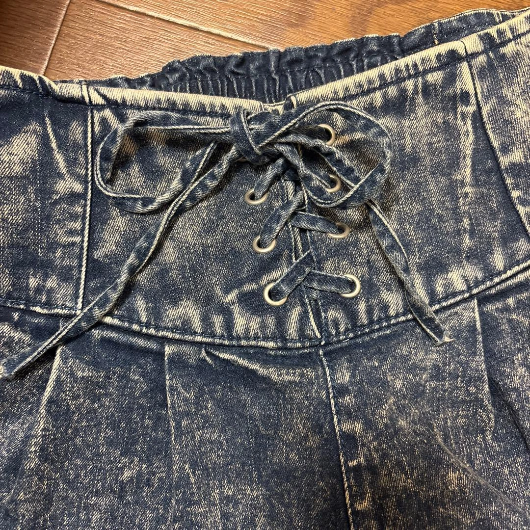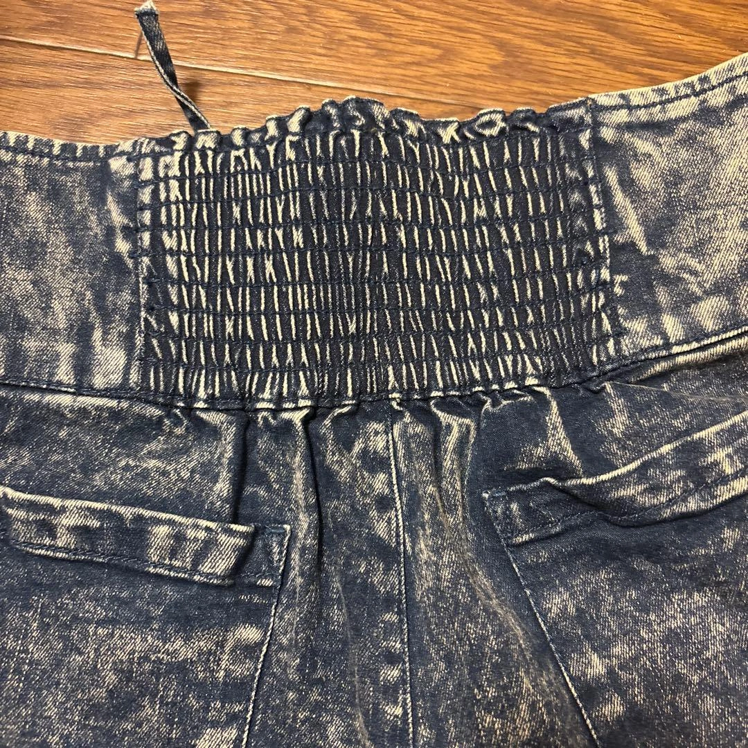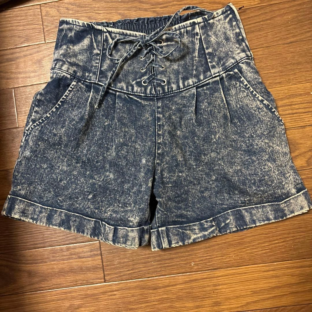 デニム風のハーフパンツです。ウエストはゴムとリボンで調整可能です。 - 色: デニム風 - スタイル: ハーフパンツ - サイズ: L 古着である事をご理解いただきご検討ください。ご希望の方はお気軽にご連絡ください。