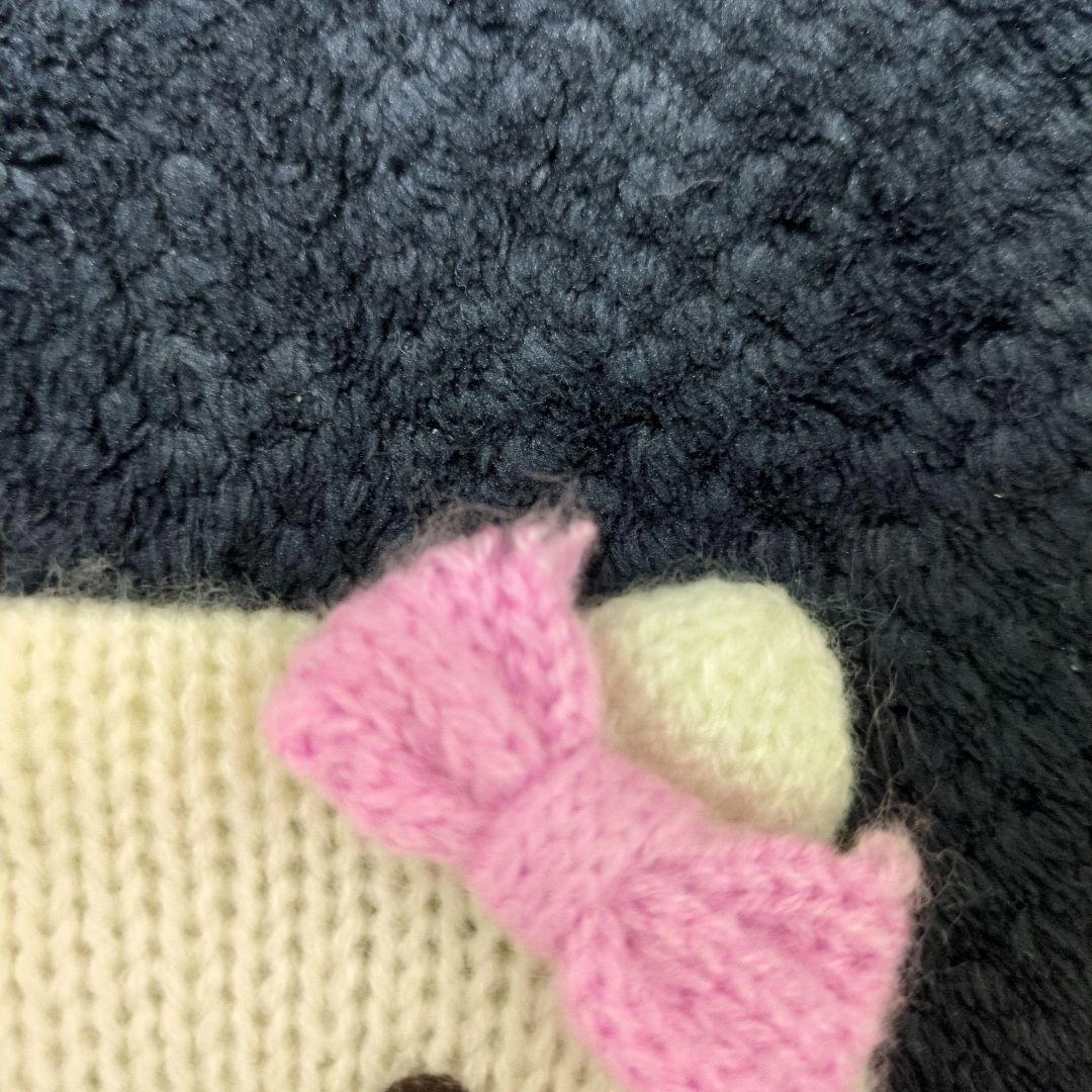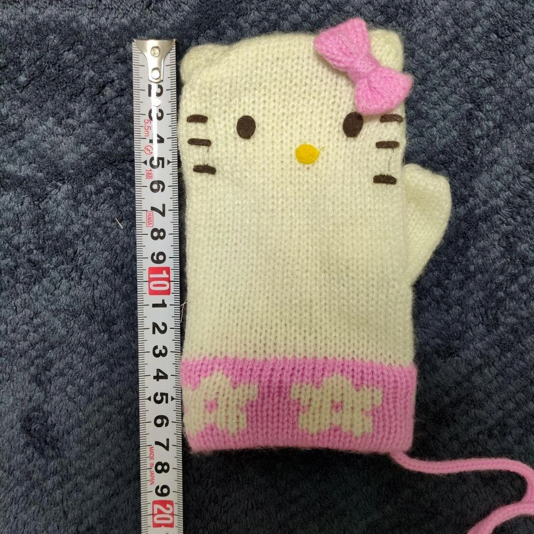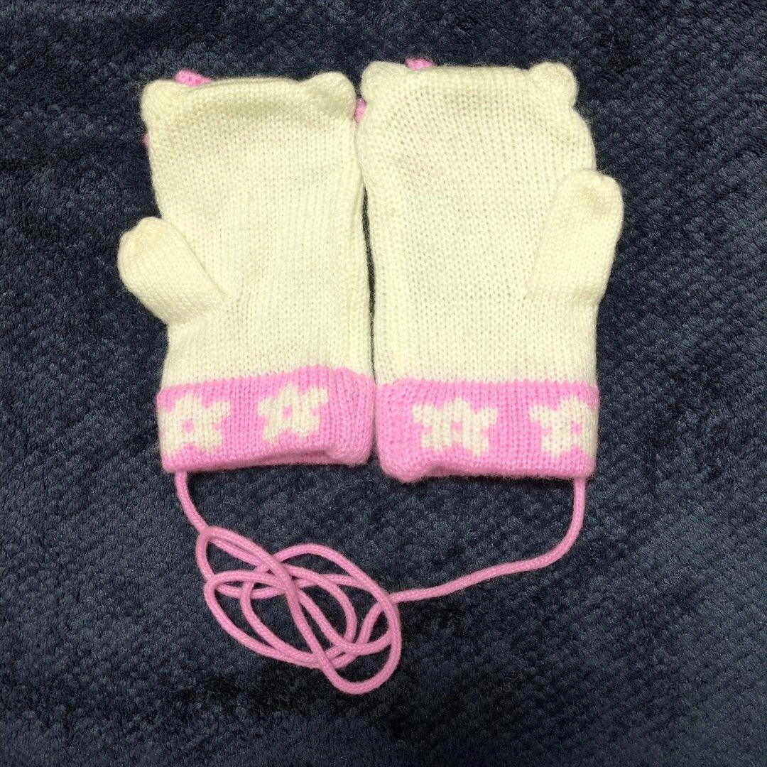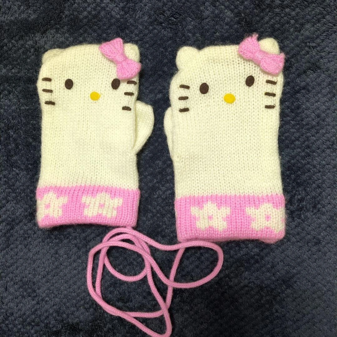 ハローキティデザインのニット手袋です。リボンが付いています。 - デザイン: ハローキティのキャラクターデザイン - 色: ホワイトとピンク - 素材: ニット - 特徴: 手首に紐付き - 装飾: リボン付き ほつれあり写真③ ご覧いただきありがとうございます。 ご希望の方はお気軽にご連絡ください。