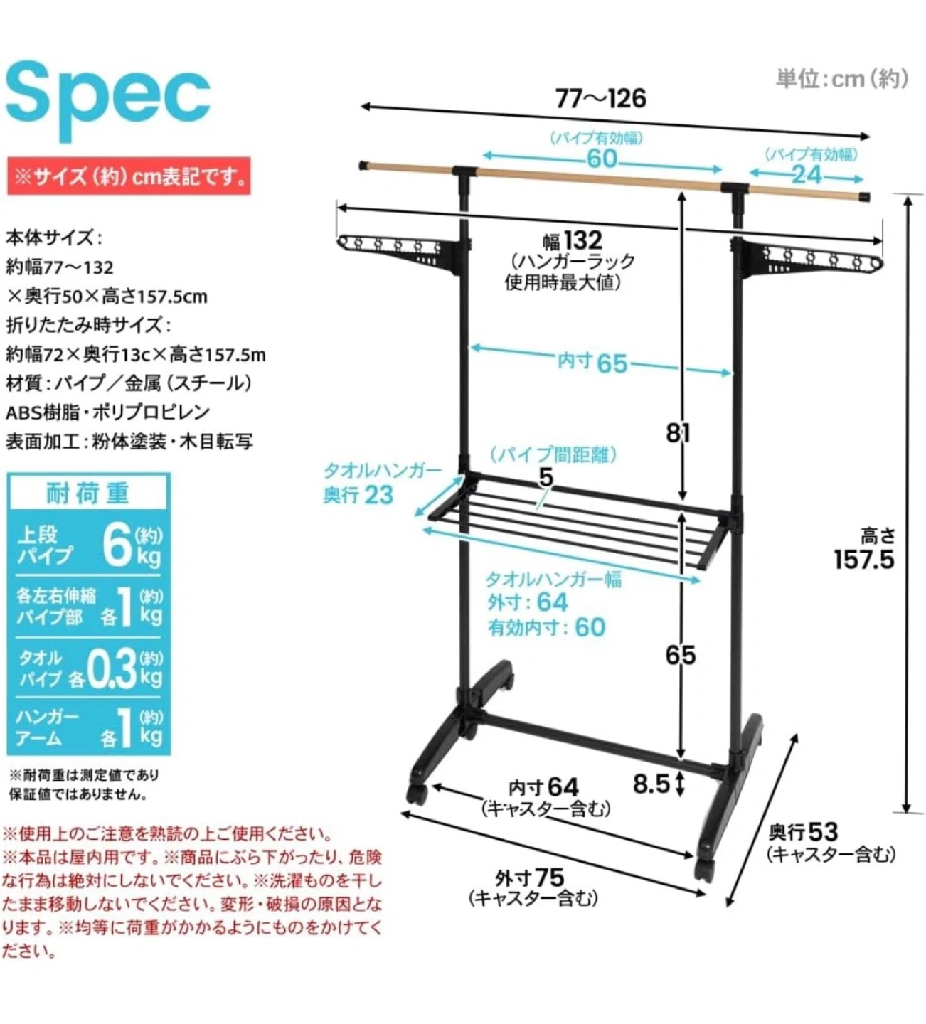 11月9日までです! 韓国に帰るので分けます 1年使いましたが新品のようにきれいです ハンガーラックです ・カラー:ブラック ・サイズ:約77~126cm x 50cm x 157.5cm ・材質:パイプ/金属(スチール), ABS樹脂, ポリプロピレン ・表面加工:粉体塗装, 木目転写 ・耐荷重:上段パイプ6kg、左右各伸縮パイプ部 各1kg、タオルパイプ0.3kg、ハンガーアーム 各1kg 中古品であることご了承ください 持ちやすく分解しても可能です 取引をご希望の場合はお知らせください