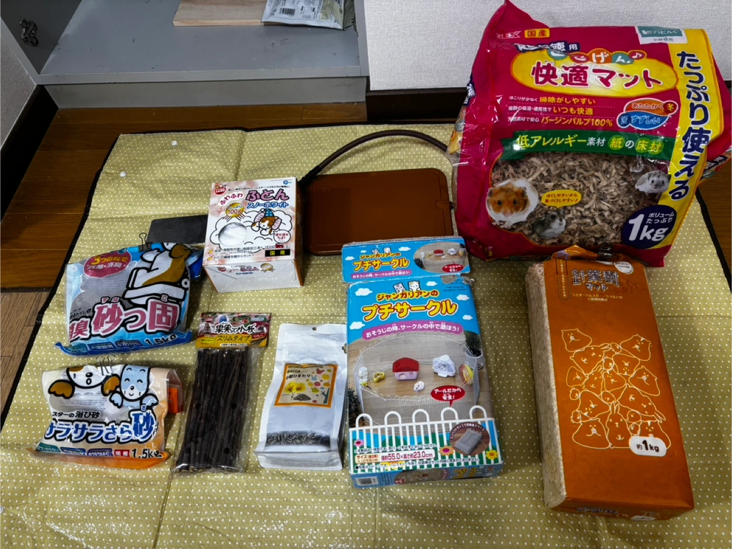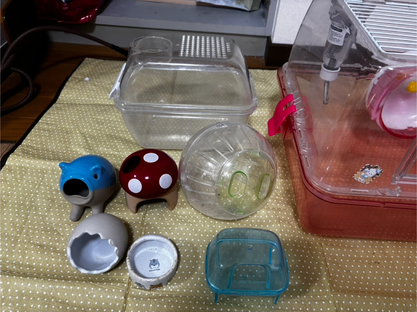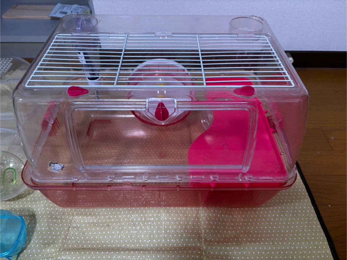 ハムスター用ケージと用品セットです。 ・ケージ本体 ・給水ボトル ・回し車(ケージ付属) ・移動ケース ・お風呂 ・お散歩ボール ・餌用皿 ・陶器のお部屋(たまご、きのこ、動物) ・砂(トイレ砂、お風呂砂、どちらも開封済み) ・おやつ ・マット ・ホットカーペット ・サークル ・かじる枝 ・綿 ・クッション材(紙) ・クッション材(針葉樹) 初めて飼いはじめるのに必要なものがそろっていると思います。 中古品であることをご了承ください。