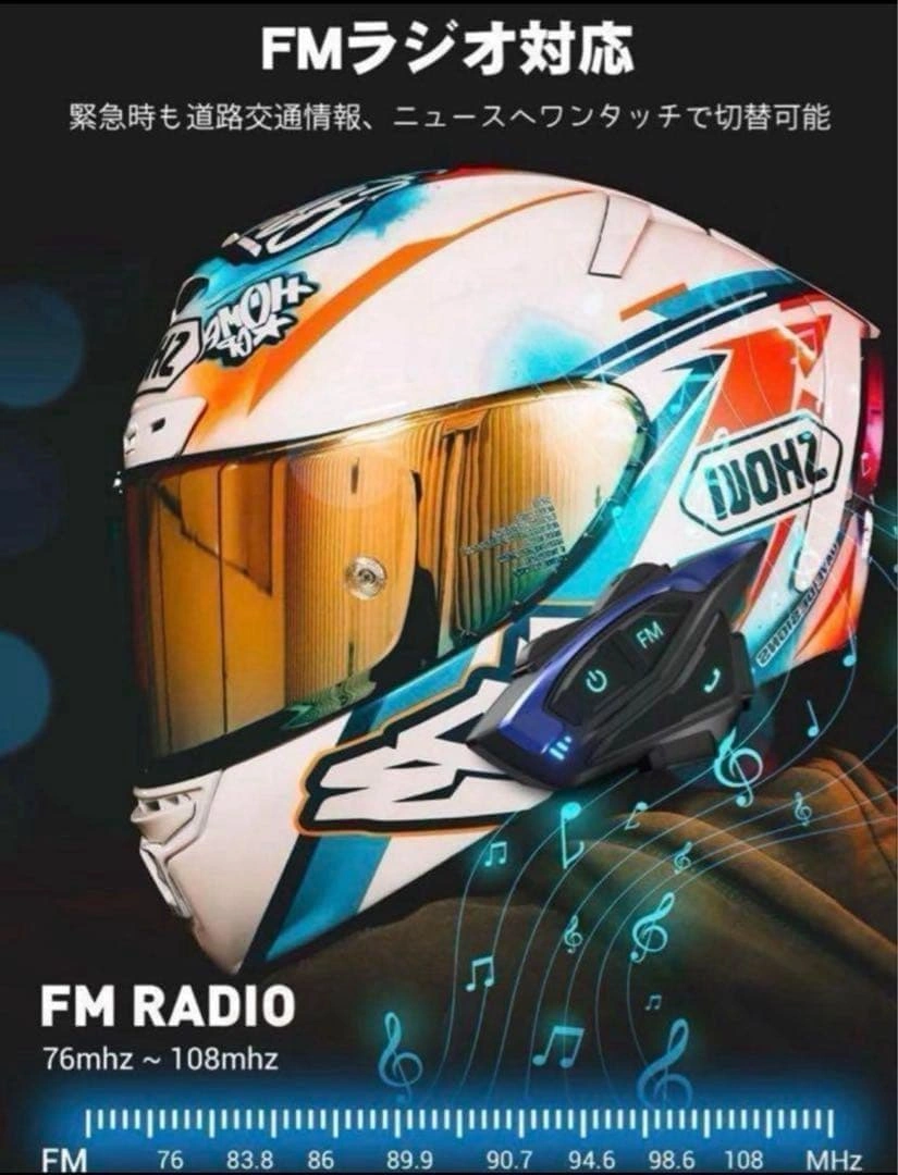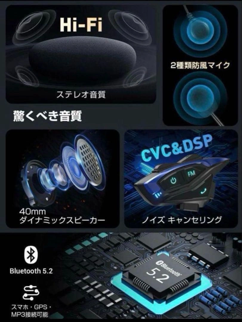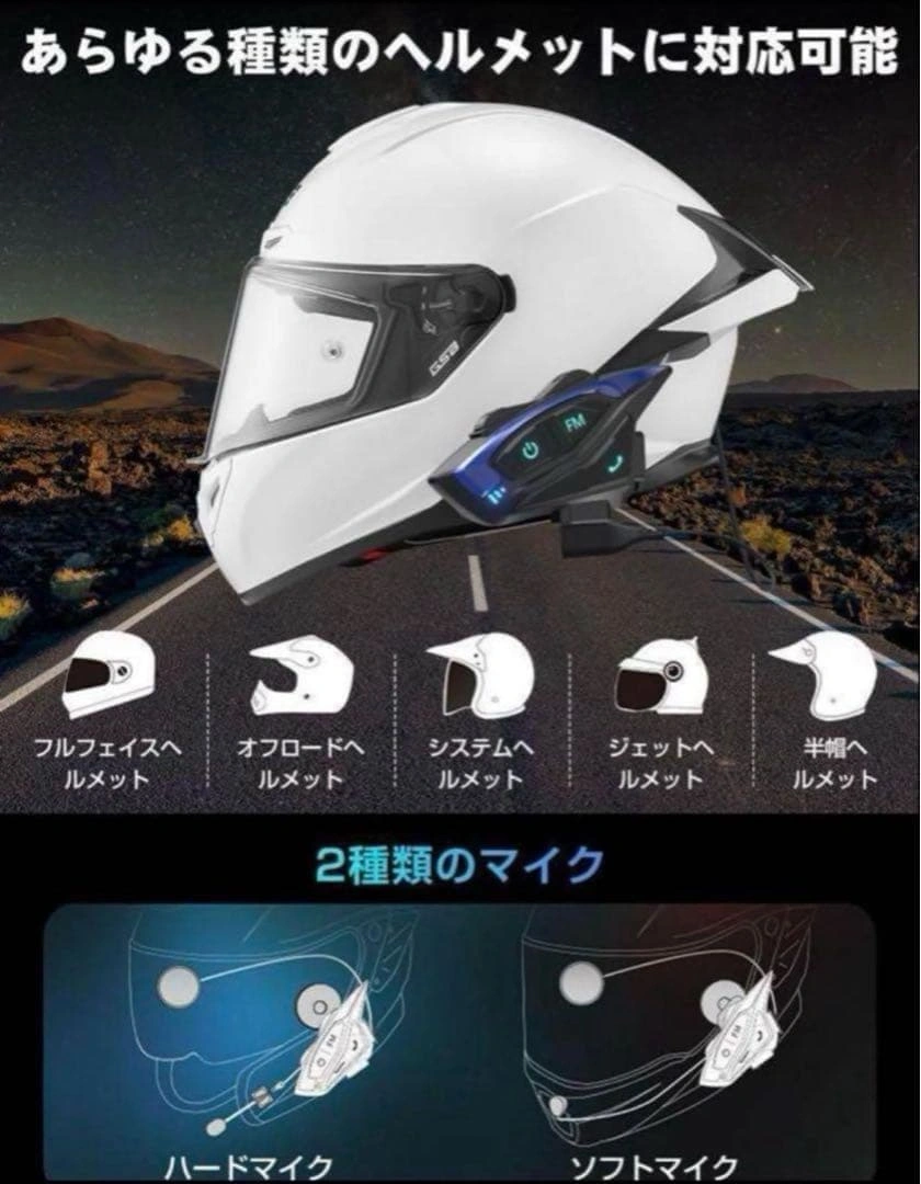 未使用品です(検品のため開封しています)。 【商品特徴】 ・Bluerooth5.3を搭載 ・DSPノイズ抑制テクノロジーを採用、CVCノイズキャンセリング機能付き ・瞬時にペアリング可能 ・2000mの長距離通話が可能 ・2人同時双方向会話 ・高速走行中も会話がクリア ・ユーザー間で音楽を共有可能 ・FMラジオ対応 ・日本語・英語・スペイン語に音声案内対応 ・スマートフォン、MP3やGPSレーダー転送 ・音声起動 ・10秒で自動応答、通話自動復帰機能 ・ノイズキャンセリングマイク ・Blueroothで2台同時接続可能 ・120km/hでの音声通信に対応 ・直径40mmのスピーカーで高音質 ・IP67相当の防塵防水仕様 ・1500mAhの大容量バッテリー、満充電で連続通話時間:約20h、最大音楽再生時間:約33h、最大待機時間:約500h(使用状況により異なります) ・ユニバーサルインカム機能(他社製インターカムとの通話が可能) ※日本語説明書添付 ご希望の方はお気軽にご連絡ください。