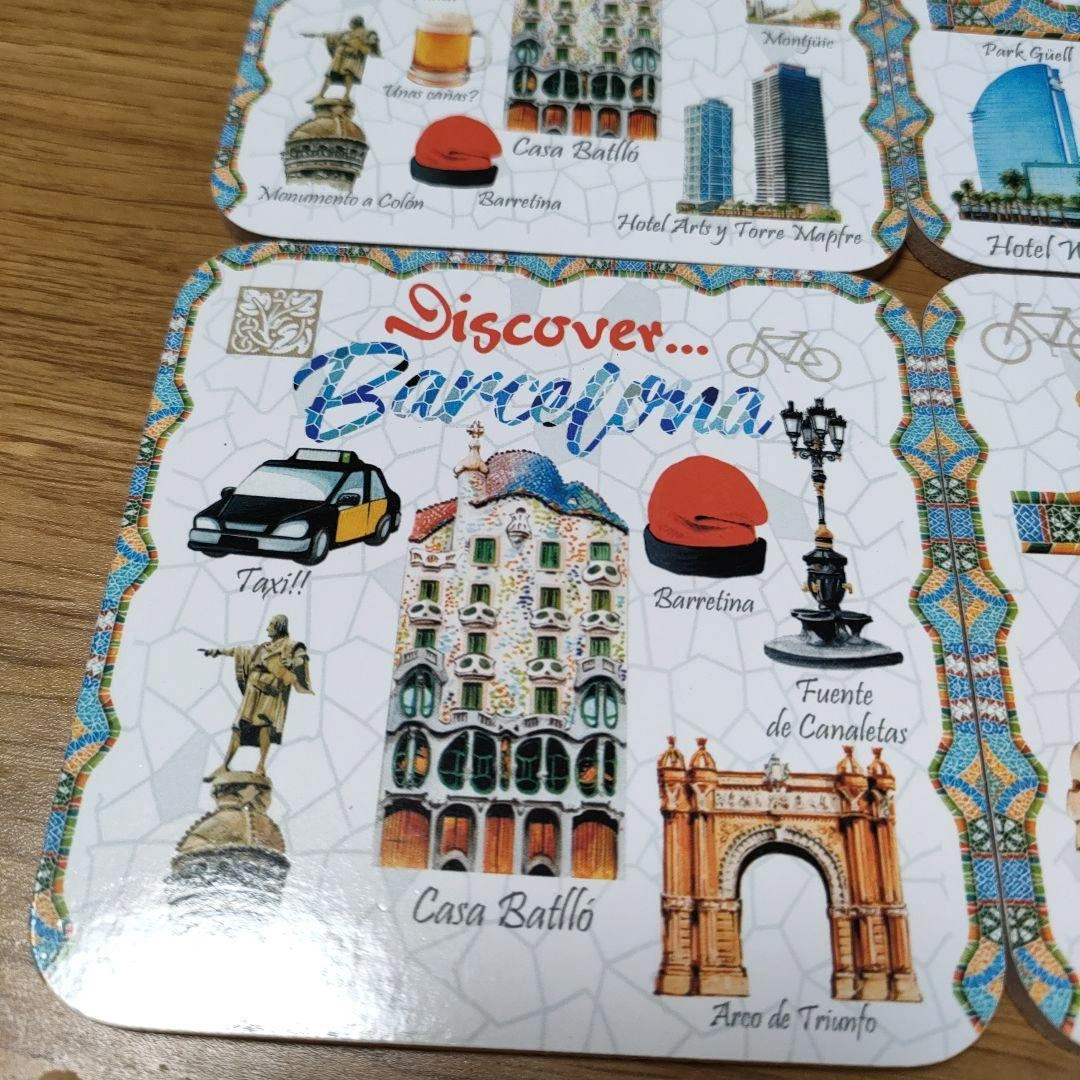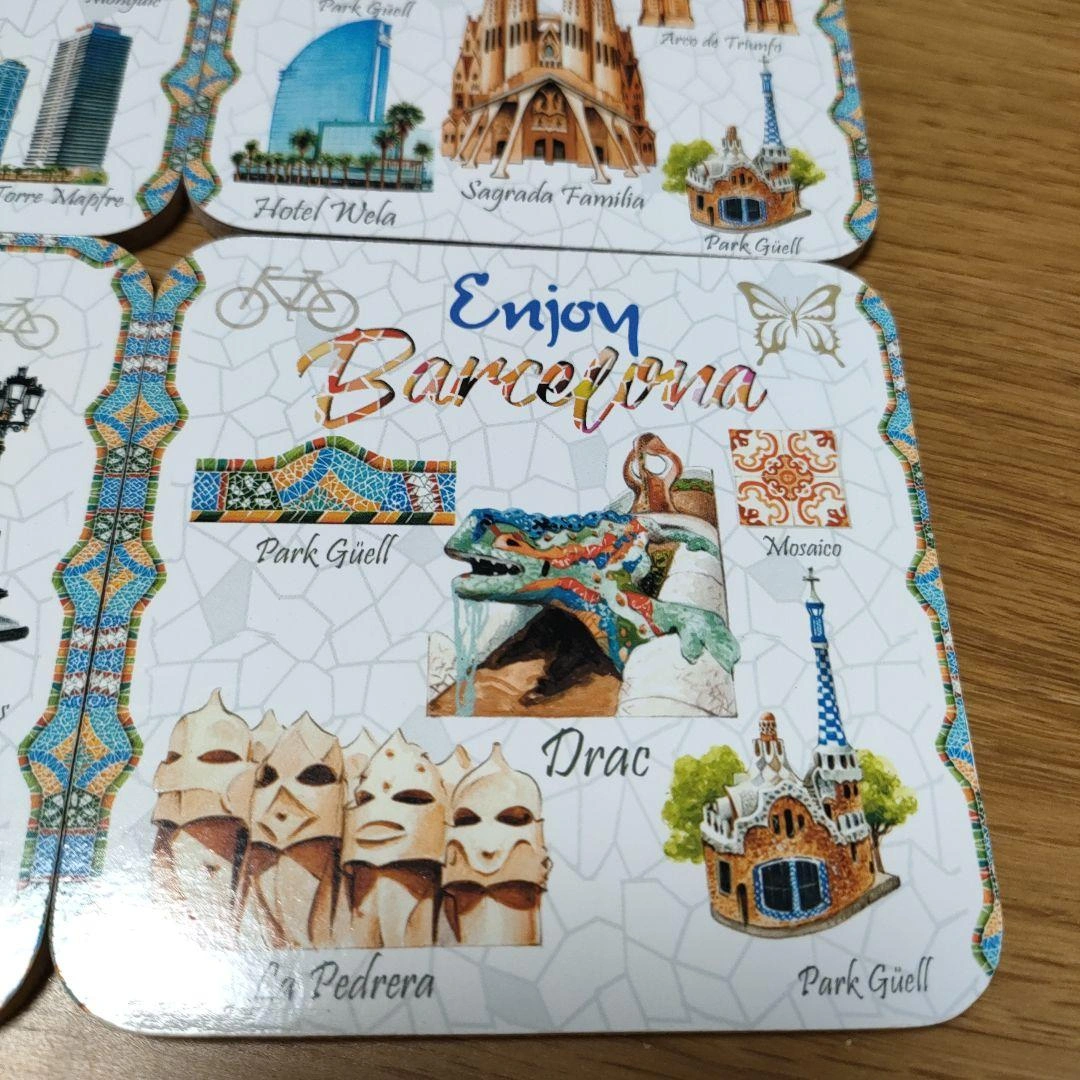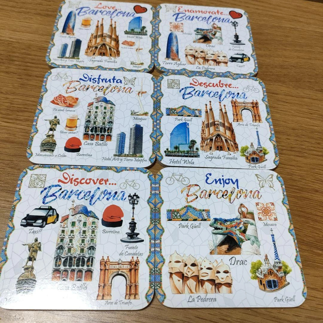 バルセロナの名所を描いたコースター6枚セットです。 - デザイン: バルセロナの名所や文化を描いたイラスト - 数量: 6枚セット - サイズ: 約9cm x 9cm ご覧いただきありがとうございます。 未使用ですが、自宅で長期間保管していました。 コースター自体は綺麗ですが、ケースに破けと軽度汚れが見られます。 中古品であり、上記の状態でも気になさらない方にご検討よろしくお願い致します。