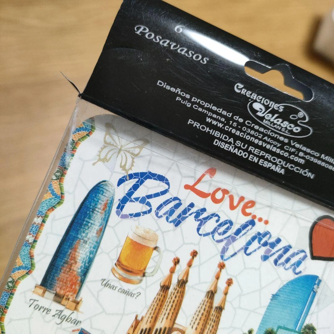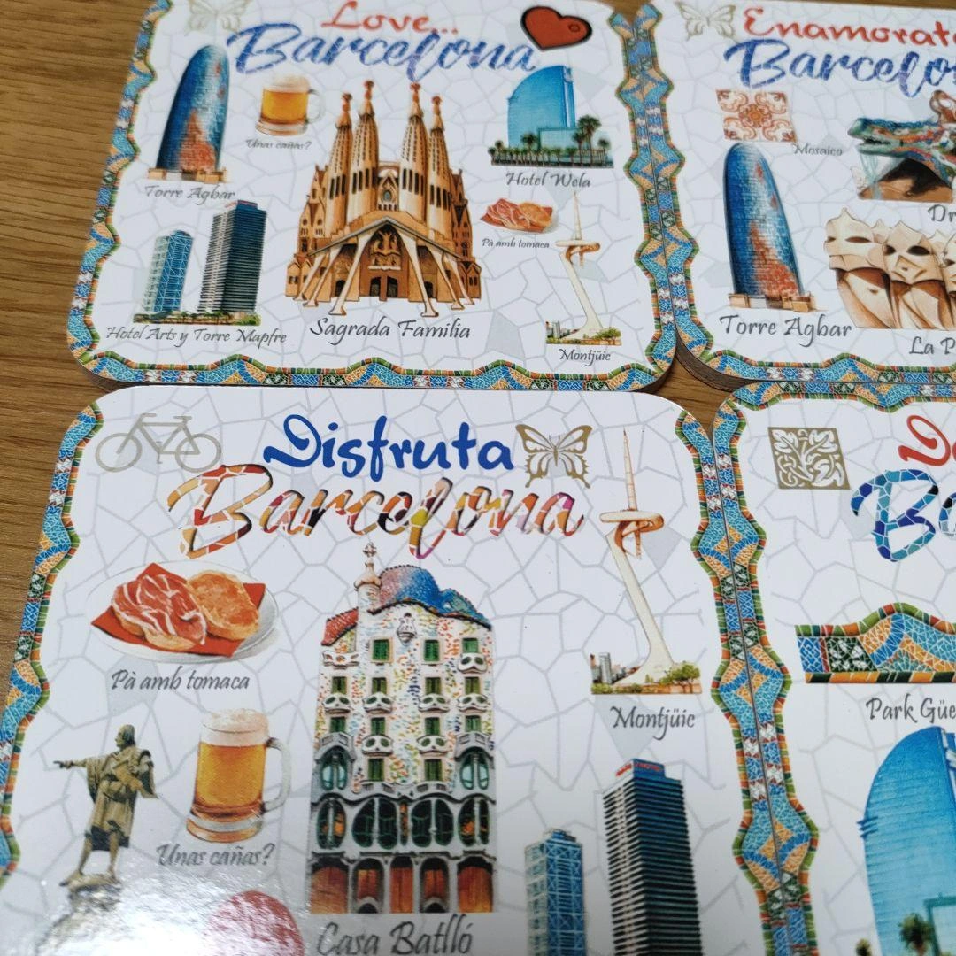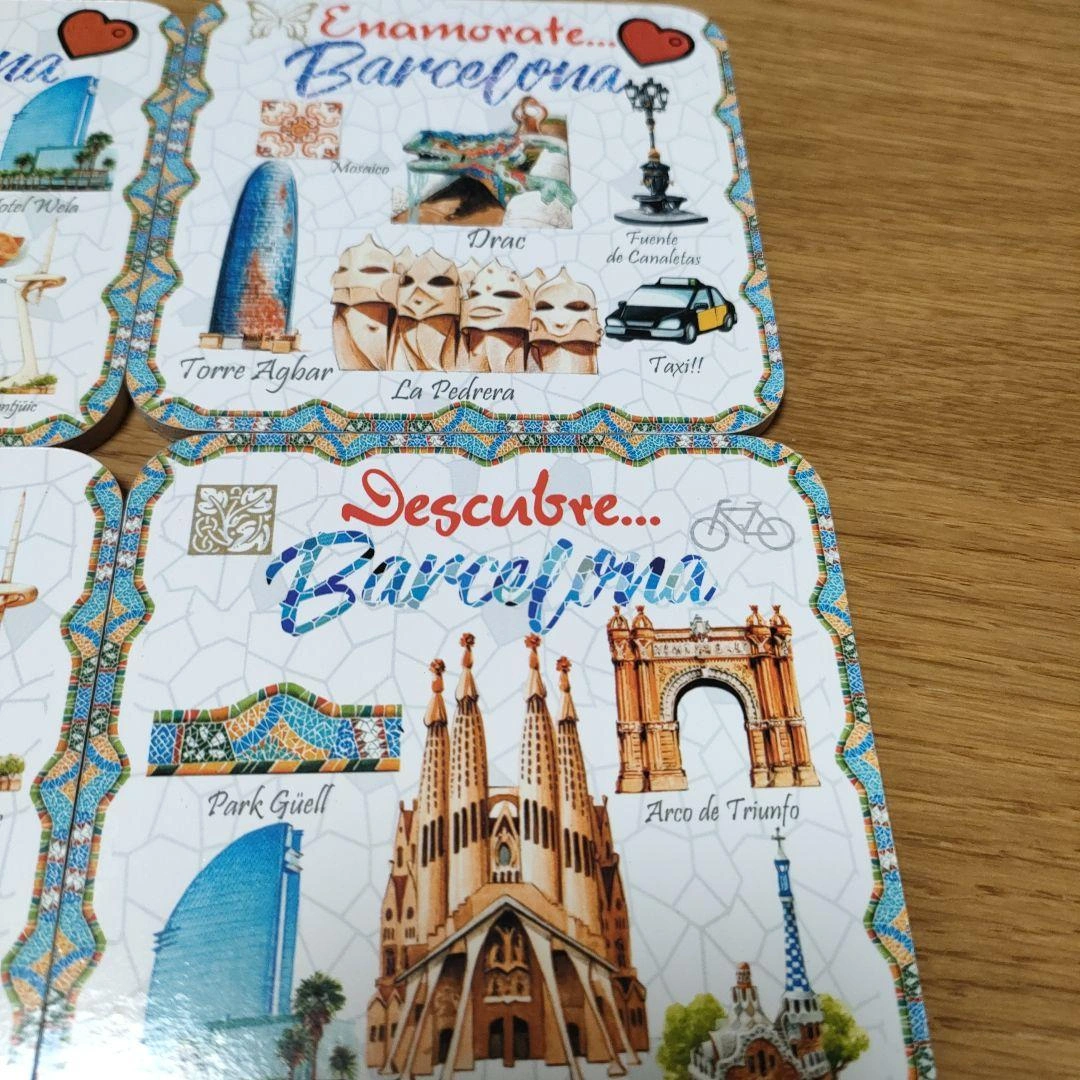 バルセロナの名所を描いたコースター6枚セットです。 - デザイン: バルセロナの名所や文化を描いたイラスト - 数量: 6枚セット - サイズ: 約9cm x 9cm ご覧いただきありがとうございます。 未使用ですが、自宅で長期間保管していました。 コースター自体は綺麗ですが、ケースに破けと軽度汚れが見られます。 中古品であり、上記の状態でも気になさらない方にご検討よろしくお願い致します。