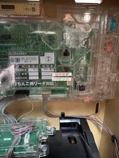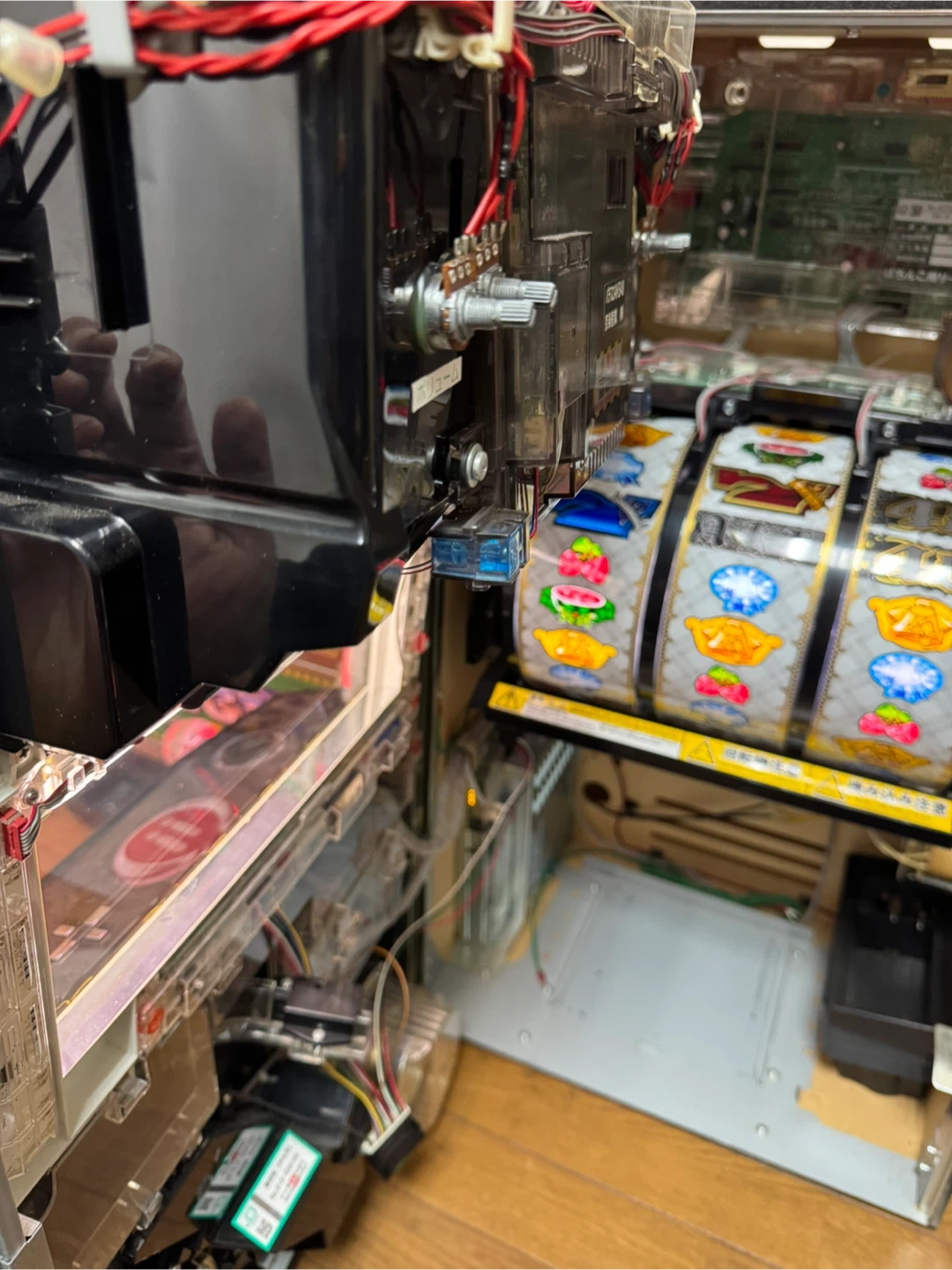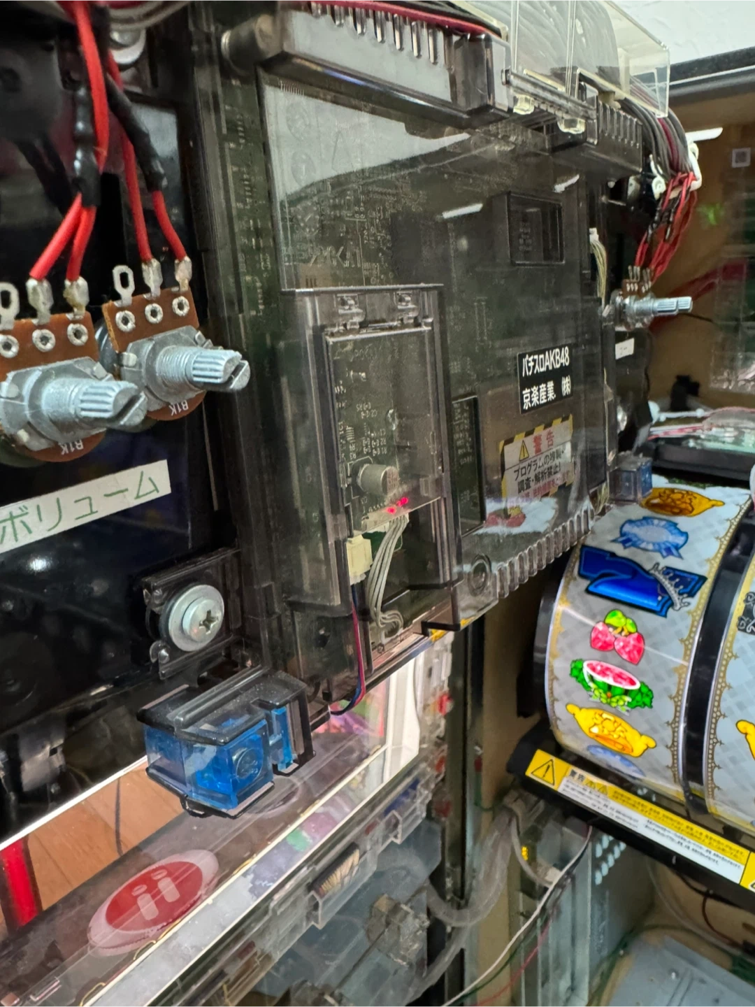 ご覧いただきありがとうございます。 『ぱちスロAKB48』です。 京楽産業から2013年7月に導入された初代機種です。 ボーナス(疑似ボーナス)とART(アシストリプレイタイム)で構成されるART機(5号機)で、1Gあたりの純増は約2.0枚です ゲーム性: 通常時は疑似ボーナスを目指し、ボーナス中にART当選を抽選 ART「神曲RUSH」中は、レア役などでゲーム数上乗せや疑似ボーナスが抽選されます ボーナス: 「会いたかった48」(ART確定)、「神曲RUSH選抜BONUS」(ART期待度約55%)など、ART期待度の異なる複数の疑似ボーナスが搭載されてます こちらのスロット台は中古で購入したお品物ですが、1時間ほど打ち込みをして『役物、ライト、音、動作』確認しております。 コイン不要機の為、ホッパーは取り外してます。 また、通常コイン不要機は1枚BETボタンを押す事でcredit持ちメダルを50枚まで増やしますが、こちらのスロット台は払い出し口から配線を引き出しております。 赤いボタンを一回押すとcreditが一枚追加され、長押しするとMAX50枚まで溜まります。ボタンは写真にてご確認ください。 正面は目立った傷汚れはございませんが、天板に大きな色ハゲがございます。 100V電源の為、変圧器などは必要ございません。 コイン不要機ですのでメダルは必要ございません。 家庭仕様になっております。 ドアキーは流通キーで開閉します。 ご購入いただいた方には、流通キーと設定キーをそれぞれ一つお付け致します。 それ以外の付属品はございません。 自車配送可能です。お気軽にお問い合わせください。