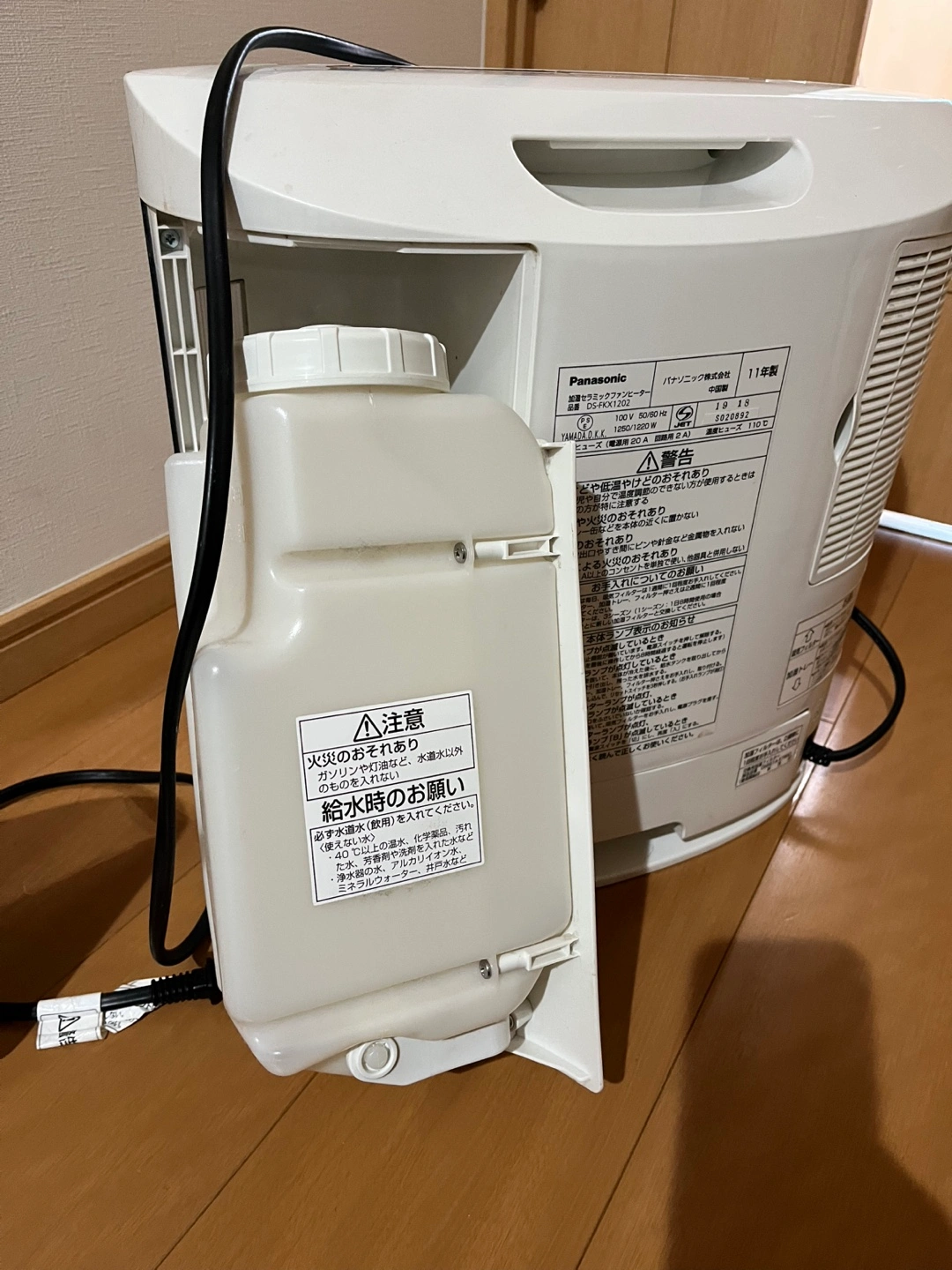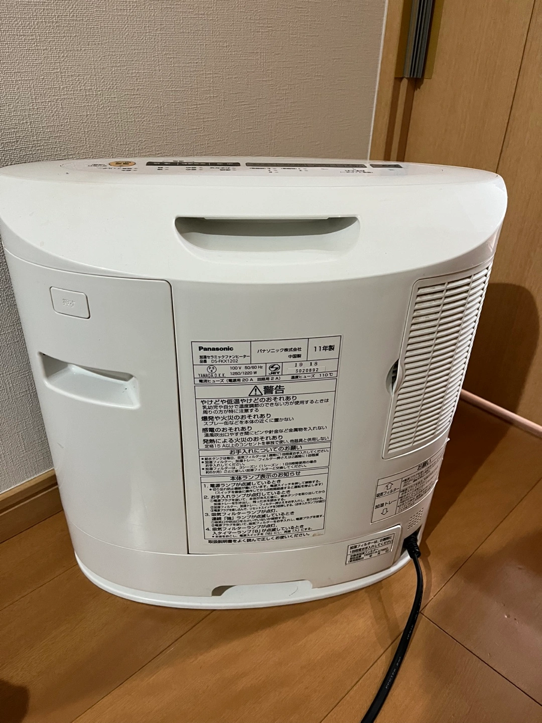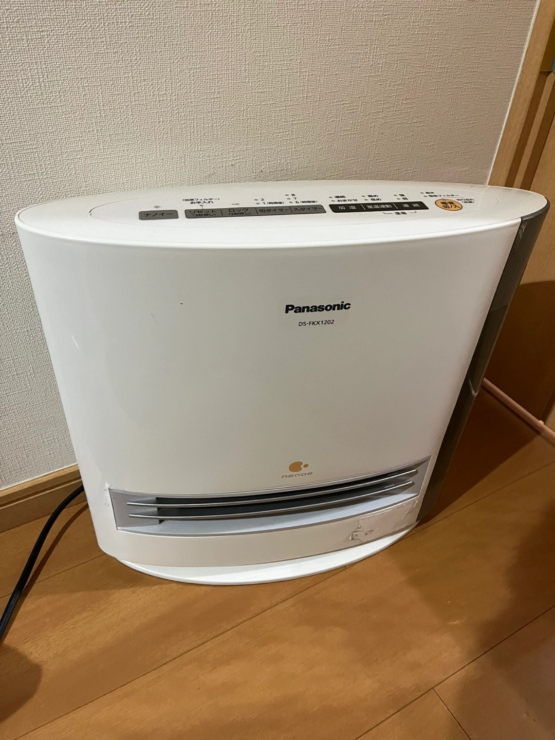 6月末頃までの出品になります。 宮前平駅近くの自宅まで引き取りいただける方、 よろしくお願いいたします。 パナソニックの加湿機能付きセラミックファンヒーター「DS-FKX1202」です。 問題なく使えるのですが、新しいものに買い替えたためこちらは暗所で保管していました。 冬のみ3シーズンくらいは使っていました。 【情報】 ブランド:パナソニック 型番:DS-FKX1202 年式:11年製 【仕様】 電源:100V 50/60Hz 消費電力:1250/1220W この製品に関する主な特徴は以下の通りです。 ナノイー美容: ナノイー技術により、うるおいのある美肌効果が期待できます。 暖かうるおい温風: 本格的な加湿機能(600ml/h)を備え、暖かくうるおいのある温風を送ります。 室温連動温風機能: 室温に合わせて2段階で温風を調整し、かしこく節電できます。 チャイルドロック機能: お子様がいる家庭でも安心して使えるチャイルドロック機能を搭載しています。 簡単給水: タンクはワンアクションで取り出し可能で、給水が簡単です。