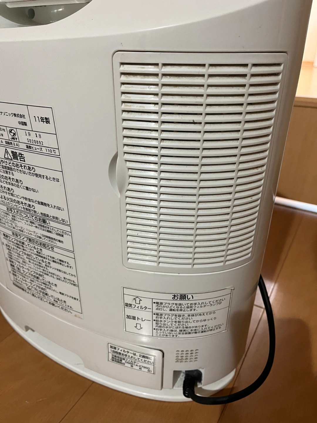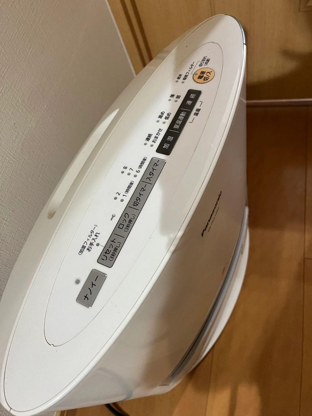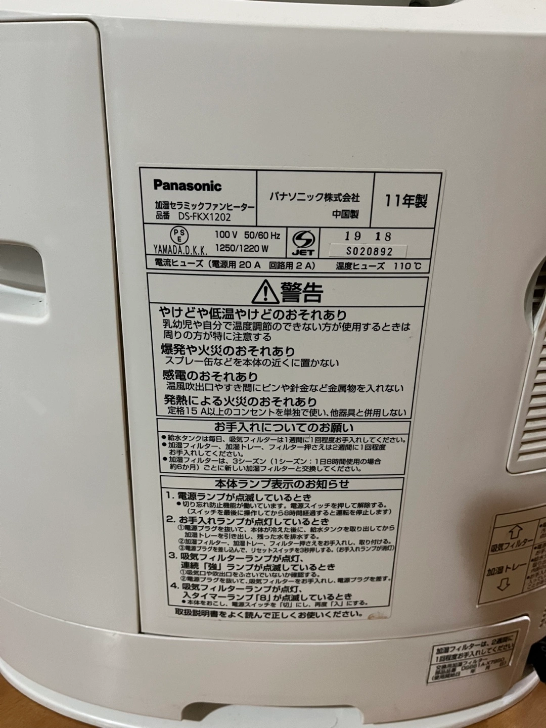 6月末頃までの出品になります。 宮前平駅近くの自宅まで引き取りいただける方、 よろしくお願いいたします。 パナソニックの加湿機能付きセラミックファンヒーター「DS-FKX1202」です。 問題なく使えるのですが、新しいものに買い替えたためこちらは暗所で保管していました。 冬のみ3シーズンくらいは使っていました。 【情報】 ブランド:パナソニック 型番:DS-FKX1202 年式:11年製 【仕様】 電源:100V 50/60Hz 消費電力:1250/1220W この製品に関する主な特徴は以下の通りです。 ナノイー美容: ナノイー技術により、うるおいのある美肌効果が期待できます。 暖かうるおい温風: 本格的な加湿機能(600ml/h)を備え、暖かくうるおいのある温風を送ります。 室温連動温風機能: 室温に合わせて2段階で温風を調整し、かしこく節電できます。 チャイルドロック機能: お子様がいる家庭でも安心して使えるチャイルドロック機能を搭載しています。 簡単給水: タンクはワンアクションで取り出し可能で、給水が簡単です。