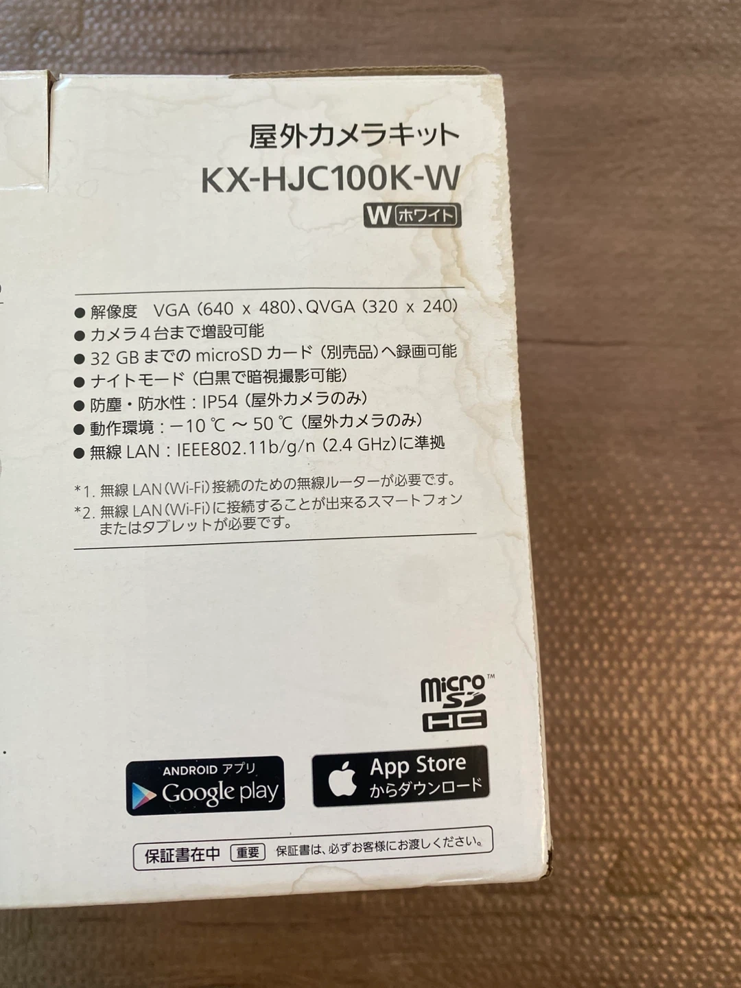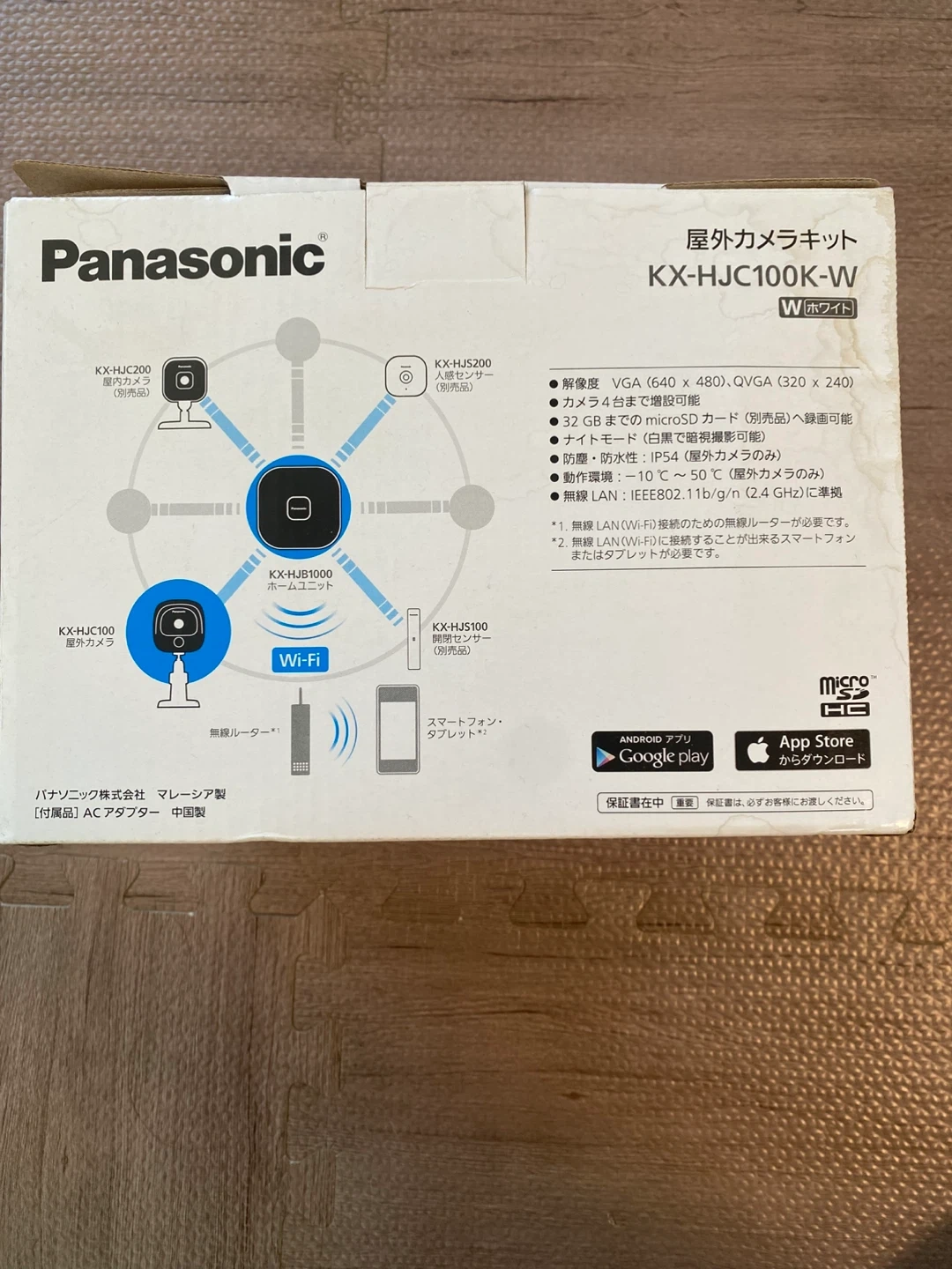 パナソニックの屋外カメラキットです。 【情報】 ブランド:パナソニック 型番:KX-HJC100K-W 【仕様】 ・解像度:VGA(640 x 480)、QVGA(320 x 240) ・カメラ4台まで増設可能 ・32 GBまでのmicroSDカードへ録画可能 ・ナイトモード(白黒で照視撮影可能) ・防水・防塵性:IP54(屋外カメラのみ) ・動作環境:-10℃~50℃(屋外カメラのみ) ・無線LAN:IEEE802.11b/g/n(2.4 GHz)に準拠 未使用です。 かなり前に購入しましたが一度も使用 しませんでした。 外箱はかなり汚れています。 保証書はありますが、 購入から1年経っており、 保証期間外となります。 中古品につき、上記内容をご理解頂ける方のみ 宜しくお願い申し上げます。