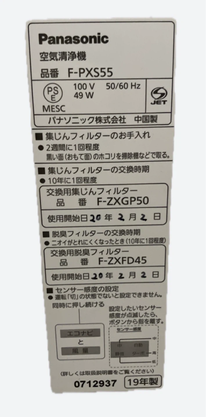 パナソニックの空気清浄機です。 【情報】 購入時2020年 ブランド:パナソニック 型番:F-PX55S 年式:19年製 外形寸法(高さ×幅×奥行) 580×300×195mm(+脚部10mm) 【状態】 ・動作確認済み。 ・2年程冬に使用、以後使用せず自宅保管していました。小傷はありますが大きく目立つ傷はありません。 ・紙媒体の説明書はございません。ネットからダウンロードでご覧いただけます。 ・出品にあたり、表面・中のフィルター等を掃除しましたが素人なのでご容赦ください。 ・完全中古品であることのご理解ご了承お願いいたします。 【その他】 本体をビニール袋に入れ、強度の高い紙袋に入れてお渡しさせていただきます。 何かありましたらお気軽にご連絡ください。