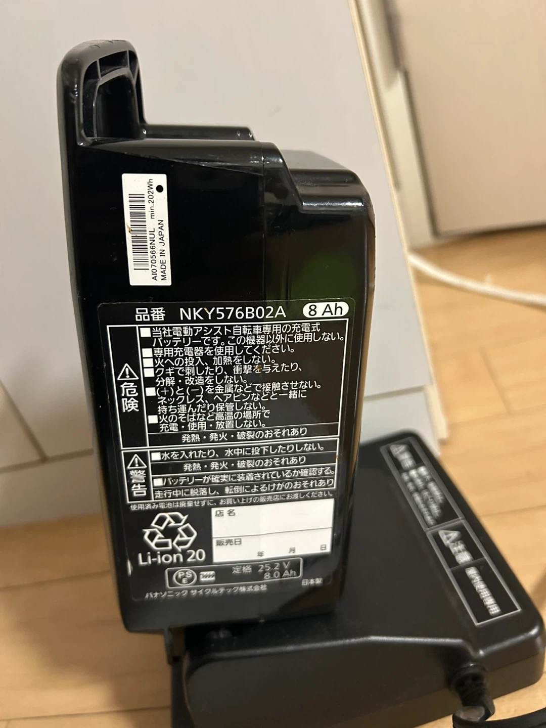 パナソニックの電動アシスト自転車用バッテリーです。 【情報】 ブランド:パナソニック 型番:NKY576B02A 容量:8Ah パナソニックの電動自転車用バッテリーNKY576B02A,25.2V 8.0Ahなります。 重さは約2.1kgです。 あくまで目安ですが問題なく使用可能です。 説明書あり、保証書あり、 充電器付きです。 22年11月に購入し、一年半ぐらい保管しました. 問題なく充電できたので済です。 普段の生活で十分使用可能です。 中古品であることをご了承ください。