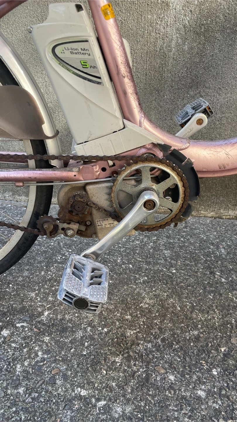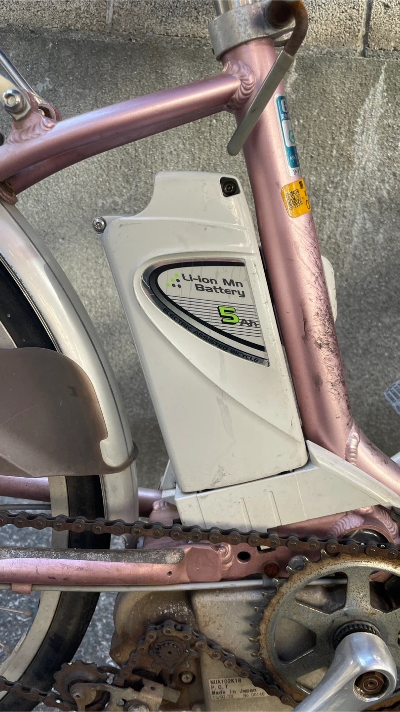 パナソニックの電動アシスト自転車です。 ・色:ピンク ・5Ah リチウムイオンバッテリー搭載 ・前カゴ付き ・BAA(自転車協会認証)マークあり ・全体的に使用感、傷、錆あり 中古品であることをご了承ください。 かなり傷んでいますが、まだまだ乗れます。 チェーンカバーがないので洋服の裾の巻き込みにご注意ください。 引越しに伴い、引越し先に駐輪場の確保ができなかった為出品します。