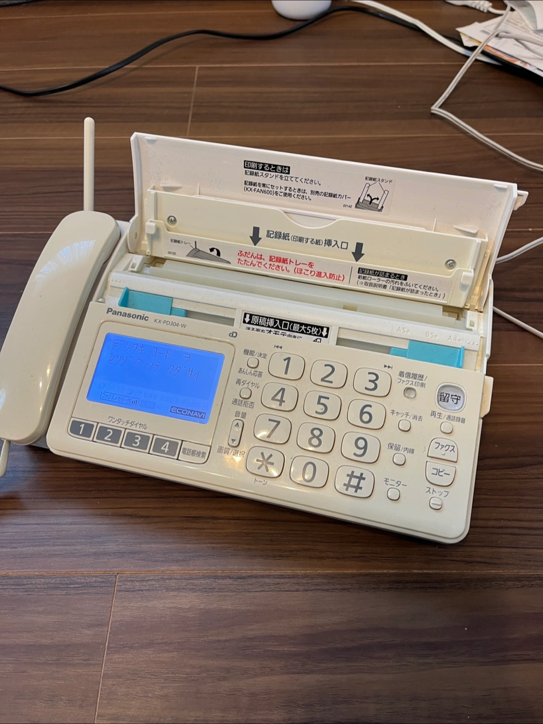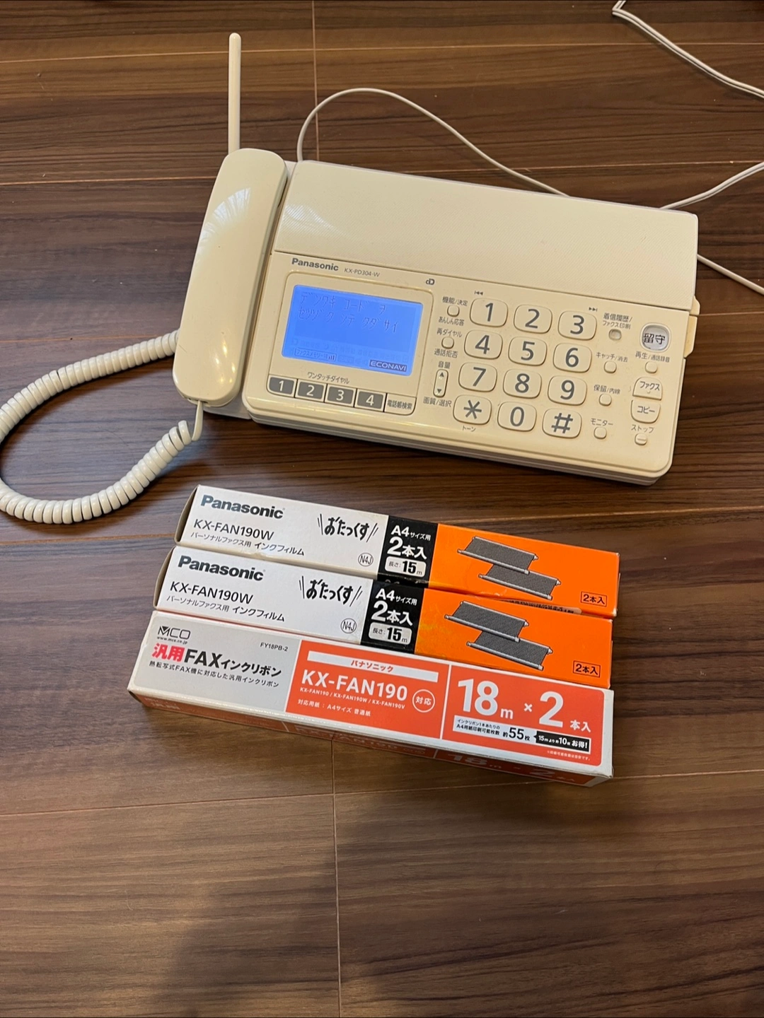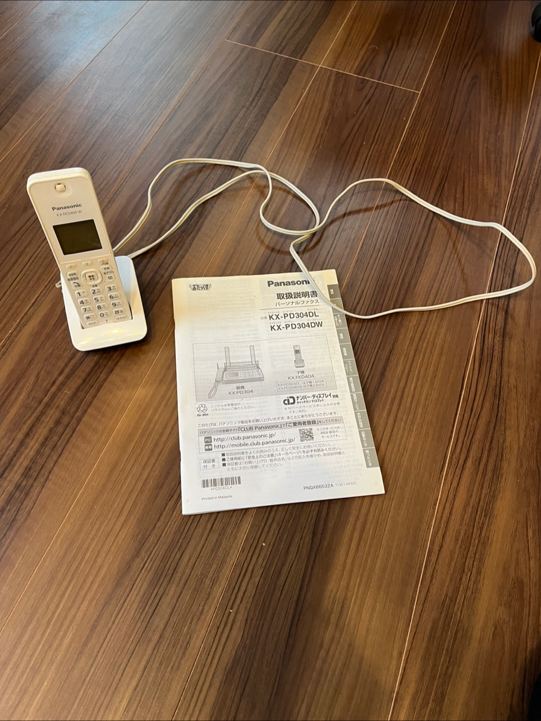 【情報】 ブランド:パナソニック 型番:KX-PD304-W 種類:FAX カラー:ホワイト 【状態】 使用感あり 【付属品】 説明書、インクリボン KX-PD304DL 親機1台、子機1台、取扱説明書、 新品のファックス用インクリボンもお付けします。 3年ほど使いました。 問題なく使えていましたが、 引っ越しに伴い手放したく出品します。 子機は充電がうまくされないかもしれず、充電池の交換が必要かもしれません。