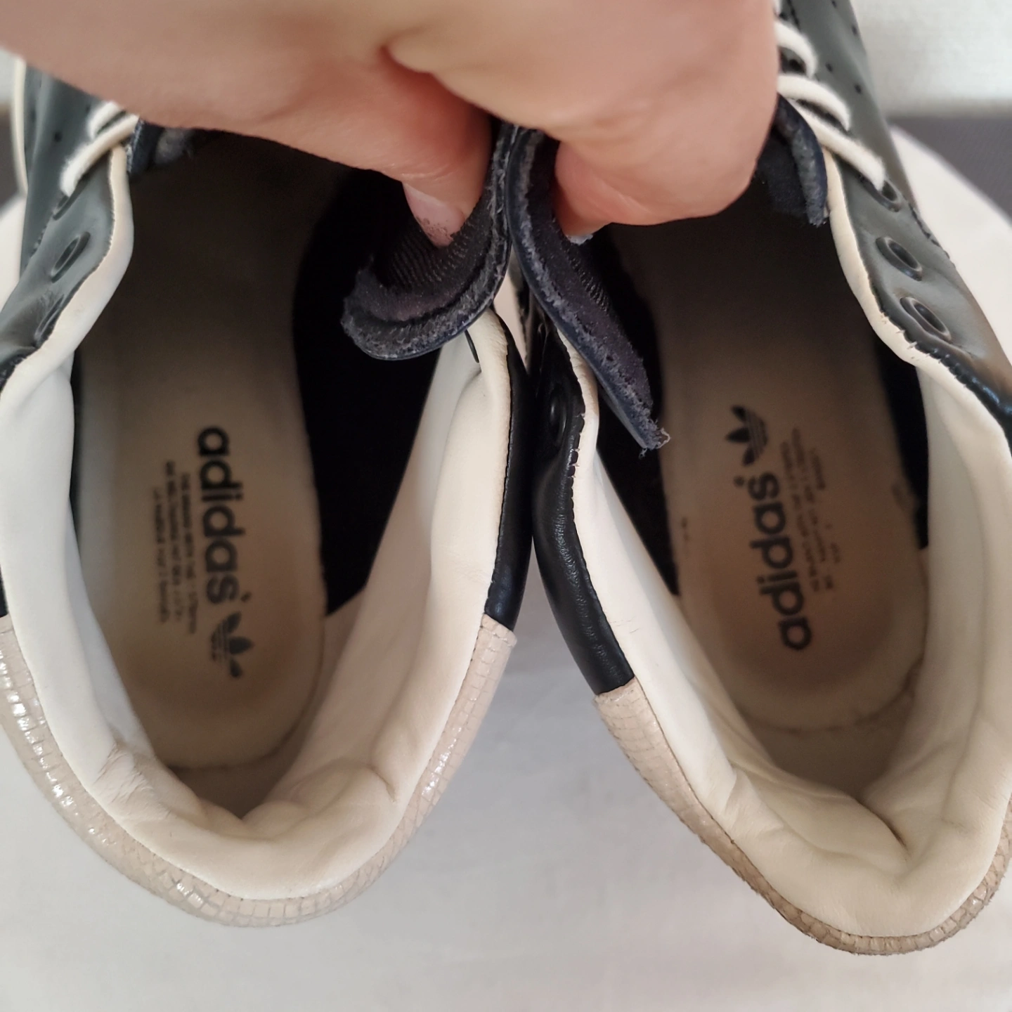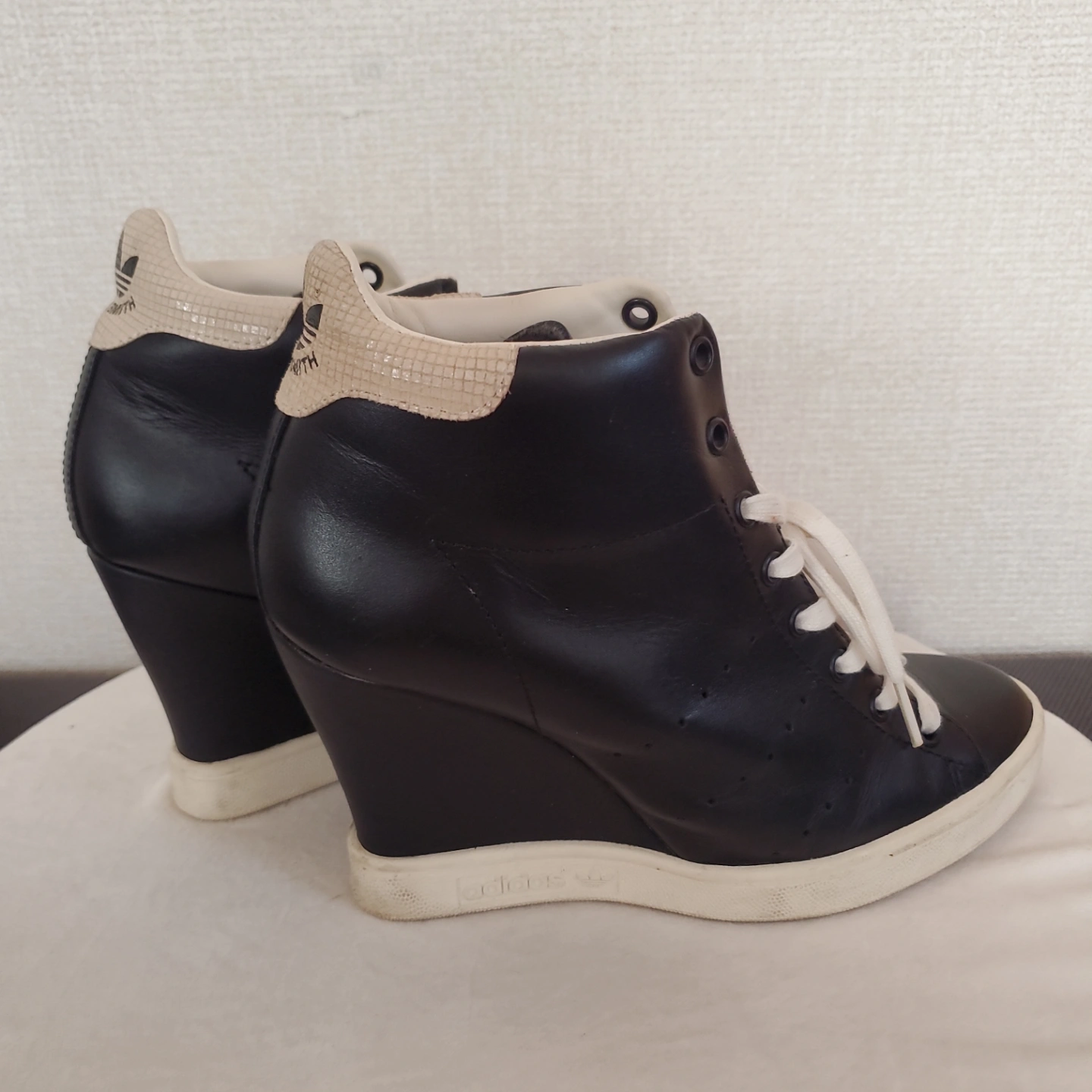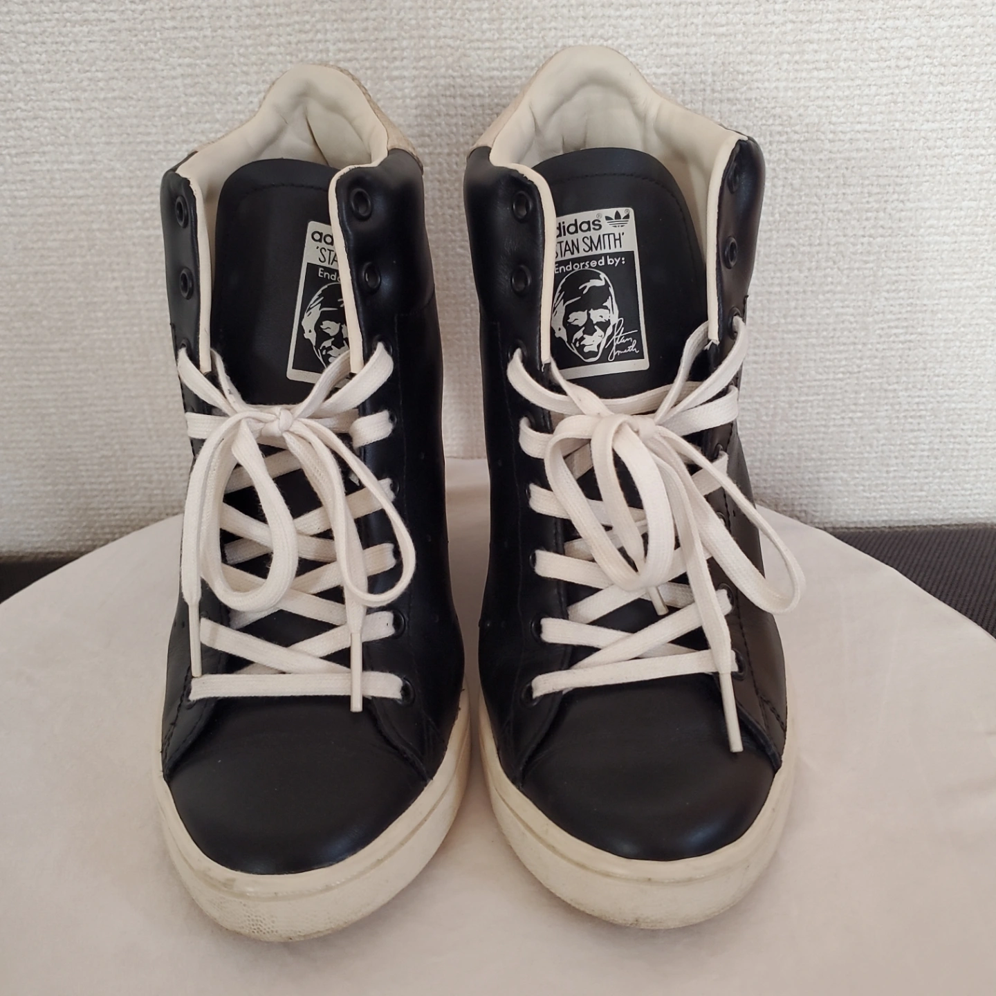 アディダス オリジナルス スタンスミス アップ ヒール ブラック 25cm ヒール付きなので、履 くと脚長効果があります。 カッコイイデザインですが、キレイ目にも合わせやすい配色です。オシャレさんにおすすめദി ᷇ᵕ ᷆ )♡ ※あくまでもUSEDですから、神経質な方はご遠慮下さい ※ノークレーム、ノーリターンでお願いします ※購入時の箱はありません ■サイズ:25cm ■ヒール高さ:約8-9cm ■色:ブラック ■定価:22,000円 ■ホームベージ引用文: “スタンスミス”が生んだガーリーなウェッジヒールデザインの「スタンスミスUP」 滑らかなレザーアッパーを使用しヒールにはつやのある格子柄のレザーパッチをあしらい、パンチング加工のスリーストライプス、ラバーカップソールを備えた一足です。