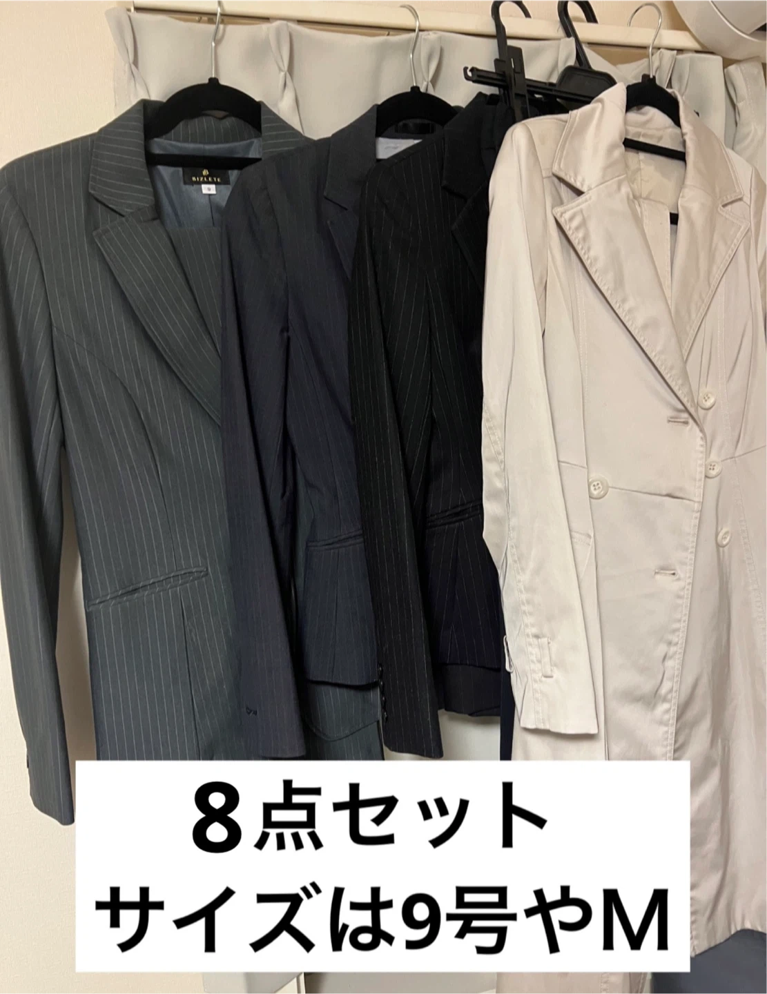 レディーススーツのセットです。 ・5点セット ・サイズは9号やMサイズ相当 ・ブランド:BIZLETE(ビズレテ)、INED(イネド)、Perfect Suit Factory(パーフェクトスーツファクトリー)など ・グレー系、黒系のストライプ柄 7号、9号、Mサイズ 引っ越しの断捨離のため、まとめてとなります。 ※身長156cmで着てました。 1点目画像2枚目 上9号 パンツ ウェスト64cm 股下72cm 2点目画像4枚目 上7号 スカートM ウエスト平置き36cm 丈 50cm 3点目 画像6枚目 上9号 ウエスト平置き35cm 丈51cm 4点目画像9点目 トレンチコート サイズ36号 丈98cm 5点目画像10枚目 パンツ サイズS ウエスト58cm 丈92cm セットで5点ですが、単品で8点! 中古品であることをご了承ください。