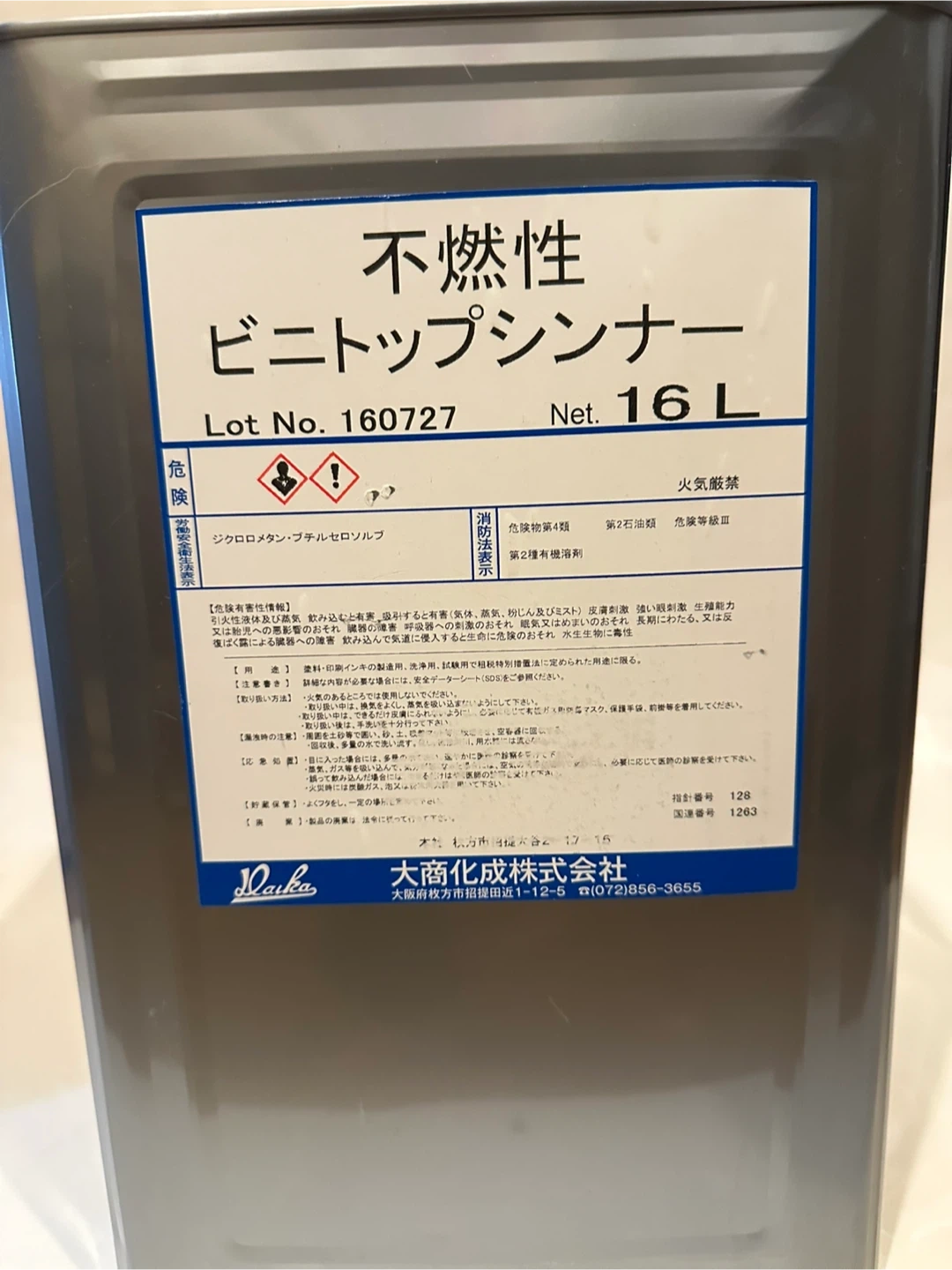 不燃性 ビニトップシンナー 16L 【情報】 • ブランド:大商化成株式会社 • 容量:16L (2缶ございます) • 品名:不燃性 ビニトップシンナー 【状態】 2017年に帽子用のノリの薄め液として購入したものですが、8年が経過し、少し茶色く変色してしまったため、制作には使用できなくなりました。 処分に困っており、必要な方にお譲りできればと思います。 16L缶が2缶あります。 濃い色の薄め液としてや、塗料落としなどにはまだ使用可能かと思います。 お試し用に少量でのお渡しも可能です。 【取り扱い方法】 • 火気の近くでは使用しないでください。 • 使用時は必ず換気を良くし、蒸気を吸い込まないようご注意ください。 • 皮膚に触れないようにしてください。 • マスク・保護手袋・前掛け等を着用して作業してください。 #シンナー #薄め液 #ペンキ #塗料 #塗料落とし