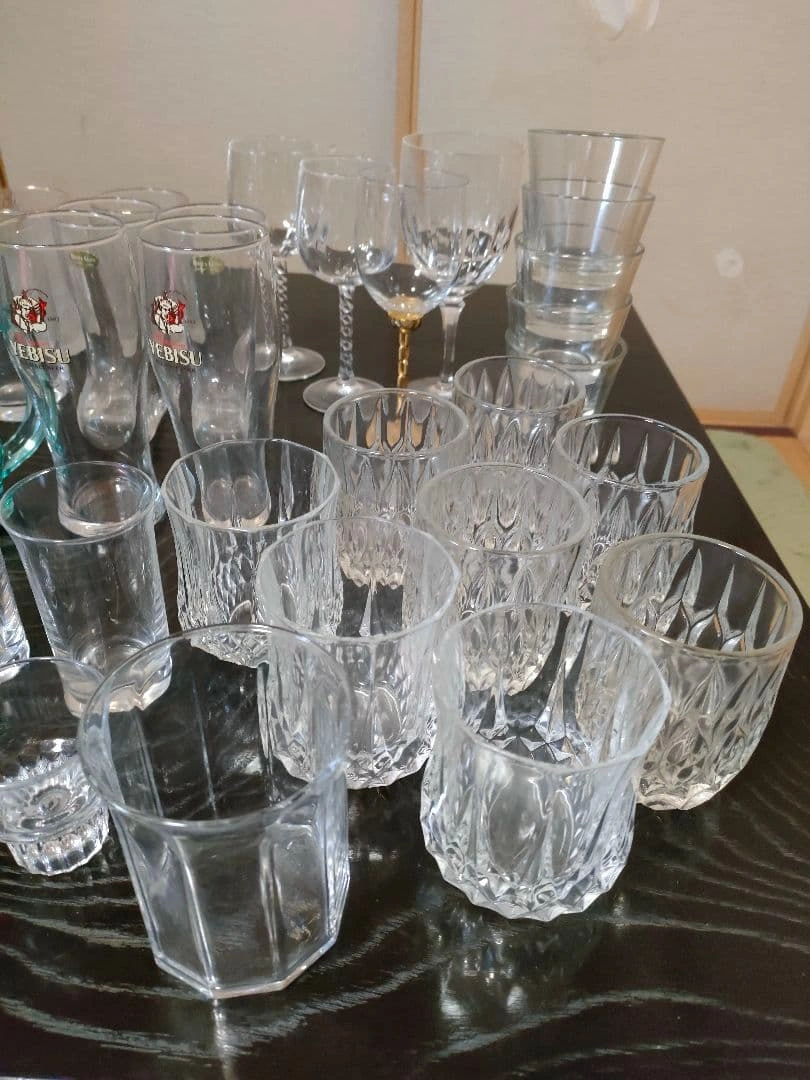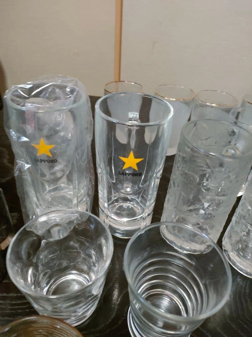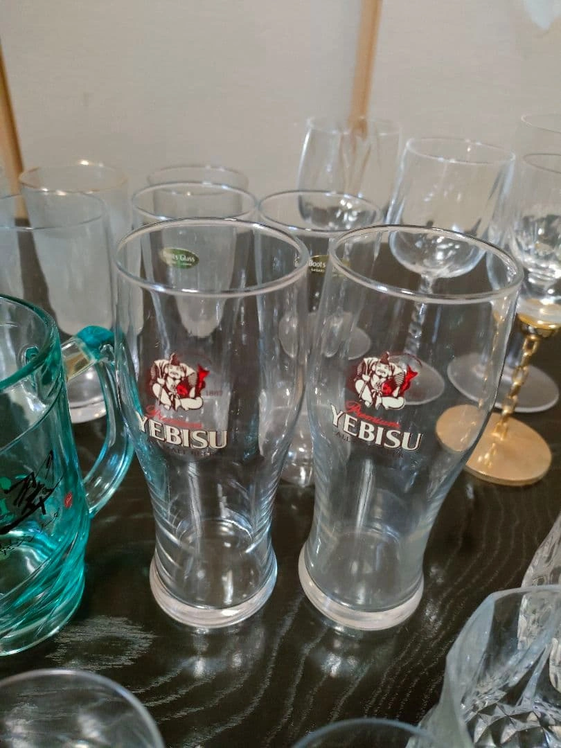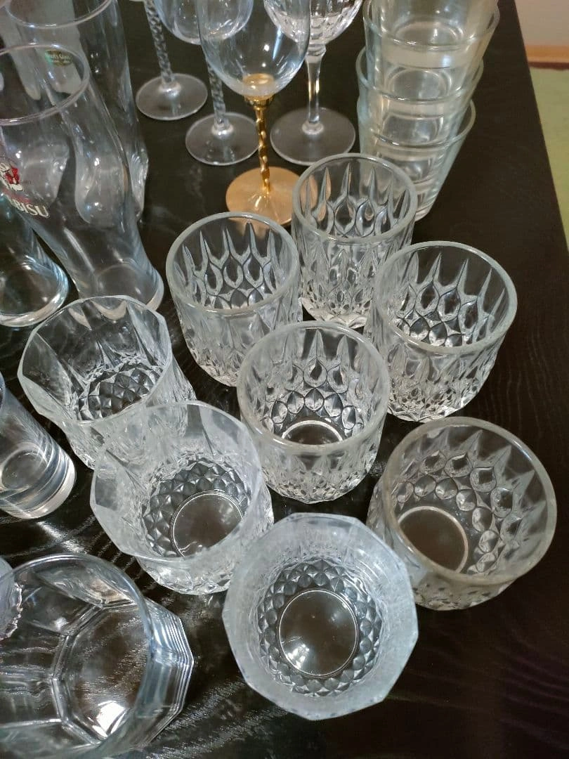 ビールジョッキ、ワイングラス、ウイスキーグラス、ぐい呑み等、大量の晩酌セットをまとめ売りします。 ビールジョッキ×5 ビールグラス×2 ワイングラス×4 ウイスキーグラス×9 耐熱グラス×2 ぐい呑み・お猪口×11 ヴィンテージグラス×3 等、50点以上あります。 状態は新品未開封〜使用感あるものまで様々です。 大量にあり、素人検品の自宅保管品のため、 多少の汚れ、小傷などの状態やわかりづらい程度の見落とし等はご理解いただける方のご購入をお願いいたします。 ご希望の方はお気軽にご連絡ください。