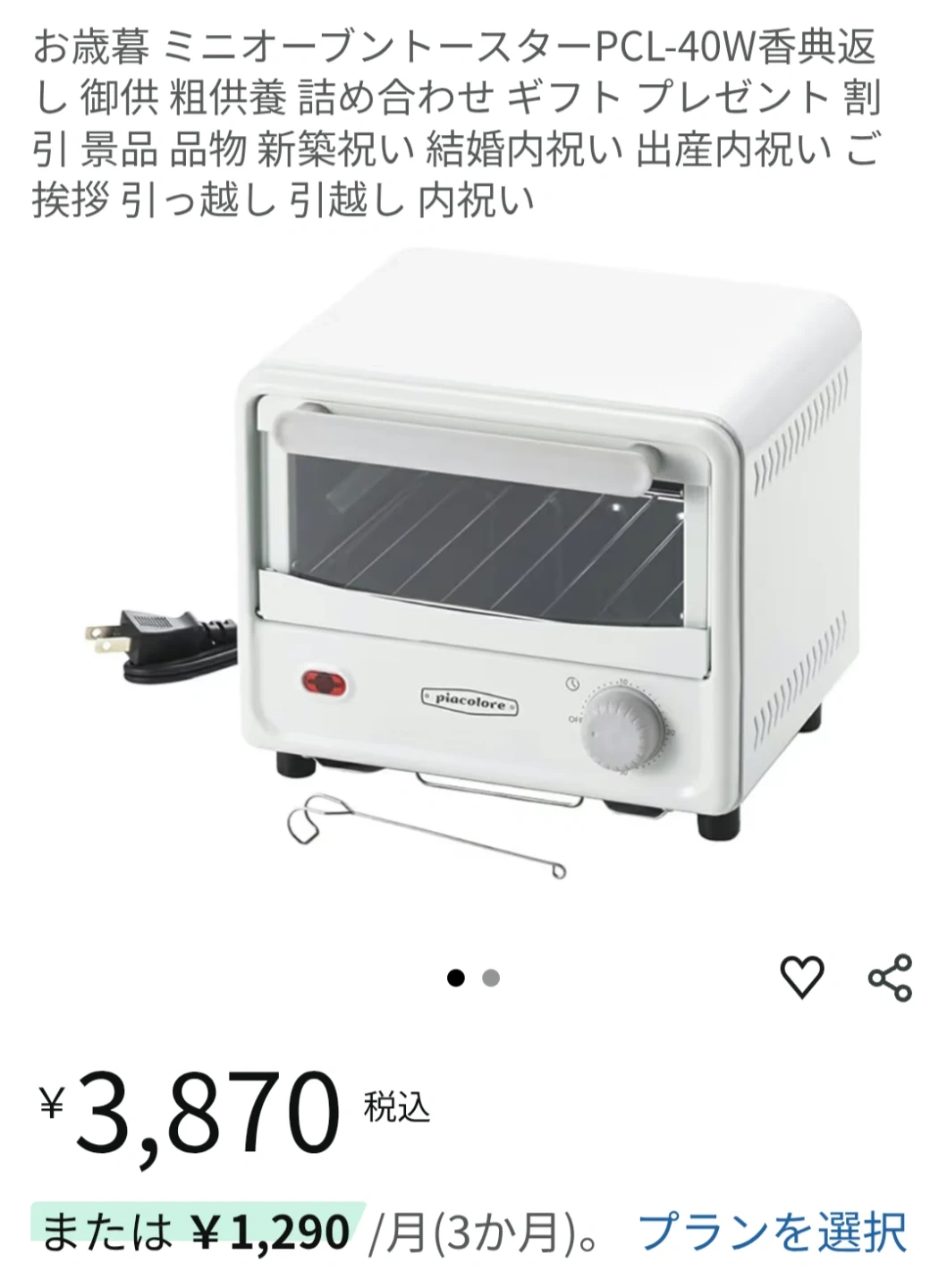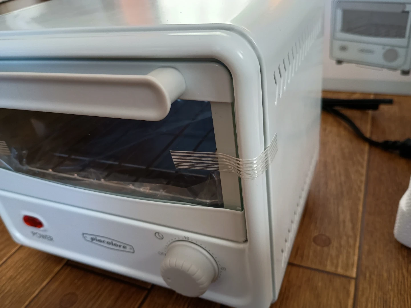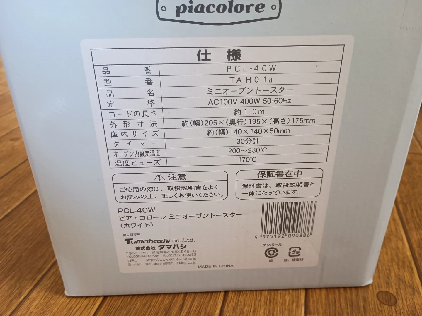 ピアコレのミニオーブントースターです。 【情報】 ブランド:ピアコレ 型番:PCL-40W 定格:AC100V 400W 外形寸法:約205×195×175mm 庫内サイズ:約140×140×50mm タイマー:30分計 オーブン内温度設定:200~230℃ 【状態】 未使用 撮影時に取り出したのみです。 (梱包用の発泡スチロールは割れあり) 【付属品】 箱、取説 いただいてから未使用です。 小さ過ぎるのでお譲りします