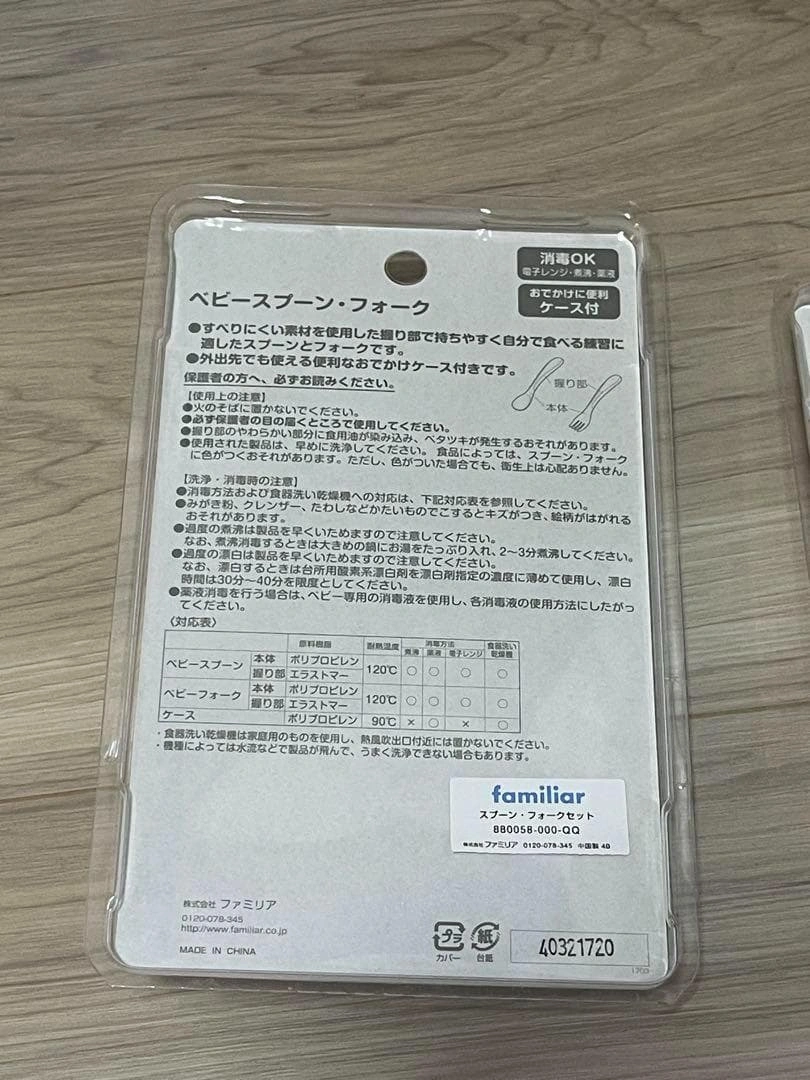 子供用のスプーン・フォークセットと離乳食スタートカップです。 -----ベビー用 スプーン・フォークセット----- おでかけ時などにお使いいただけるスプーンとフォークに収納ケースがついています。 ■サイズ スプーン12.9x2.7cm フォーク:12.9x2.5cm ケース:14.25x5.7x2.4cm。 食器洗い乾燥機 〇 ----離乳食スタートカップ---- 離乳食カップにメモリが付いてリニューアル。 弁がついているので、フタをしたまま電子レンジで加熱出来ます。 スプーンは柔らかく、お口にやさしい素材です。 〈耐熱温度〉 ・カップ 140℃ ・やわらかスプーン 140℃ 〈耐冷温度〉 ・カップ -20℃ ・やわらかスプーン -20℃ 〈取り扱い方法〉 ・電子レンジ 〇 ・消毒 〇 ・食器洗い乾燥機 〇 〈サイズ〉 ・カップ 高さ4.7cm ・カップ 口直径6.5cm ・容量120ml - ブランド: familiar - 色: 赤、青、白 - タイプ: スプーン・フォークセット - 付属品: 容器、スプーン - パッケージ: 新しいパッケージ入り ご覧いただ きありがとうございます。 #ファミリア #スプーンフォークセット #スプーン #フォーク #フォークセット #スプーンセット #familiar #ベビー #離乳食カップ #スタートカップ ご希望の方はお気軽にご連絡ください。