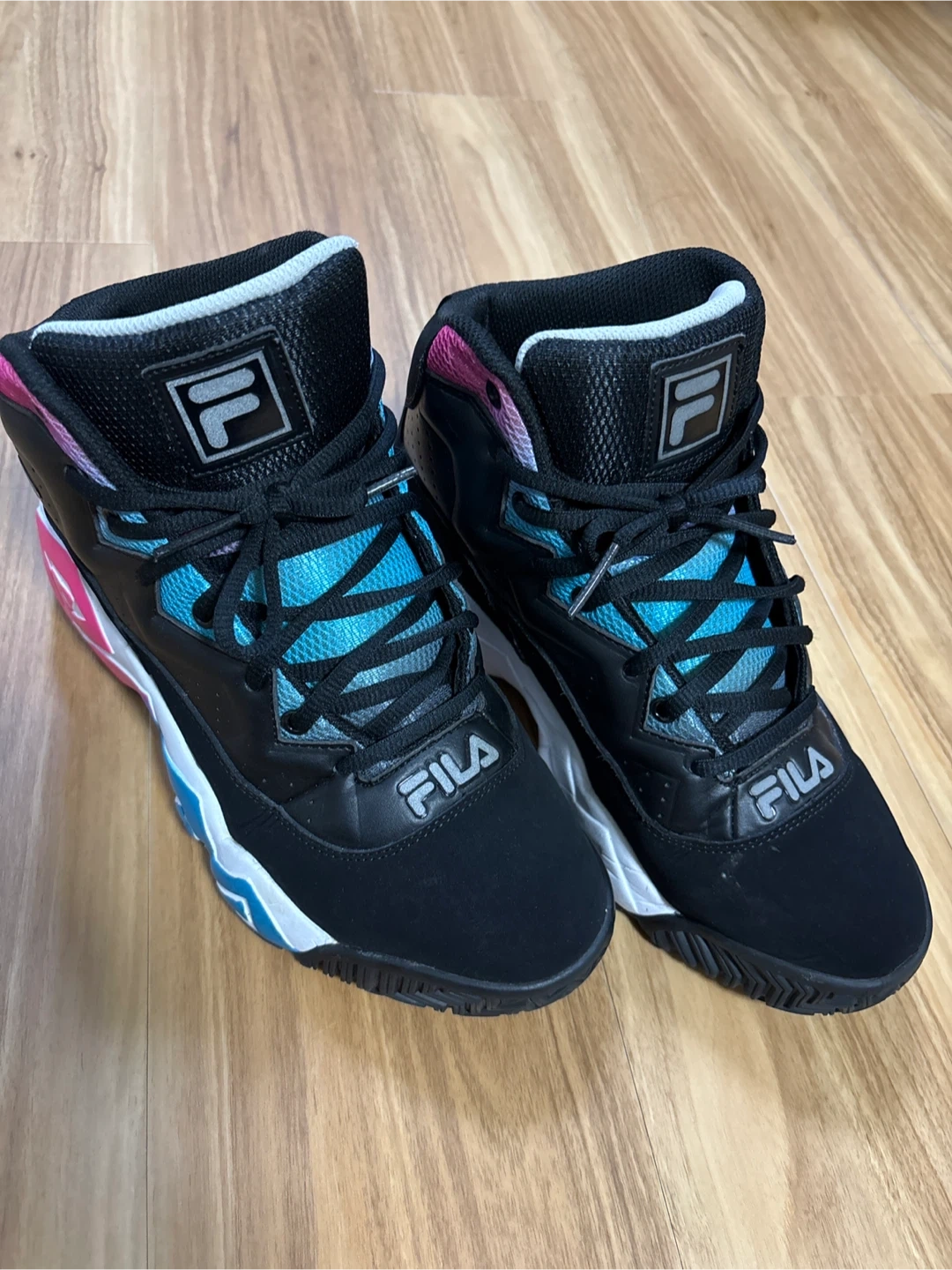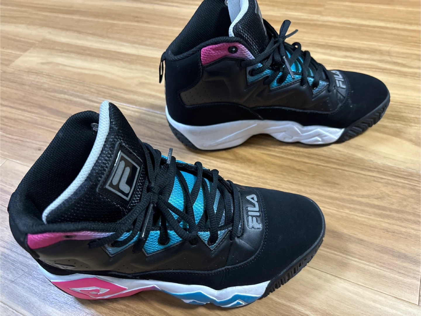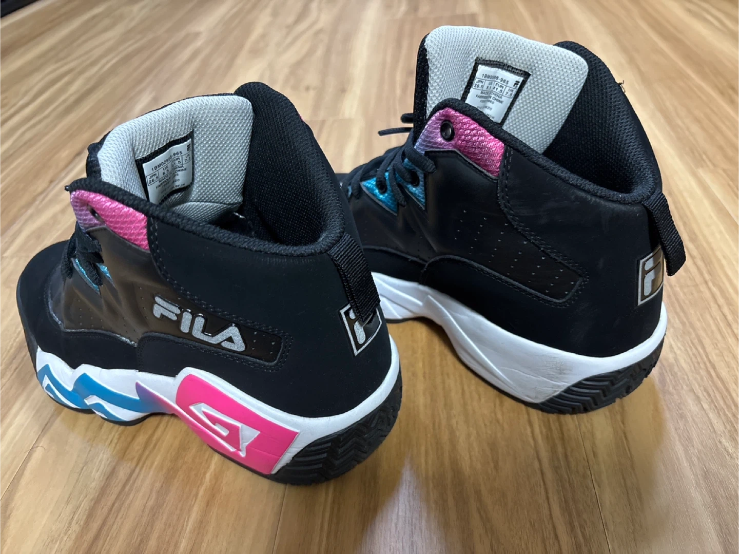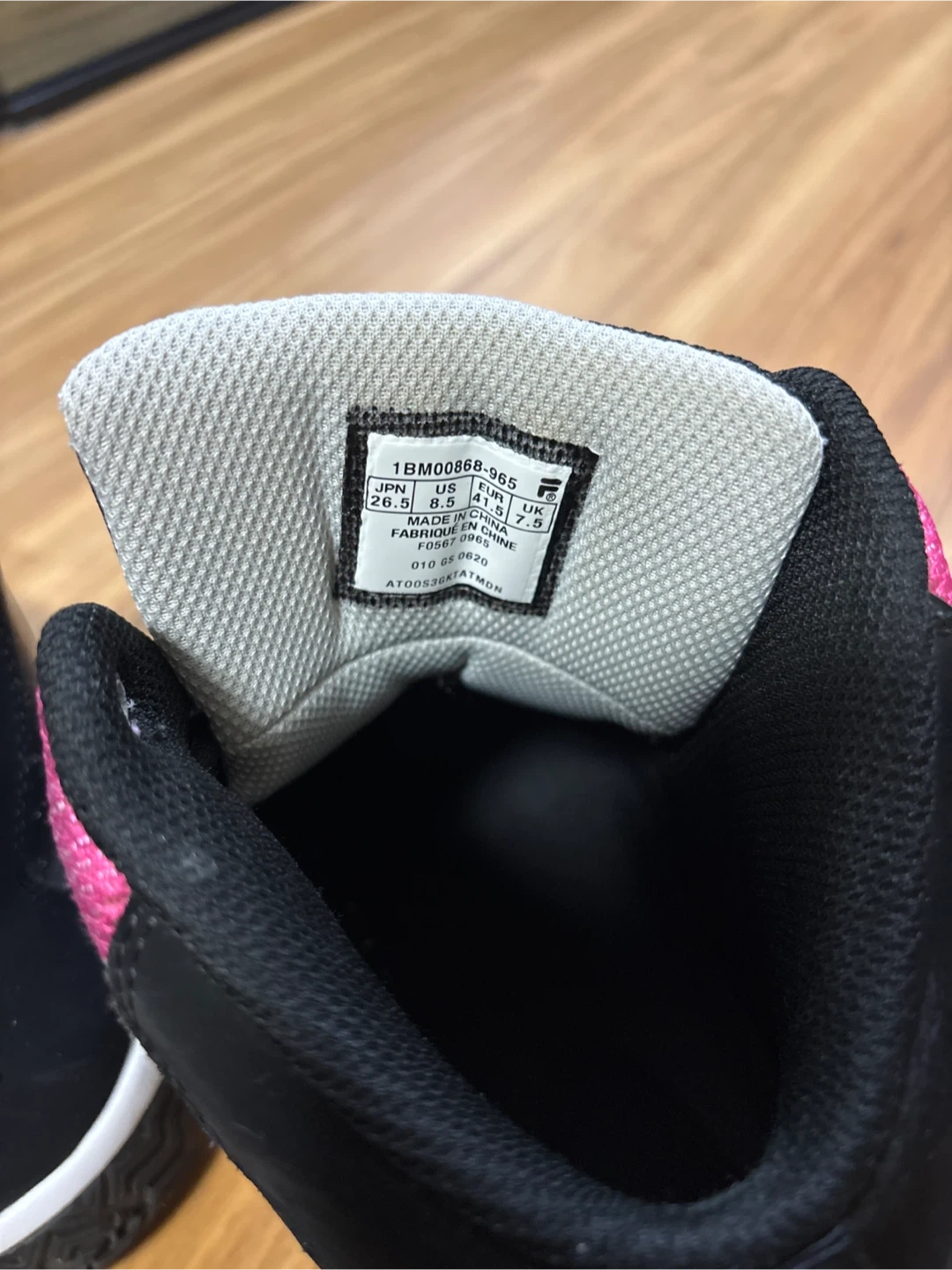フィラのスニーカーです ・ブランド:フィラ ・サイズ:26.5cm ・カラー:ブラック、ピンク、ブルー ・使用感少なめ 買ったものの足に合わずほぼ履かず… おそらく5回ほど履いて外出しました。 若干汚れあり。 箱無しご了承ください。 中古品であることご了承ください