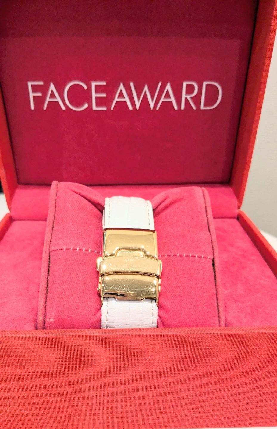 フェイスアワードの腕時計です。 ホワイト✖ゴールドがお洒落な手元を演出します。 1〜2度の使用後 自宅保管しておりました。 全体的にはキレイだと思いますが、バックル部分に使用に伴う小キズがあります。 電池は切れておりますのでご自身で交換をお願いします。 ・ブランド:フェイスアワード ・文字盤カラー:ゴールド ・ベルトカラー:ホワイト 箱もお付けする事は可能ですが擦れ等ありますのでご了承下さい。 不要な方はコメント下さい。 中古品であることご了承ください。