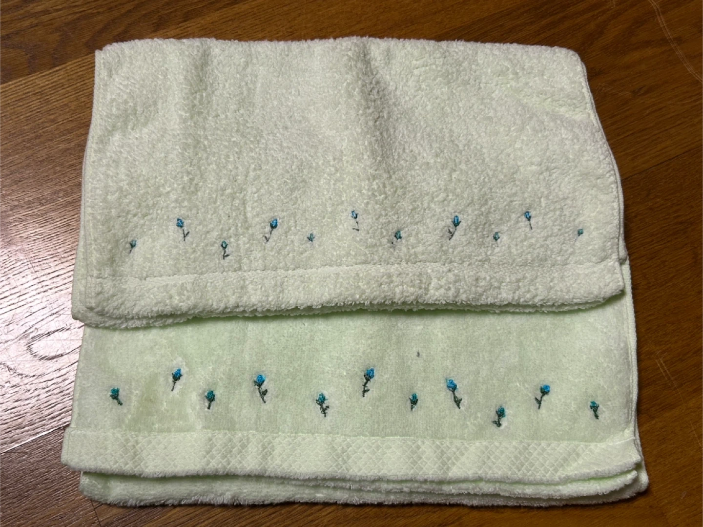 タオルです。 ・色:薄い緑 ・花柄の刺繍あり ・1枚は使うつもりで一度水を通していますが結局使用はしていません 中古品であることをご了承ください。 収納事情の為に箱から出していました事ご了承ください