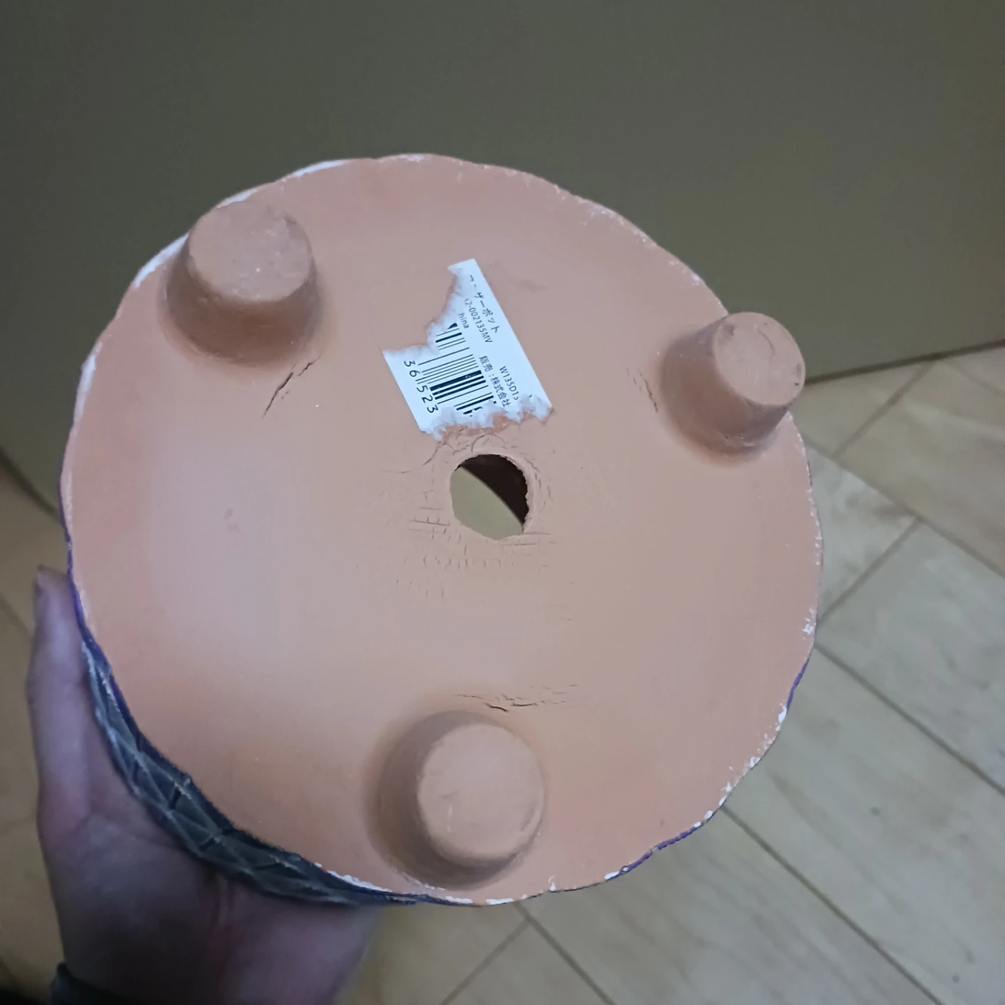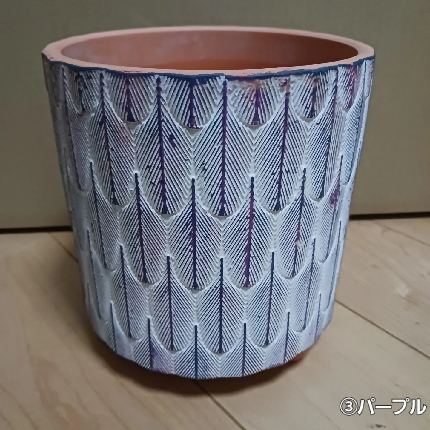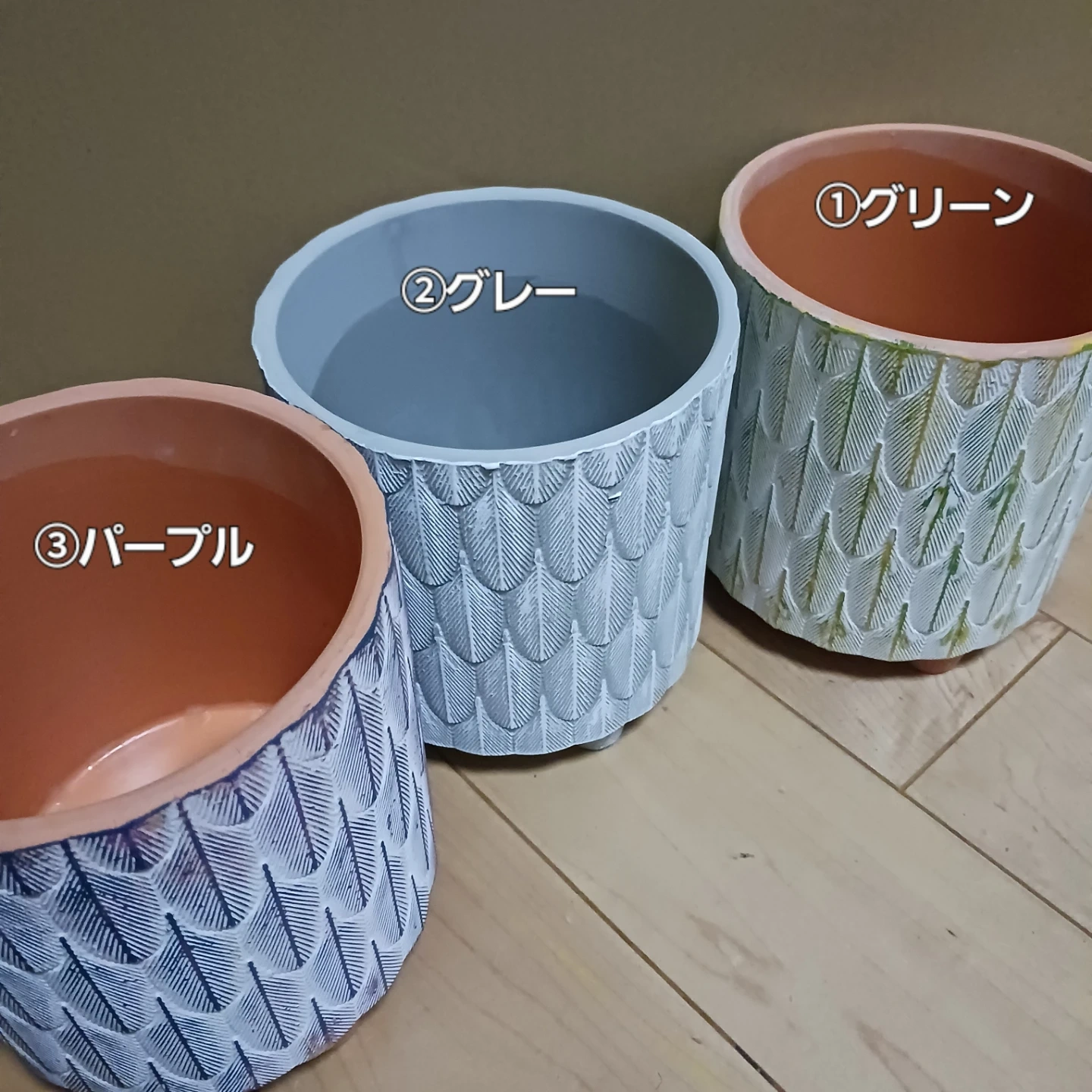 羽模様があしらわれた陶器鉢です。脚つきで見た目も良く、鉢底穴は小さいですが通気性のよい構造です。 サイズ:直径外寸13.5 内寸12cm 高さ14cm 素材:陶器 色:①グリーン、③パープル 鉢底裏にバーコードシールの一部あり