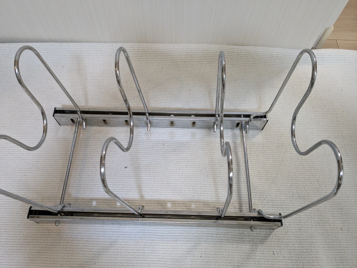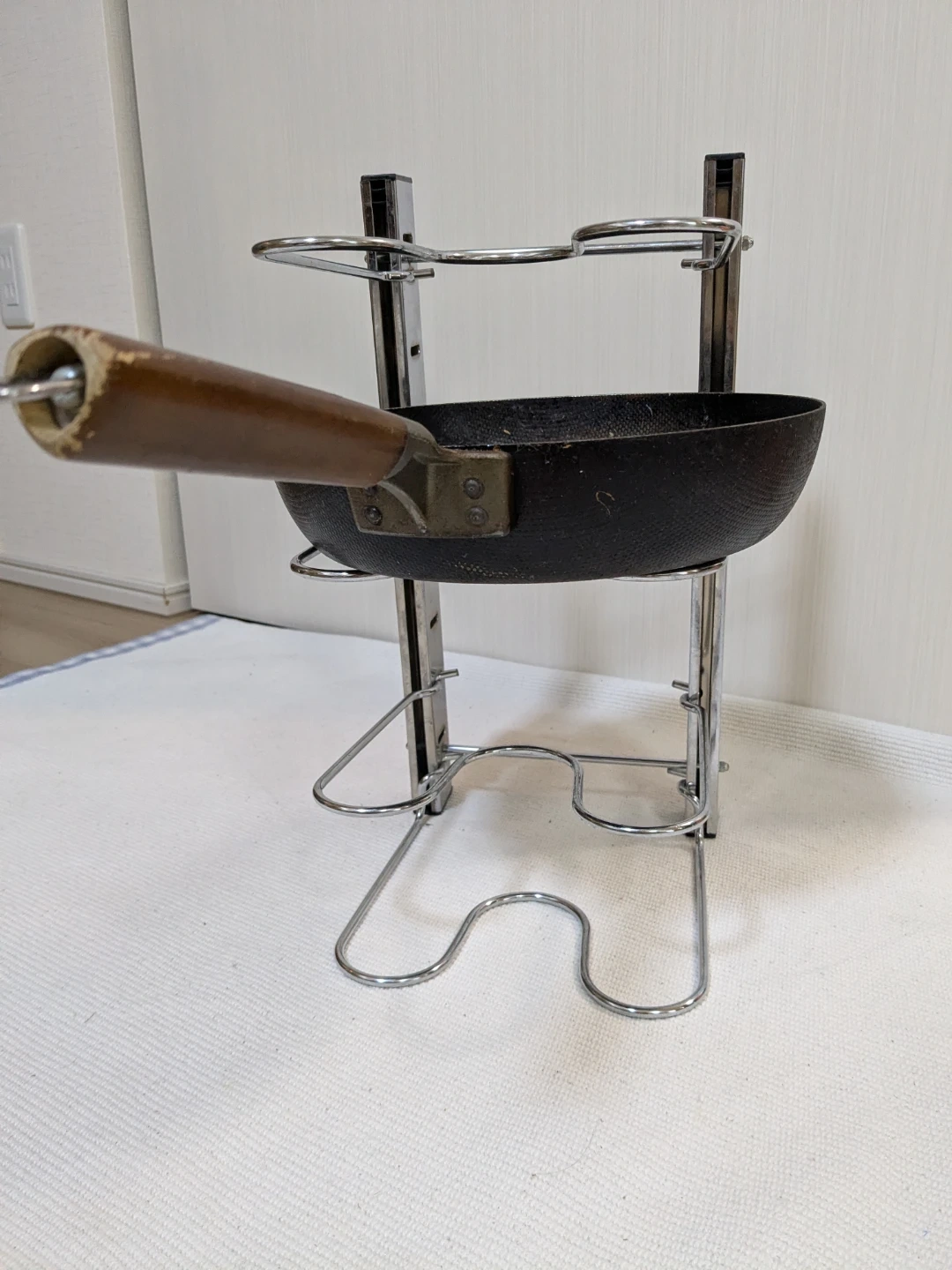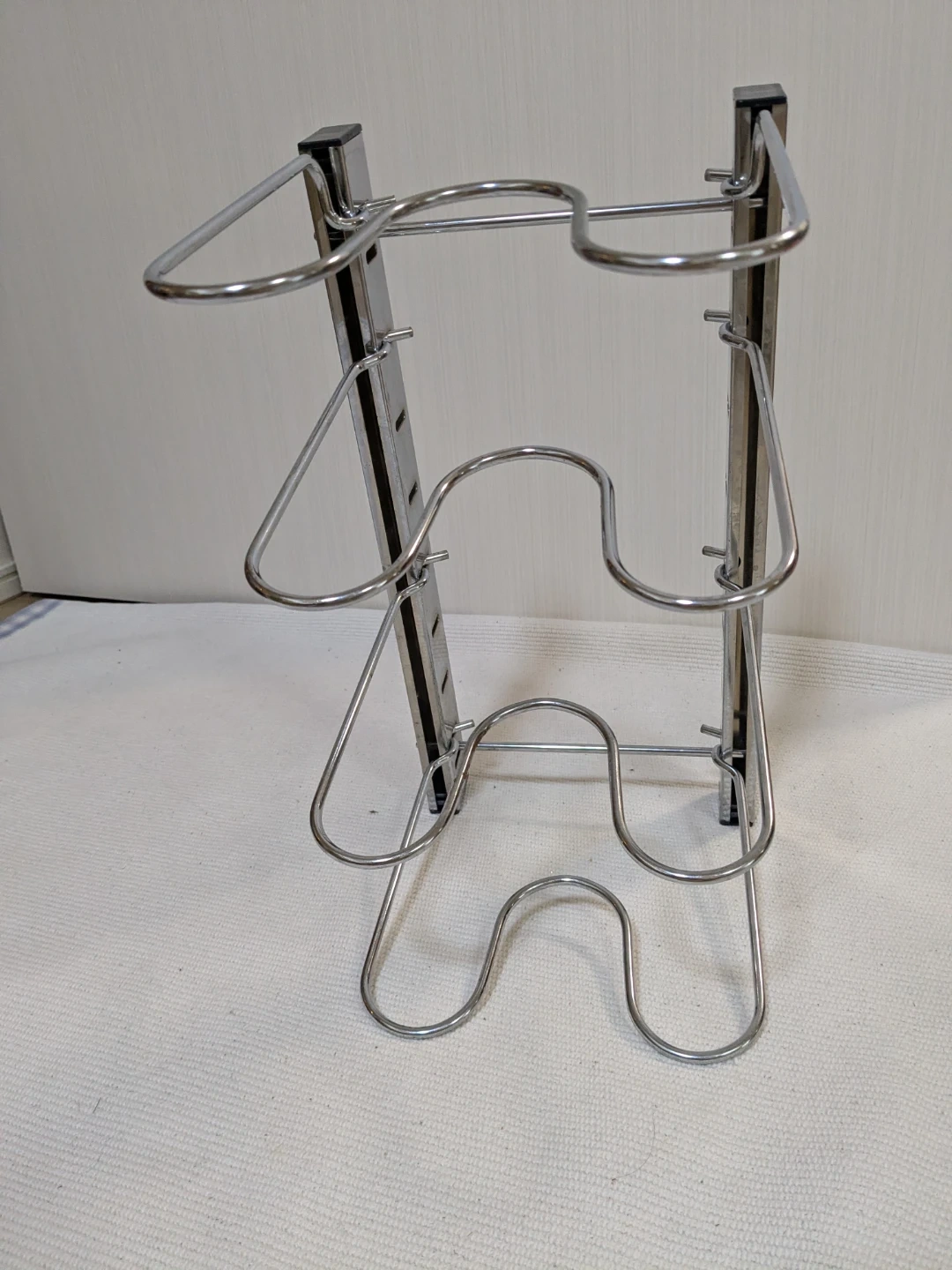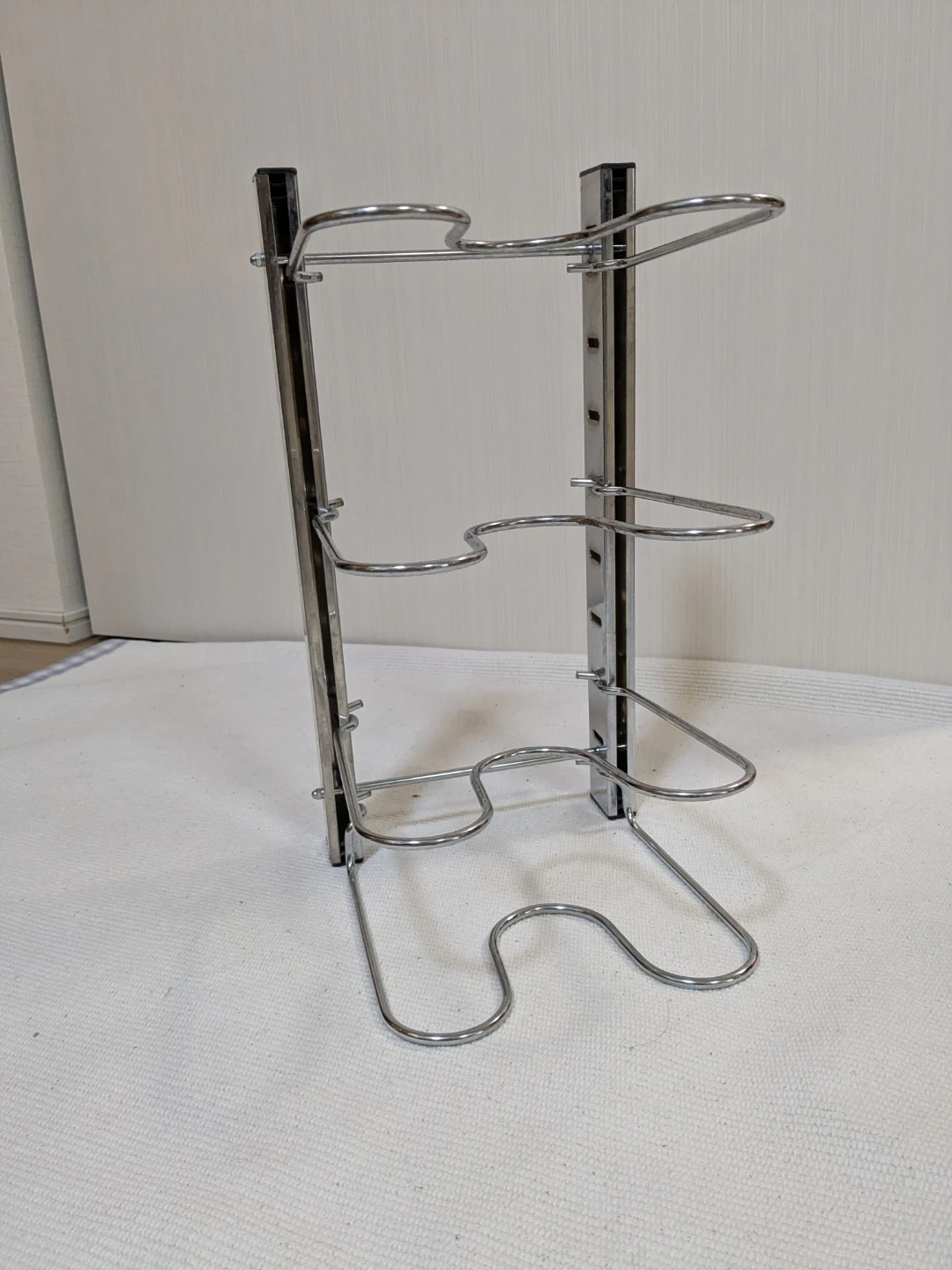 フライパンスタンドです。 引っ越しのため使わなくなりました。 コンロ下の観音開きの収納で縦型に設置して使用。 ・鍋3−4枚収納可能 ・シルバーカラー ・サイズ (約)幅21cm 奥行き23.5cm 高さ40cm 重さ1.3kg ダイソーの油汚れクリーナーで拭いてあります。 中古品であることご了承ください。