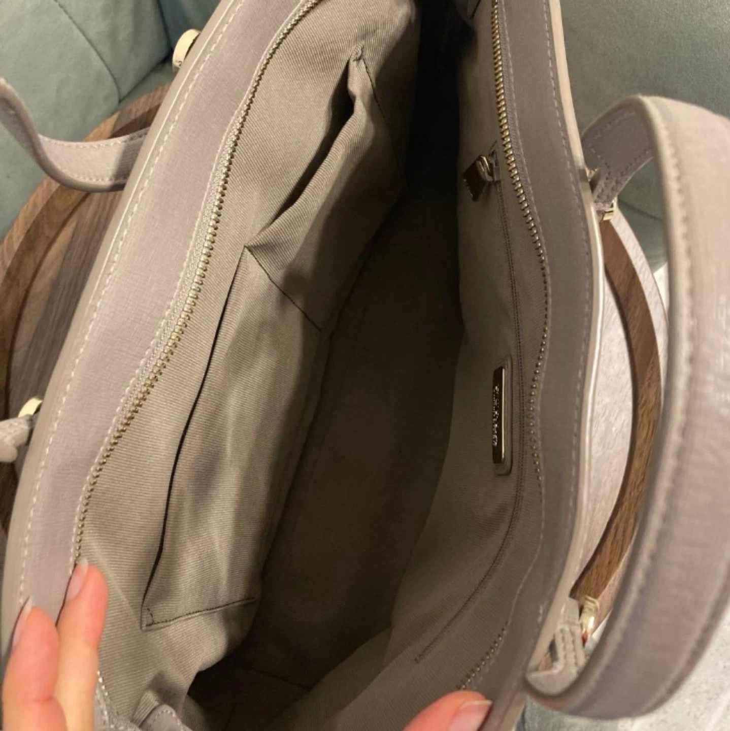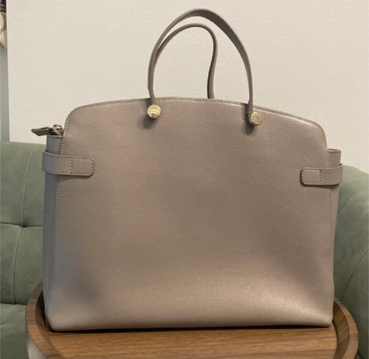 グレーの合成皮革製ハンドバッグ、内部に複数のポケット、リボンチャーム付き。 - 色: グレー - デザイン: ハンドバッグ - 内部ポケット: 複数のポケットあり - 装飾: リボンチャーム付き - 素材: 合成皮革 高さ:26cm 幅:38cm マチ:12.5cm ※素人採寸のため多少の誤差はご了承願います。 購入時期:2020年 購入場所:御殿場アウトレット 5年ほど使用しましたが使用頻度が減ったため、お譲りいたします。 ハンドル部分に少し傷がありますが、保管袋に入れて管理していたためそれ以外は綺麗な状態です。 自宅保管のため神経質な方はお控えください。 ご検討のほどよろしくお願い申し上げます。