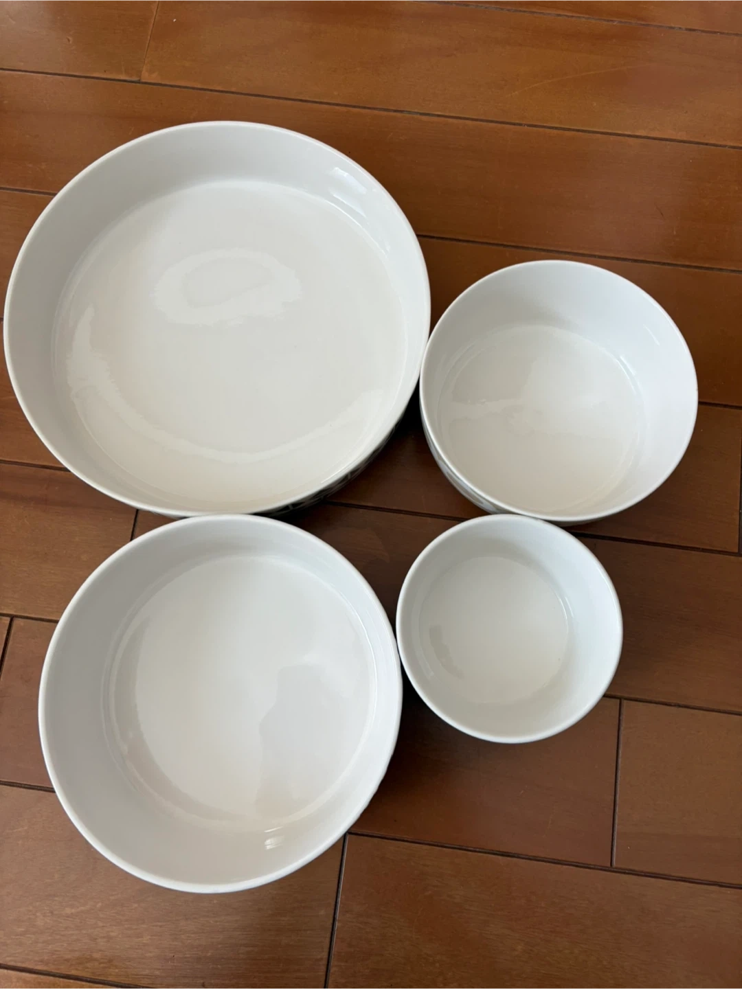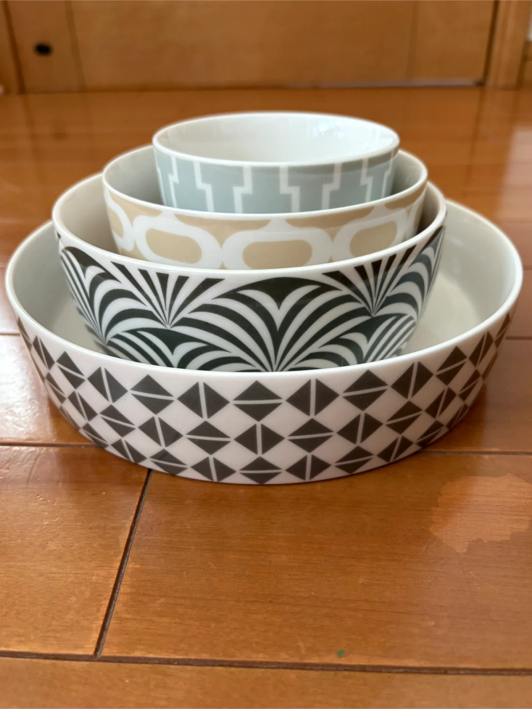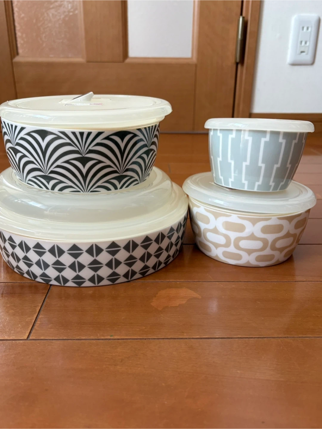 フードコンテナ 4個セットです。 ほぼ使わず保管していました。 蓋は経年劣化により少し色が変色していますが、使用上は問題なさそうです。 ・サイズ:4種類 ・デザイン:幾何学模様 ・状態:使用感少なめ 自宅保管、中古品であることをご了承ください。
