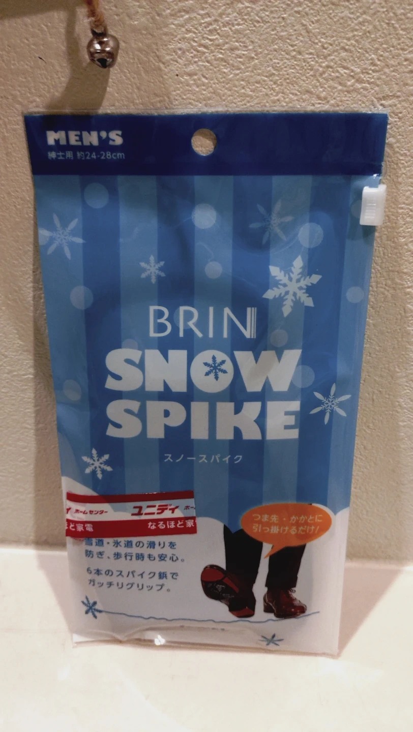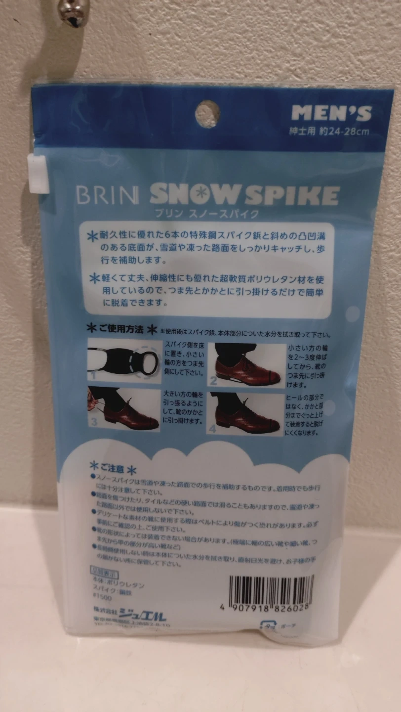ブリンのスノースパイクです。 ・メンズ用 ・サイズ:約24-28cm ・雪道や凍った路面での滑り止め ・つま先とかかとに引っ掛けるだけ これは「ブリン スノースパイク」です。 雪道や凍結路面での滑り止めを目的とした、靴に装着する製品です。 6本のスパイク鋲で路面をしっかりとグリップします。 つま先とかかとに引っ掛けるだけで簡単に装着できます。 本体はポリウレタン製、スパイクは鋼鉄製です。 未使用未開封