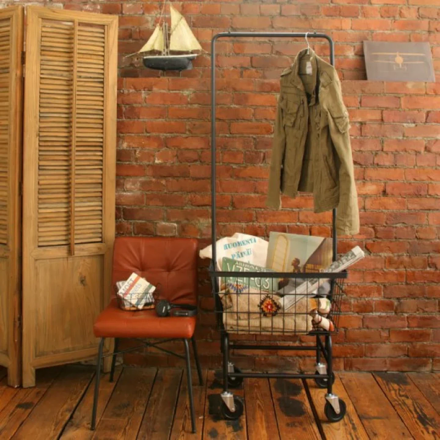 ジャーナルスタンダードでも売られている、ワイヤーバスケット付きのハンガーラックです。 使用しないまま部屋に置いた状態のため、出品します。 画像から読み取れる情報: ・ワイヤーバスケット付き ・キャスター付き ・高さ1680mm、幅570mm、奥行き450mm(詳細なサイズは画像3枚目参照) 中古品であることをご了承ください。