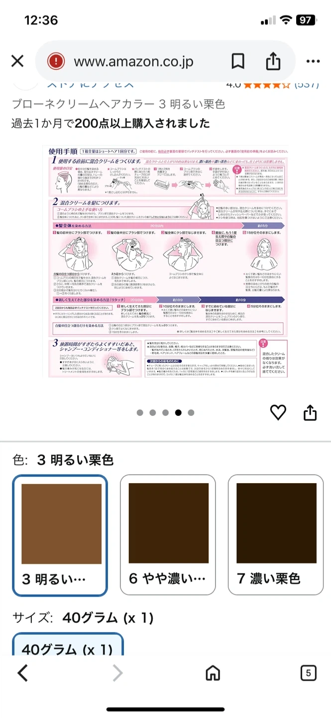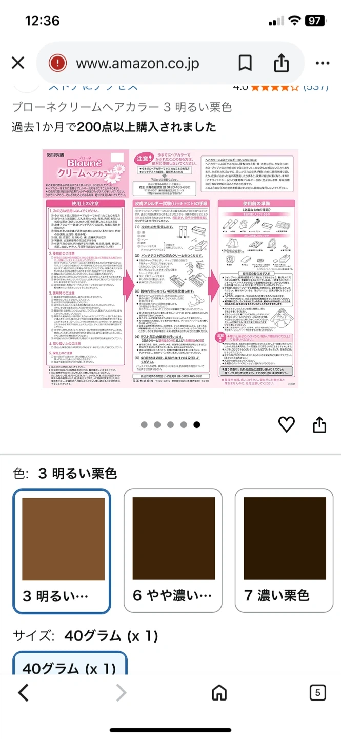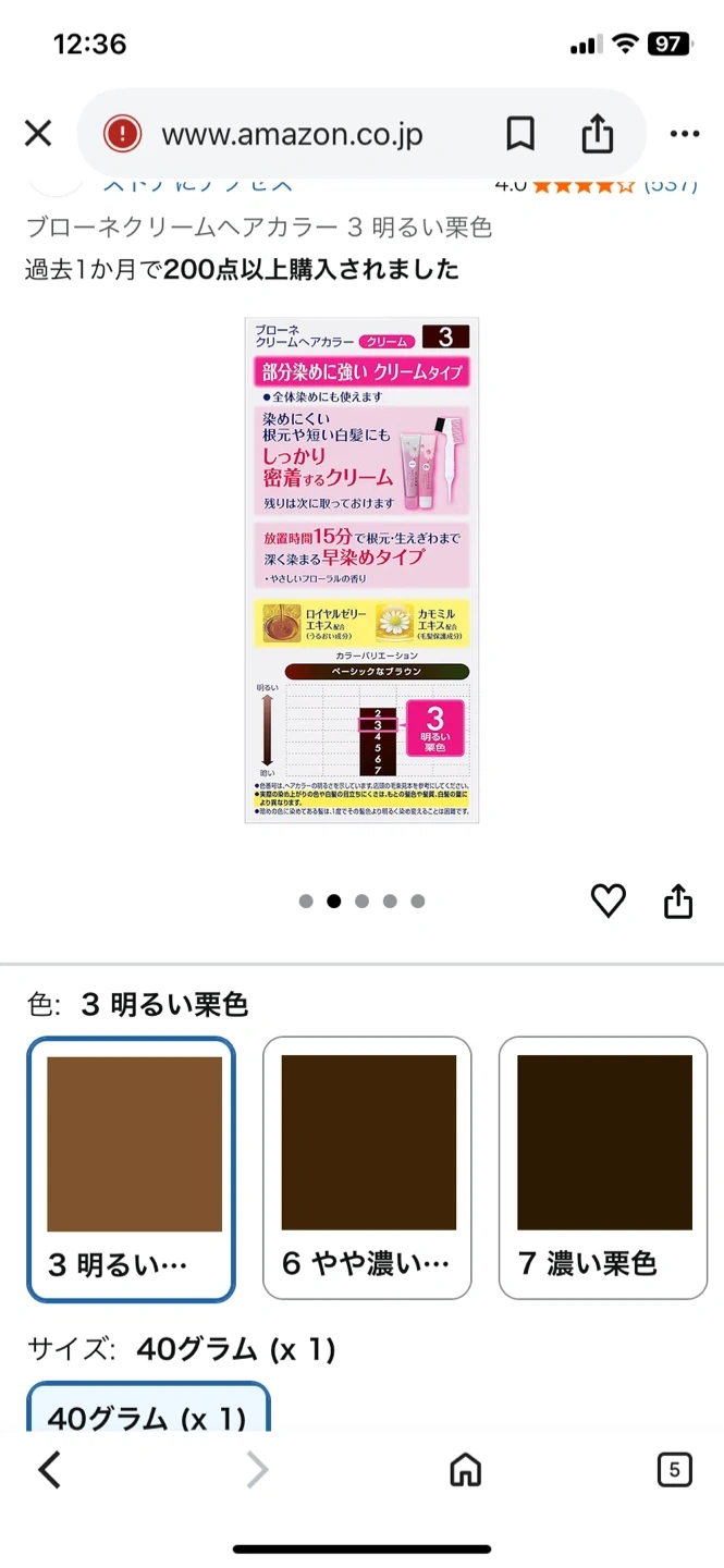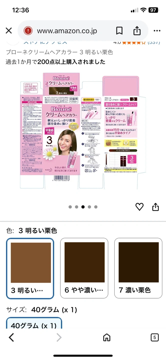 ブローネのクリームヘアカラーです。 ・ブランド:ブローネ ・カラー:6 やや濃い栗色 ・部分染めに強い 数ヶ月くらい前にマツキヨで購入。 美容室でカラーリングした後色味が合わなくなったため出品します Amazonから出した写真の色は3になっていますが、6のやや濃い栗色です 未開封です。 同時期に購入した同じ商品は問題なく使用できましたので、同じようにお使い頂けます 夜18:00以降は在宅が多いです。 (火)(水)は終日OK, 3つくらいご都合良い時間をお知らせいただけるとありがたいです。