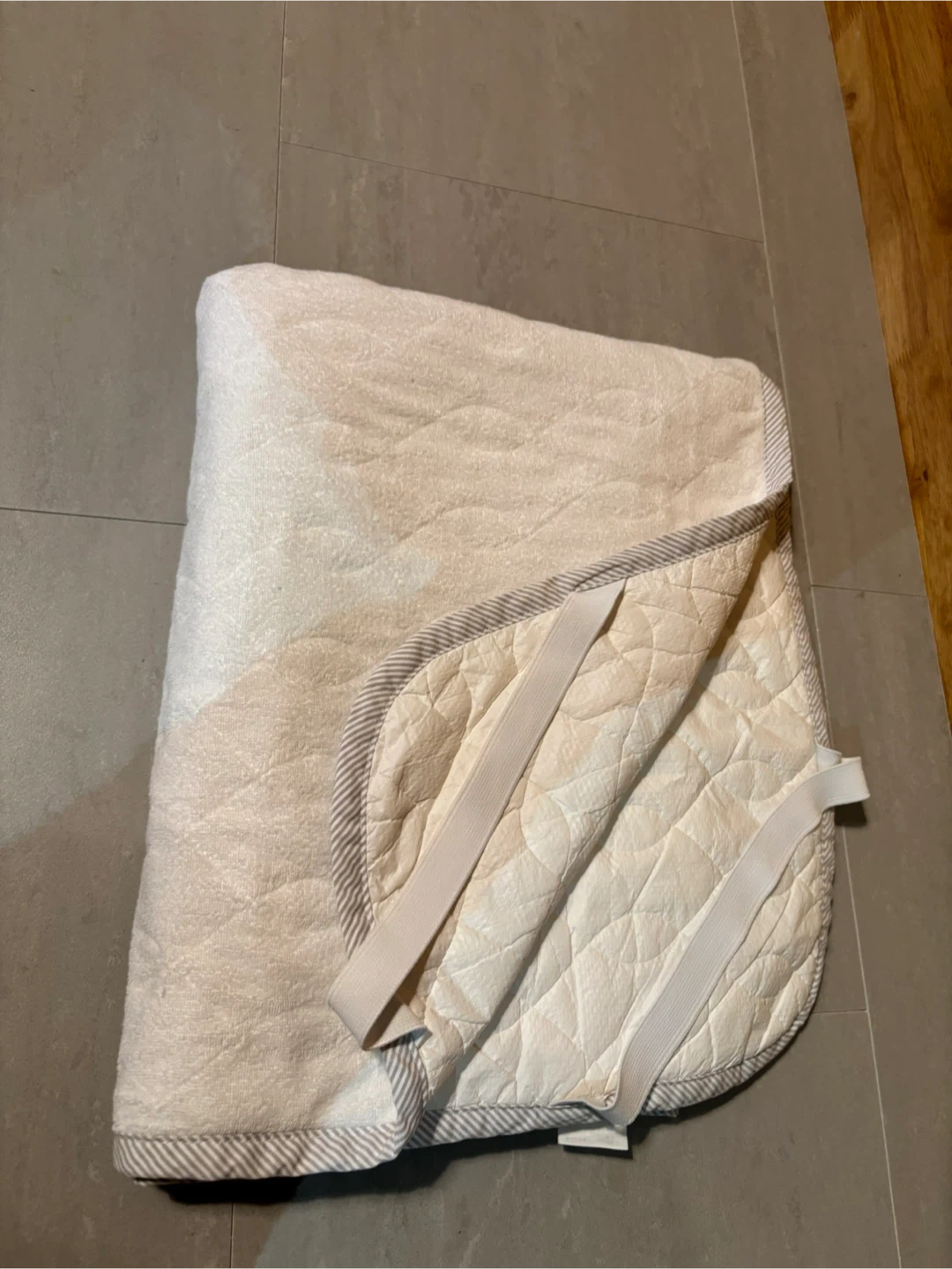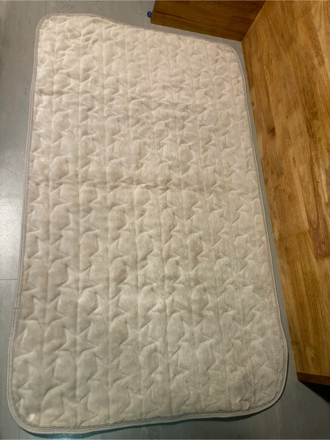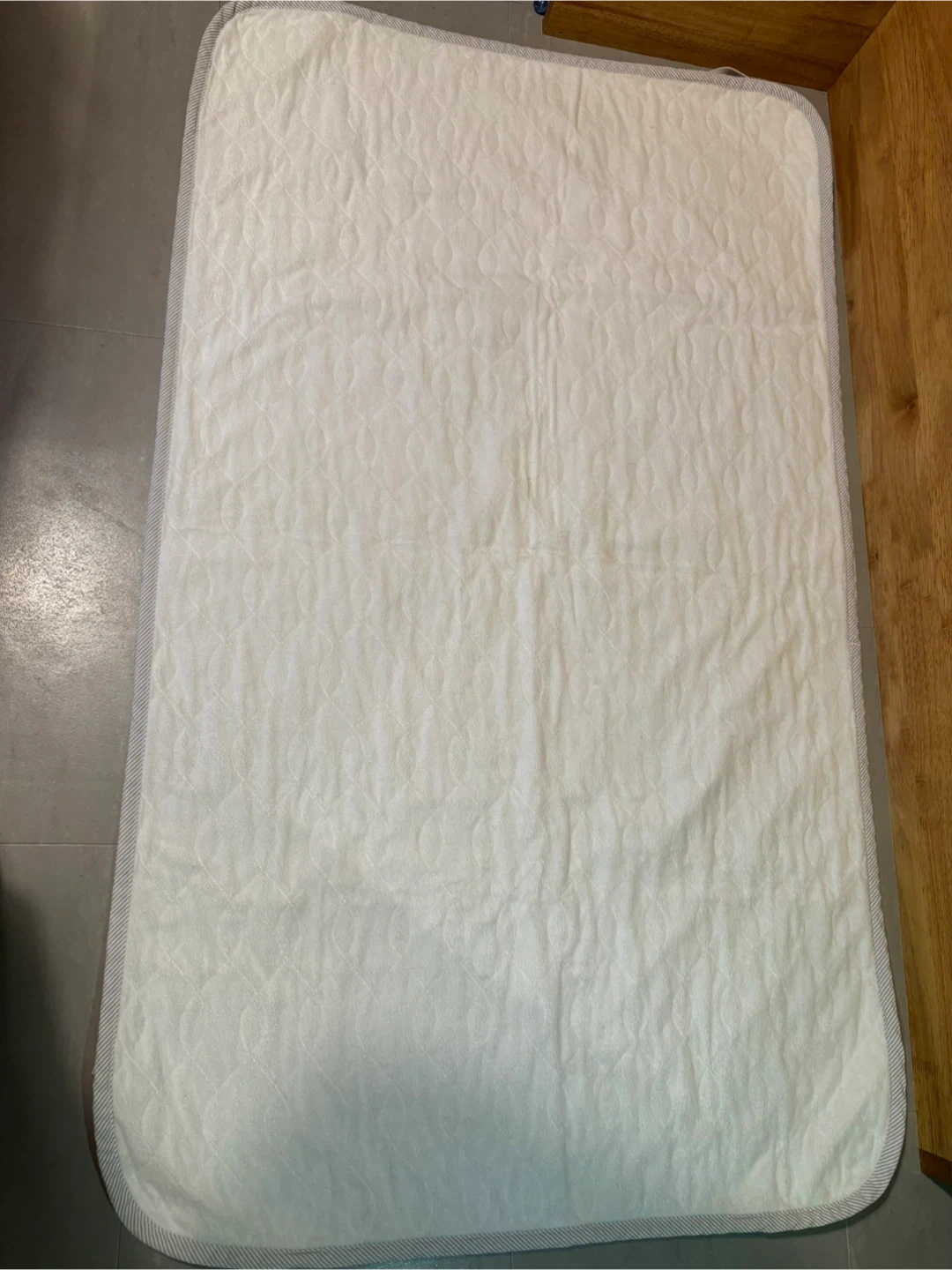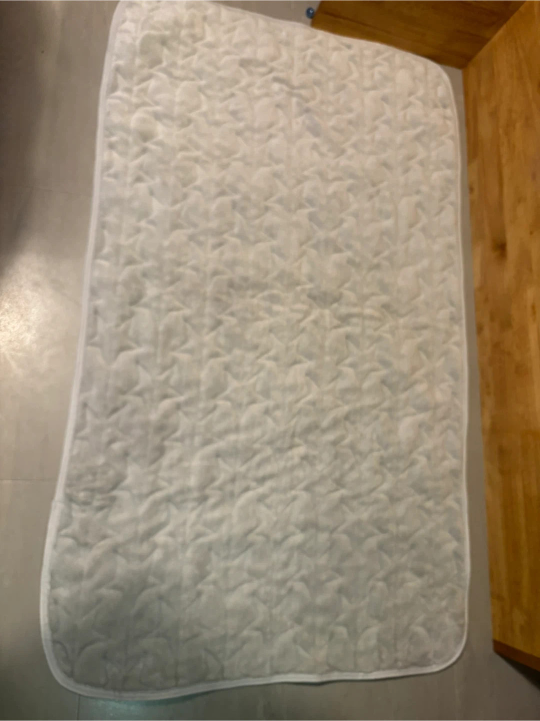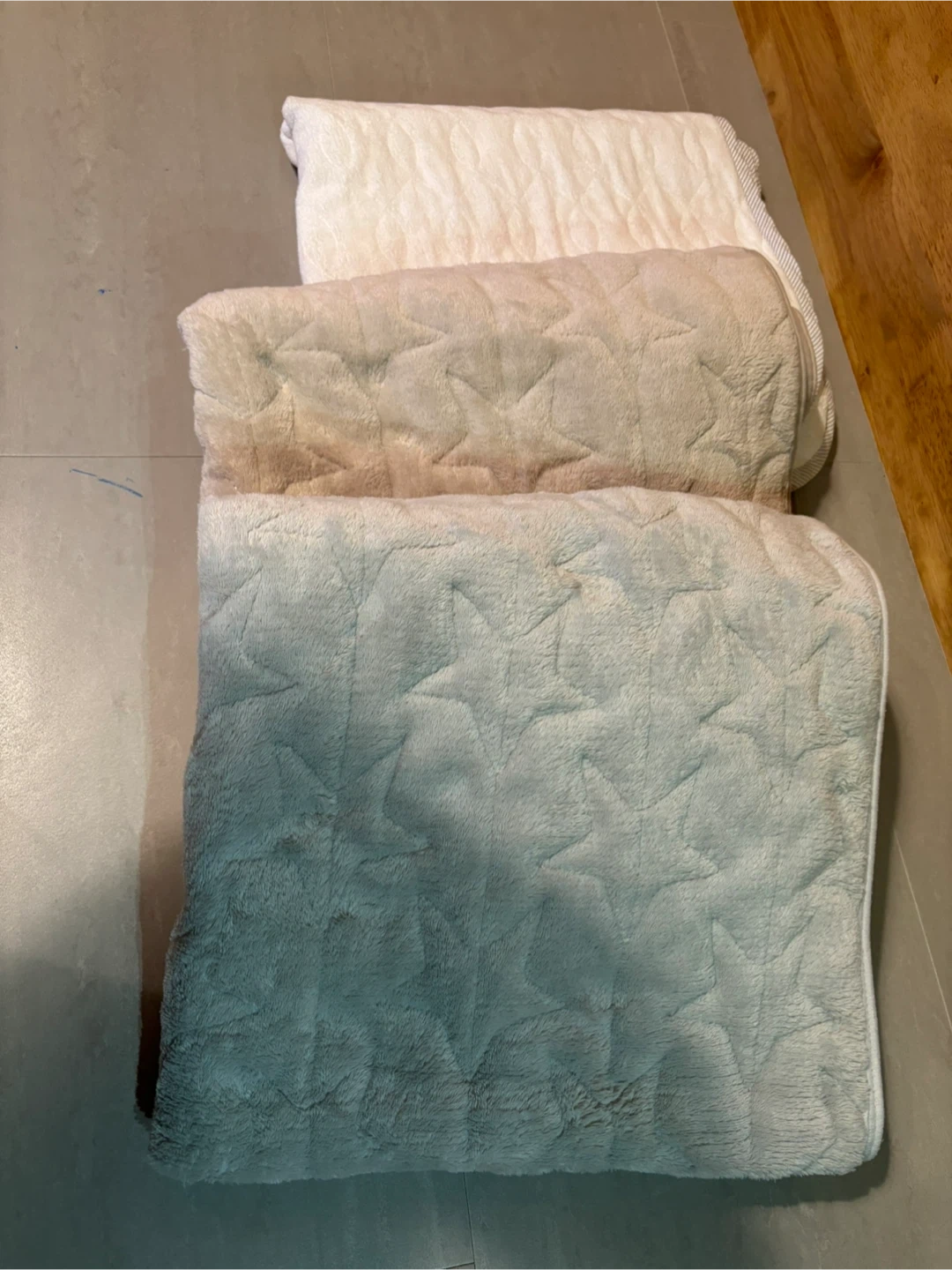 冬用ベビー布団敷きパッドです ・色:ベージュ、グレー ・星柄のデザイン 多少の使用感がありますが目立った汚れはありません。 ・サイズ 70×120 冬用ふんわりあたたか「敷きパッド」肌触りの良いサラッと滑らかな毛足のフランネル生地は寒い冬のお布団に入ったときのヒンヤリ感を軽減してくれます 四隅にずれ防止のゴム付き。洗濯物の乾きにくい冬場でもサッと洗えてサッと乾く、もちろん洗濯機でお洗濯OK 白の敷きパッドは防水パッドになります。 防水パッドの方はアカチャンホンポです。 表はタオル地でこちらも四隅にゴム有りです。 こちらもサイズ70×120になります。