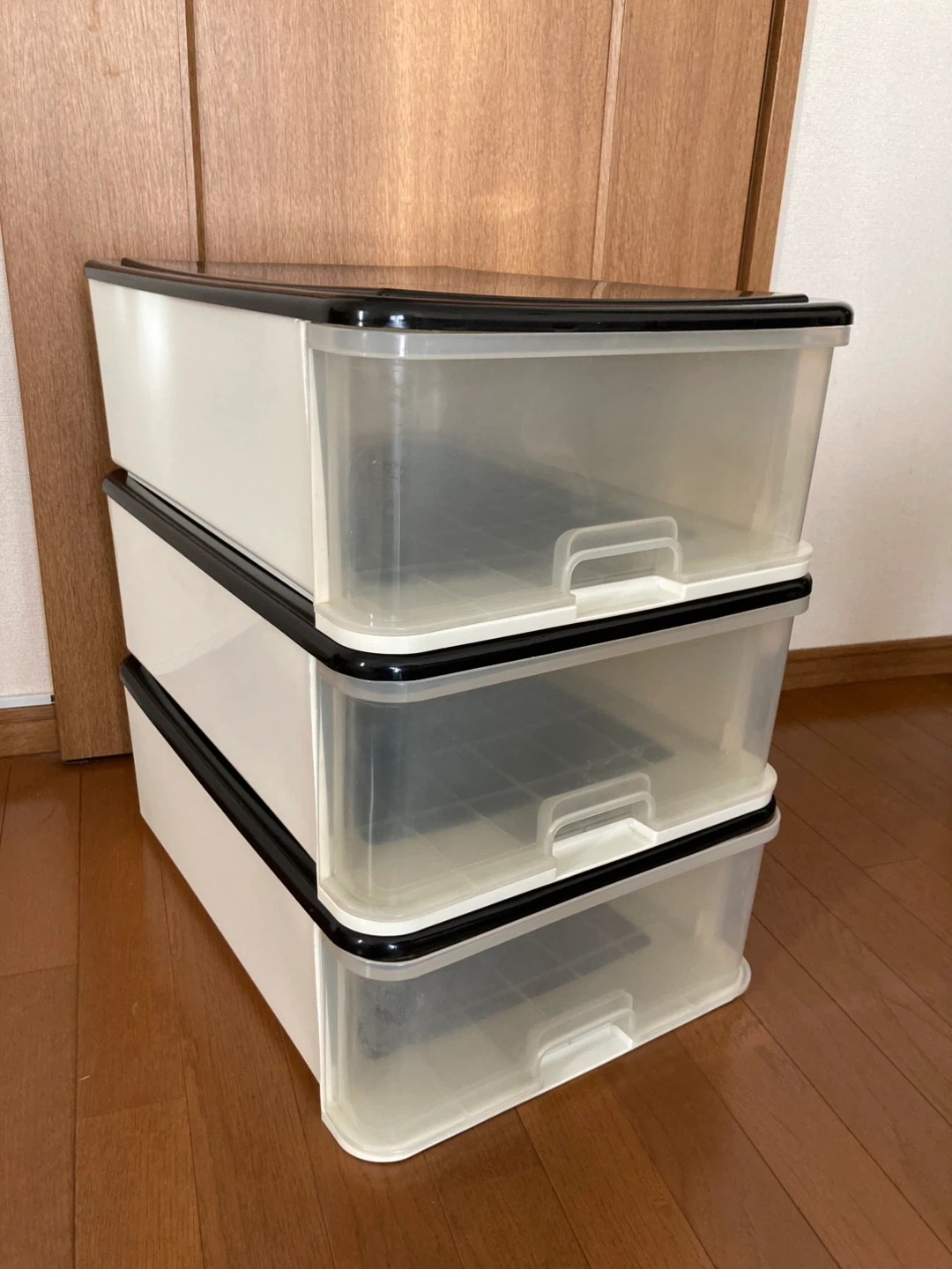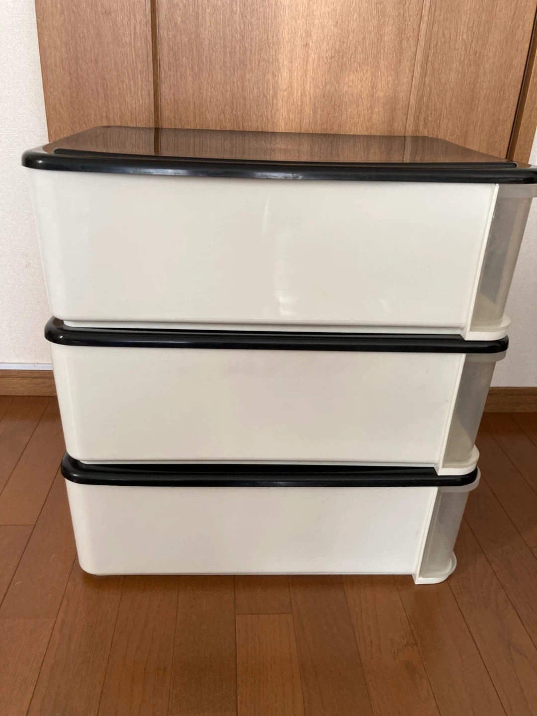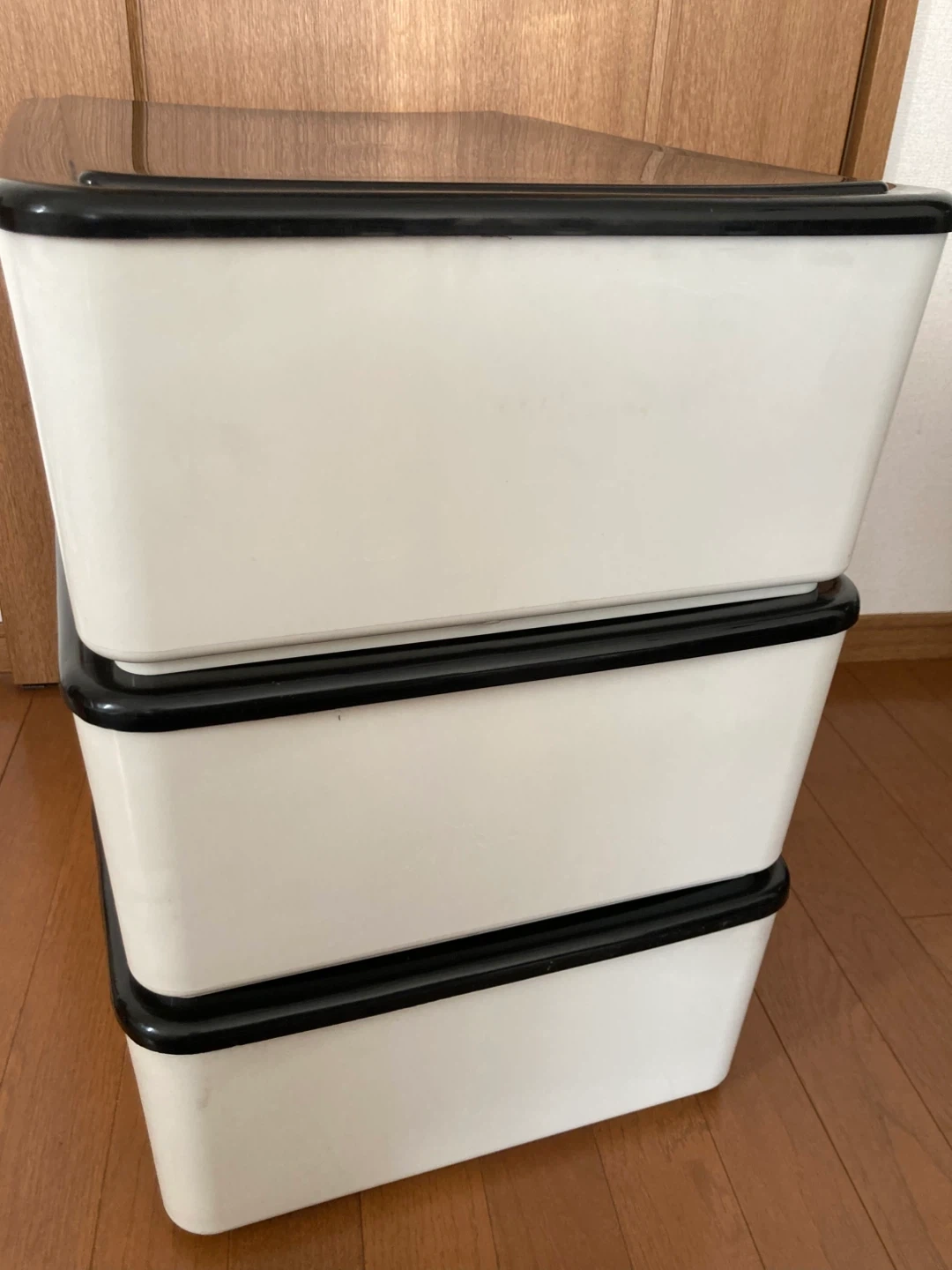 プラスチック製の収納ケースです。 ・3段 ・色:ホワイト、ブラック 内寸35.5×51×15 三段重ねた高さ57cm 出品にあたり1つ1つ磨きました。 それでも経年による汚れやくすみ、傷はあります。ご了承ください。 ケースとしては、まだまだ充分にお使いいただけます。
