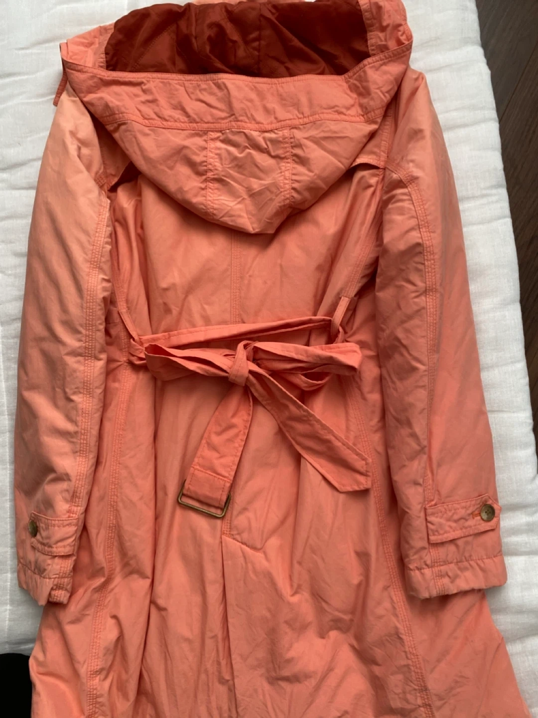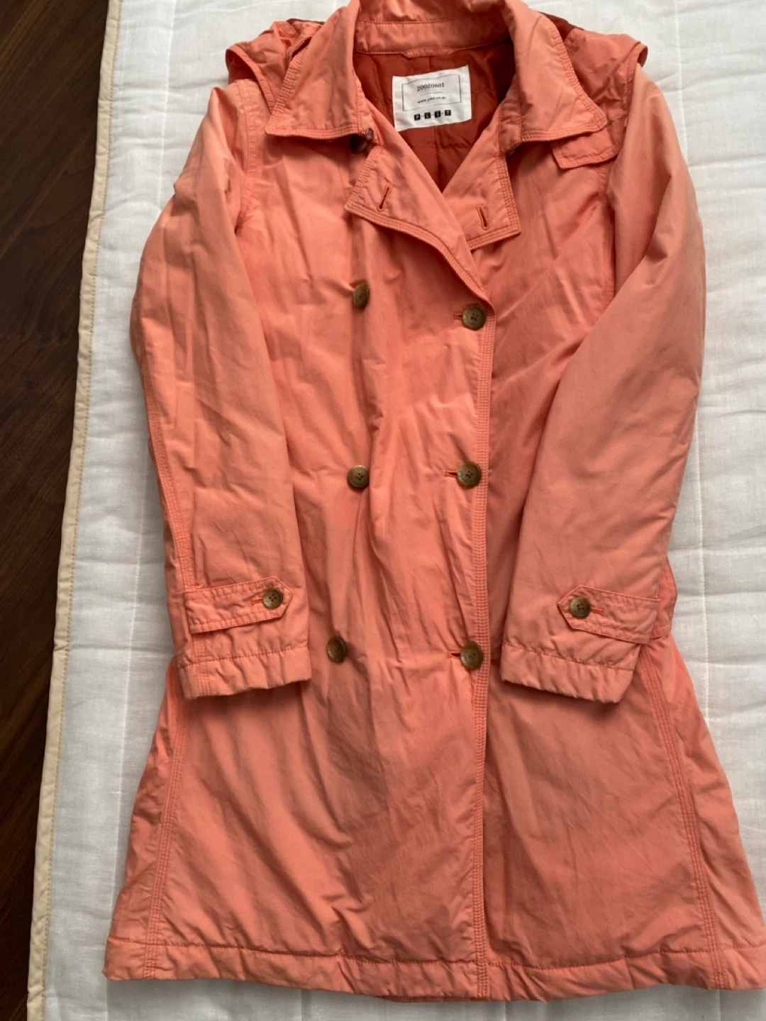 プラステのコートです。 ・色:オレンジ ・サイズ:2 ・素材:ナイロン、綿、ポリエステル、ダウン、フェザー ・品番:12-4109001 ・使用感あり 表は爽やかなオレンジ色で裏側はダークなオレンジです。フードはボタンで外せます。 着丈は85㎝でゆったりと着る感じです。 袖口に薄汚れが見られますが着用すると分かりにくいです。ご自宅で手洗い可能かと思います。 お安く出しますので宜しくお願い致します。 受渡しは三軒茶屋から桜新町辺り迄可能です。