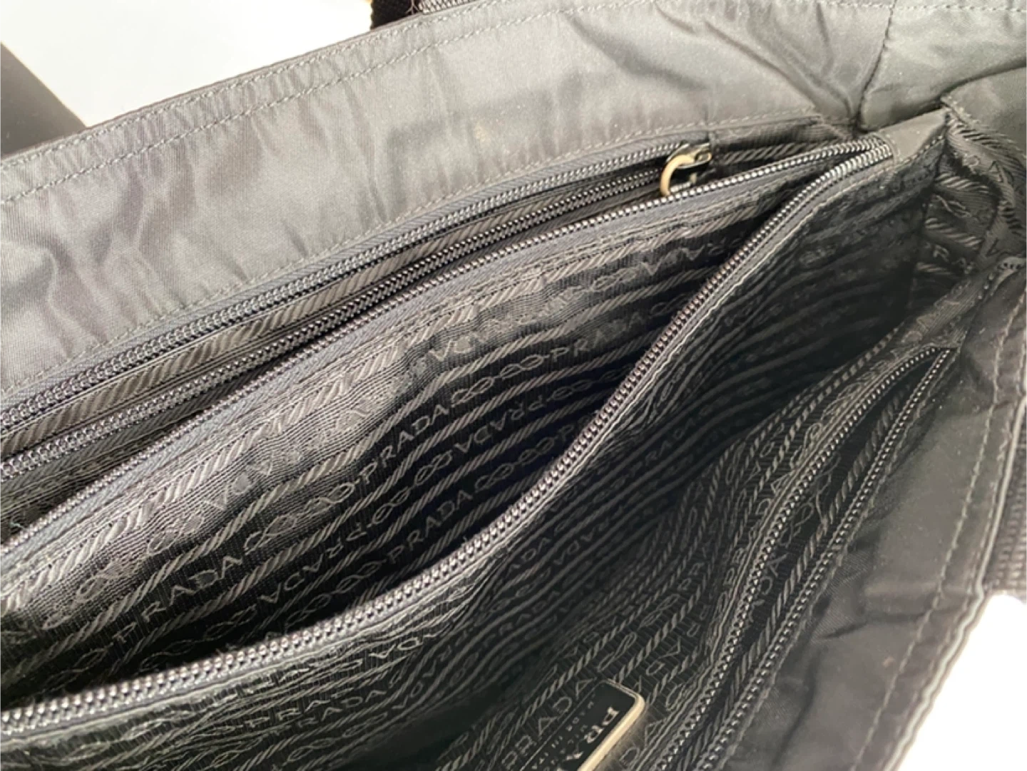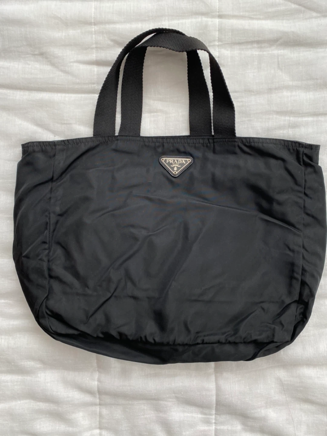 プラダのトートバッグです。 ・カラー:ブラック ・ブランド:プラダ ・内側にファスナー付きポケットあり ・内側に「PRADA MILANO MADE IN ITALY」のロゴあり 横幅34㎝、縦27㎝、マチ11㎝、手提げ部分36㎝くらい。A4サイズが横に入りそうです。素人計測をご了承下さい。 収納時のシワは有りますが、目立つキズや汚れは見当たりません。 受渡しは三軒茶屋から桜新町辺り迄可能です。