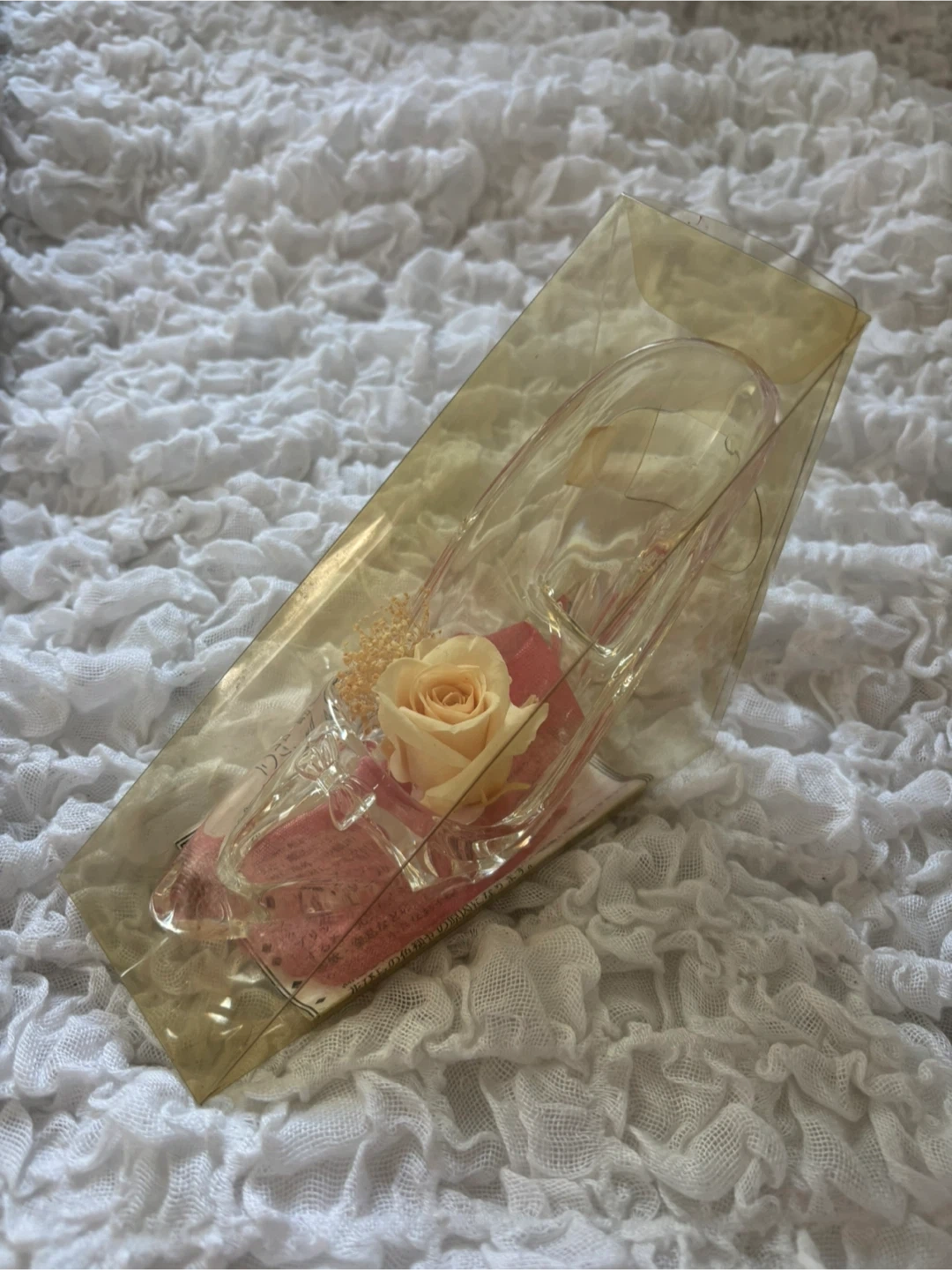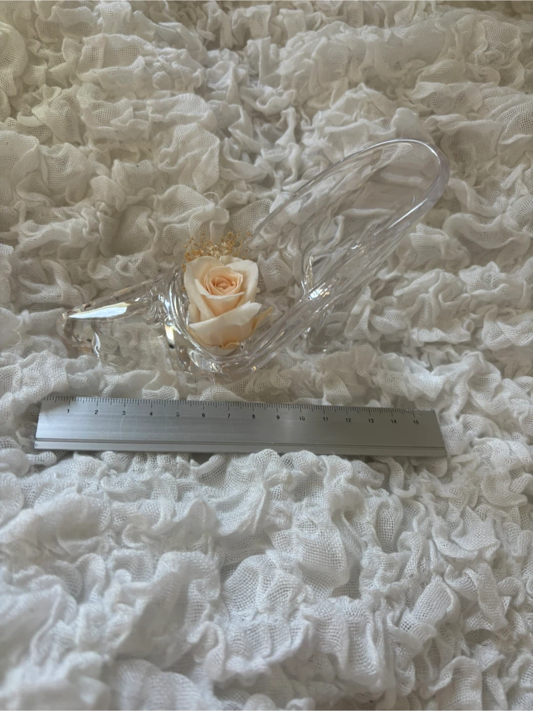 アクリル製 ずっとケースに入れたまま飾ることなく保管してました。状態確認のため初めてケースから出してみましたが、コンディションは良いと思います。若干プリザーブドフラワーの褪色があるのかも知れませんが、元々もっと鮮やかなピンクだったのかどうかすら覚えてません。 ヒール型の器だけでもジュエリーケース等の小物入れとして使えそうです。 ケースは劣化で変色しています(画像あり)。 ケースに汚れや小傷、シール跡あり。 神経質なかたはご遠慮下さい。