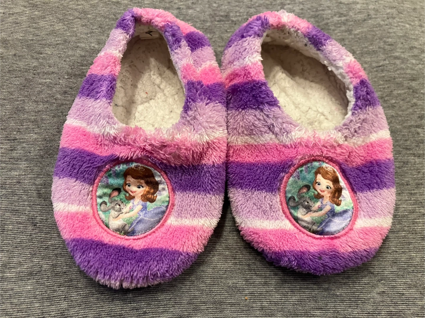 プリンセスソフィア ルームシューズです。 実寸は17センチあります。 15センチの時に履いておりました。 起毛部分が潰れてしまっておりますが、まだ暖かく履いていただけます。 底には滑り止めも付いています。