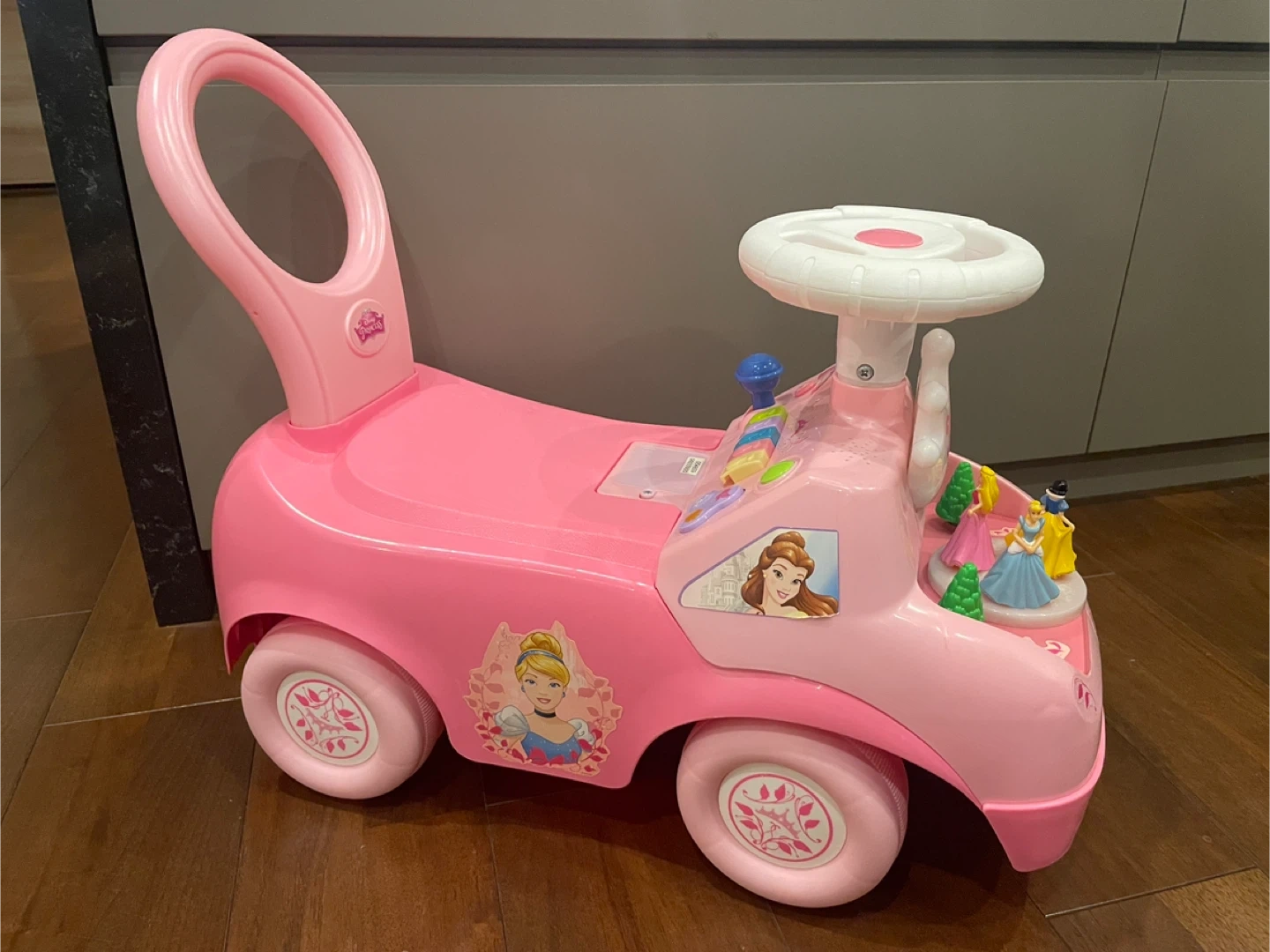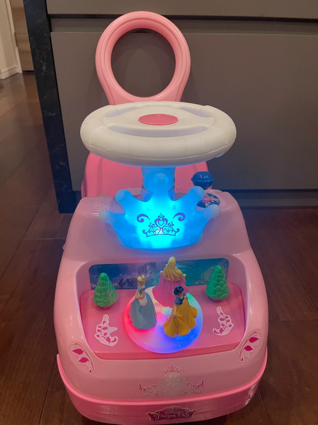 ディズニープリンセスの車です。 ピンクでオーロラ、ベル、シンデレラがいて、とても可愛いです! ボタンを押したり、前にある木を押すと音がなり写真のように光ります。もしかしたら他にも気付いていないしかけがあるかもしれません。   元々は1万円以上し現在日本では買えません。 楽天に似たのがありますが3万円以上です。 中古品ご了承の上ご検討ください。