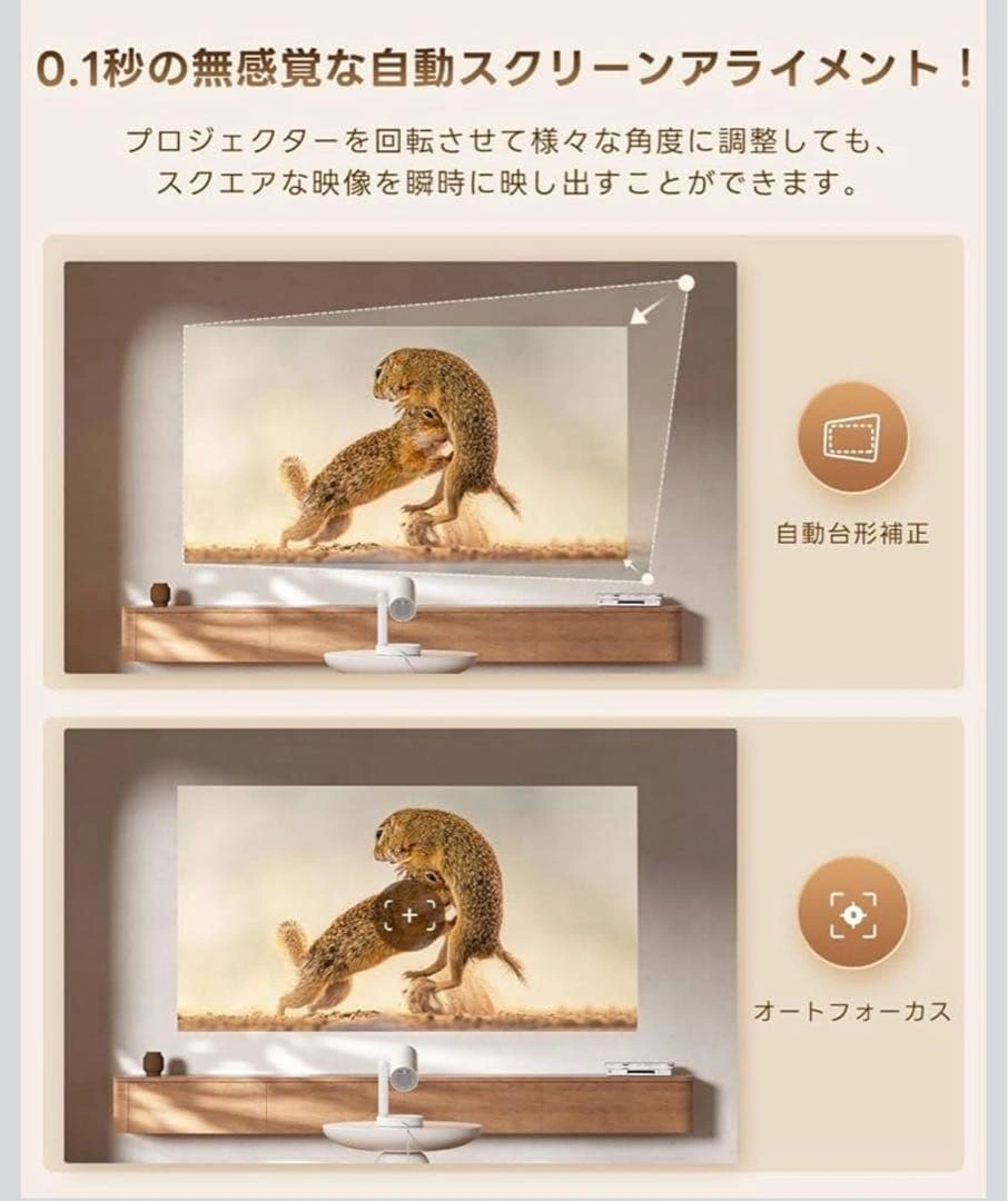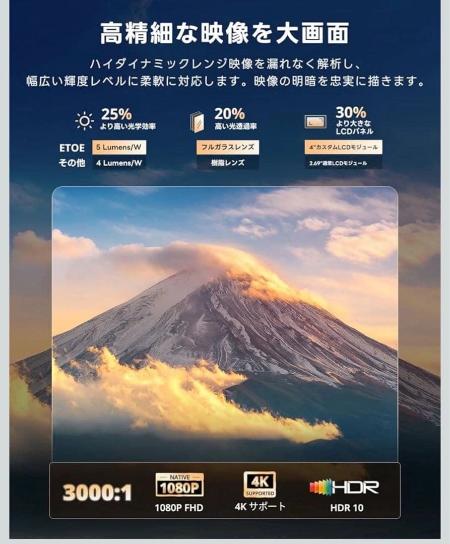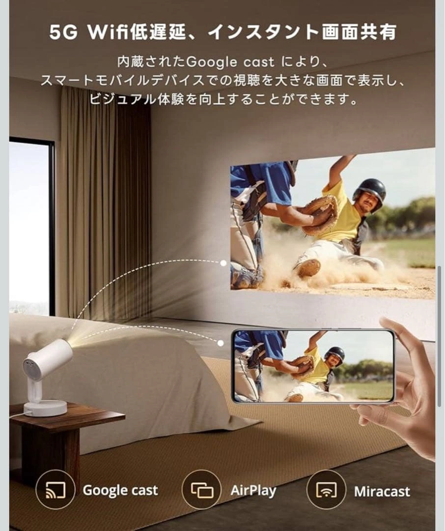 数ある中からご覧頂きありがとうございます(^○^) 【最新Google TV搭載、公式アプリを一括アクセス】 最新のGoogle TVを搭載し、Netflix、YouTube、Disney+、TVer、U-NEXT、Huluなどの公式アプリにスムーズアクセス。 【魅惑的な映像を映し出すフルHD解像度・HDR10+】明暗差の表現力が向上し、よりリアルで奥行きのある映像を再現します。HDR10+ により鮮明な映像を提供します、映画、アニメ、スポーツ観戦、ゲームなどあらゆるコンテンツを楽しめます。 【どの角度から見ても完璧にフィット】 画面の真正面に配置する必要はありません。電源を入れると自動でピント調整され、さらに自動台形補正機能が映像の歪みを瞬時に補正。設置後の調整が不要。 【Google Cast & AirPlay対応、スマホを大画面に】高速 5GHz Wi-Fi 接続で、スマートフォンやタブレットなどのスマートデバイスの画面投映がこれまでになく簡単になりました。スマートフォンやタブレットからGoogle Cast(Android)やAirPlay(iPhone)を使って。写真・動画・アプリ画面を大画面で手軽にシェアできます。 【ワンタッチで即起動&スムーズ操作】 リモコンのボタンを押すだけで瞬時に起動し、ホーム画面やアプリの切替もスムーズ。音声操作にも対応しており、複数のアプリを素早く検索して必要なコンテンツを簡単に見つけられます。 【天井への投映も可能な140°スマートスタンド】 本体は最大140度回転に対応し、天井や壁、ベッド横など好きな場所へ簡単に投影。狭い部屋やロフトでも設置の自由度が高く、理想のポジションで映像を楽しめます。 【 IP6X防塵設計、静音&長寿命を実現】密閉型のIP6X防塵光学エンジンにより、ホコリの侵入を防ぎ、静音性と耐久性を強化。長期使用でも劣化しにくく、メンテナンスの手間も軽減されます。 【ナイトライト搭載、癒しの空間を演出】本体のナイトライトは、タッチ操作やリモコンでON/OFFや明るさ・色の調整が可能。柔らかい光が目に優しい。