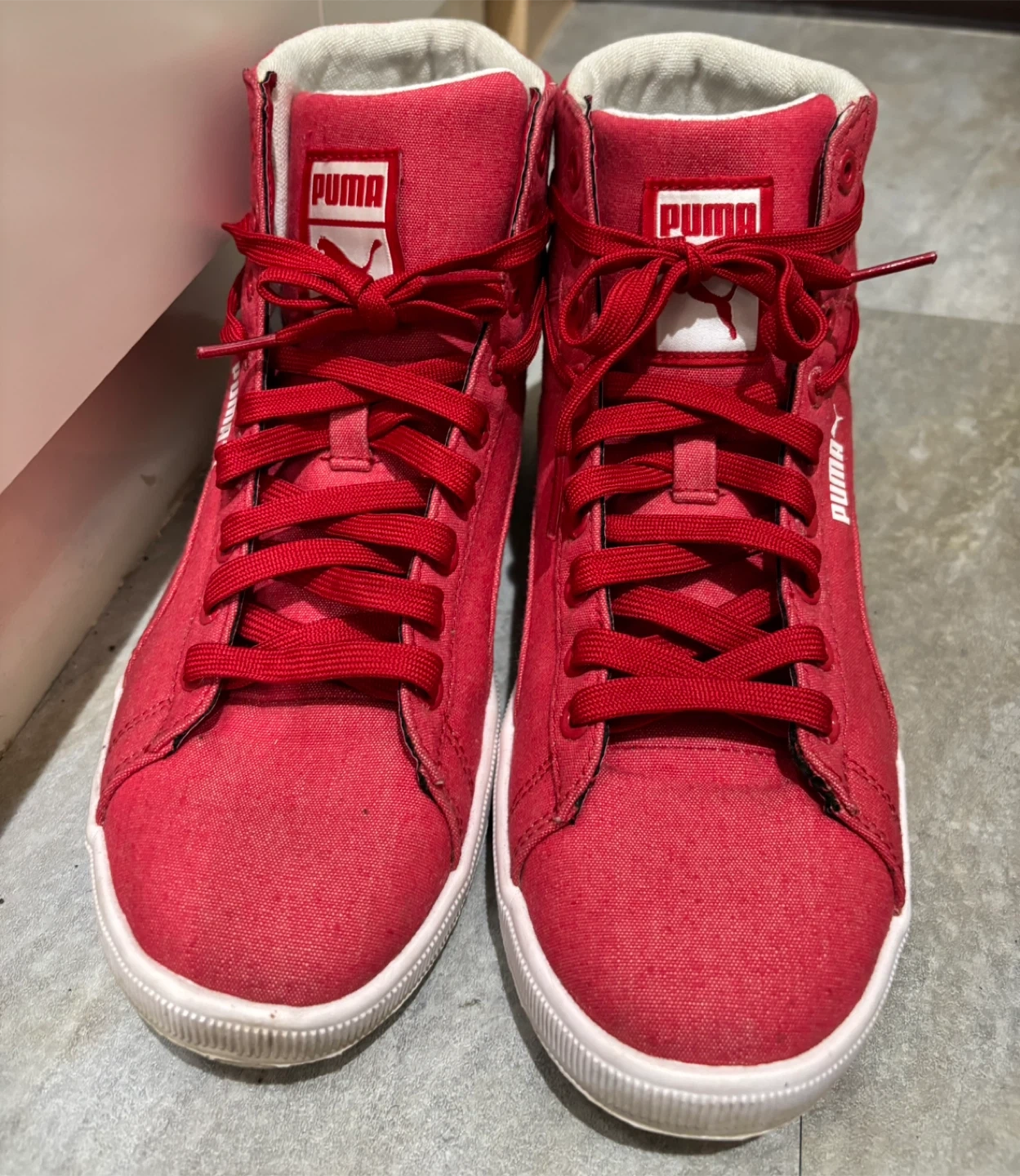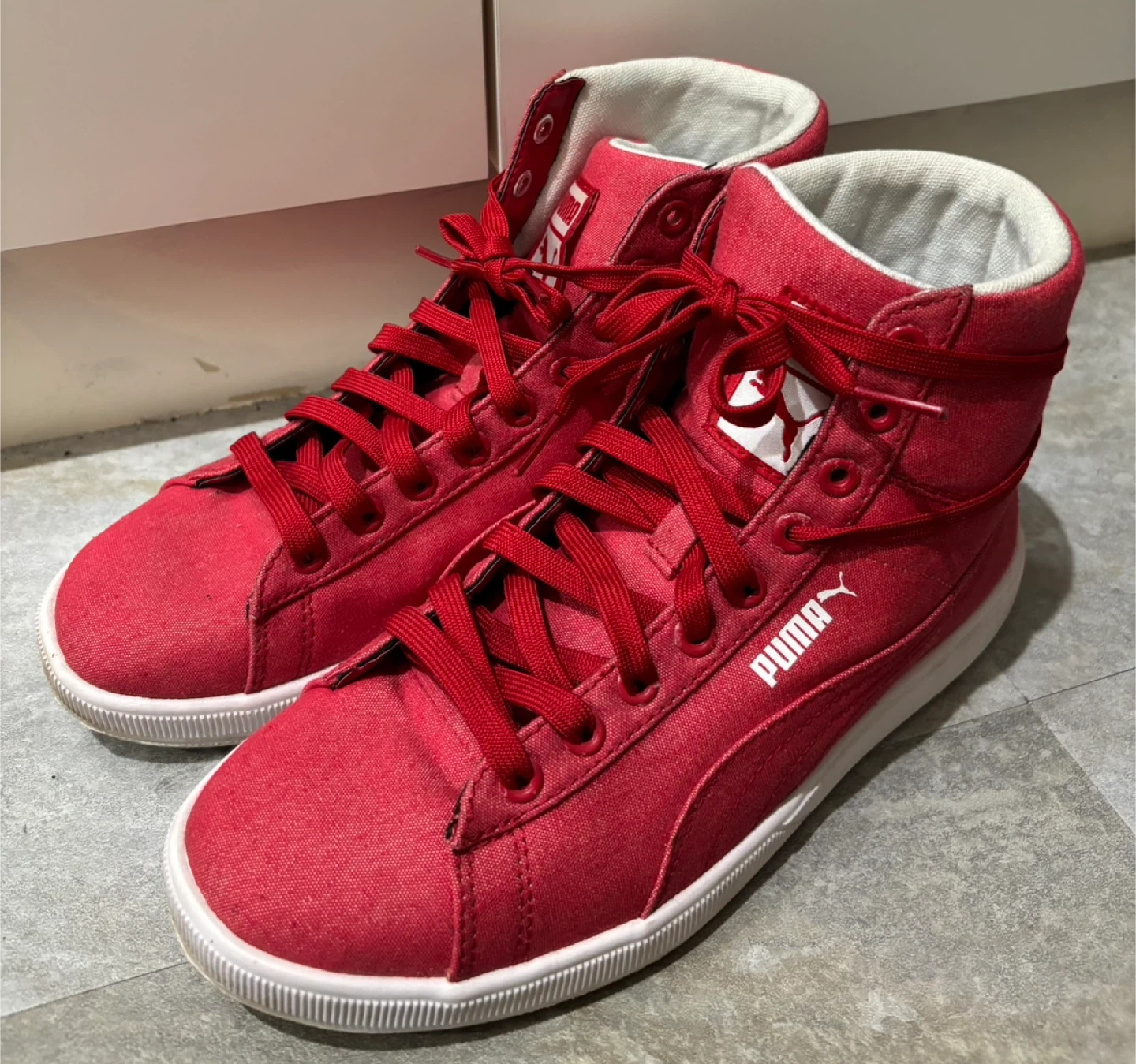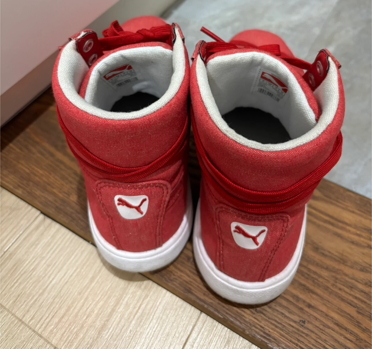 プーマのスニーカーです。 ・ブランド:プーマ ・色:赤 ・サイズ:24 ・使用回数少なめ ※軽くてかわいくて履きやすいです。スニーカーが増えてしまった為出品します。 ※サイズ感:普段ニューバランス、adidas24.5を履いていますがこちらは24でピッタリです。 中古品であることをご了承ください。