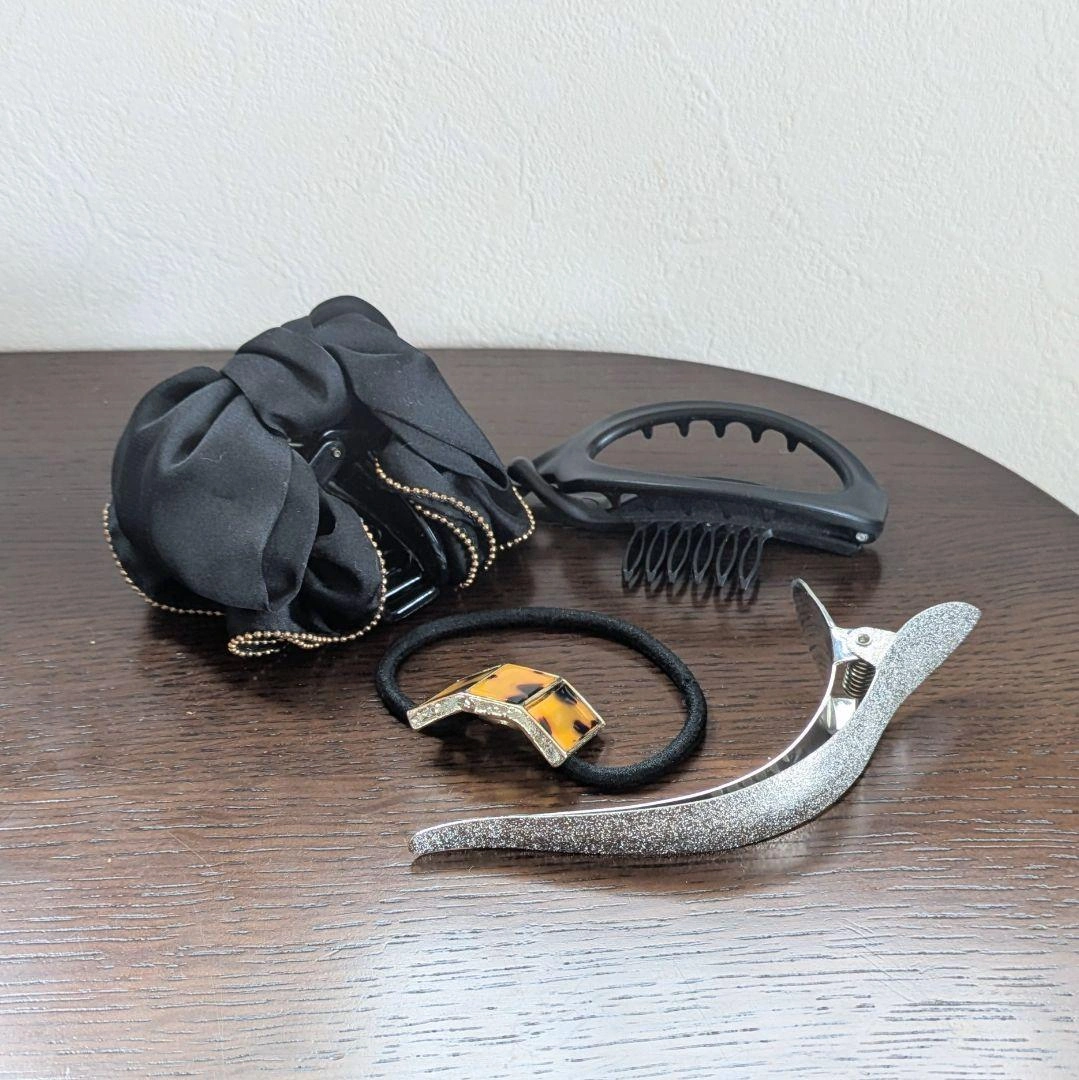 ヘアゴム 1点、バレッタ・ヘアクリップ 3点のまとめ売りです。 カラー...ブラック 汚れ・破れ・臭いなど...なし ご希望の方はお気軽にご連絡ください。