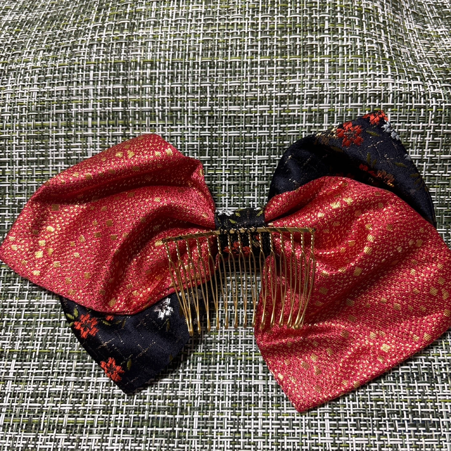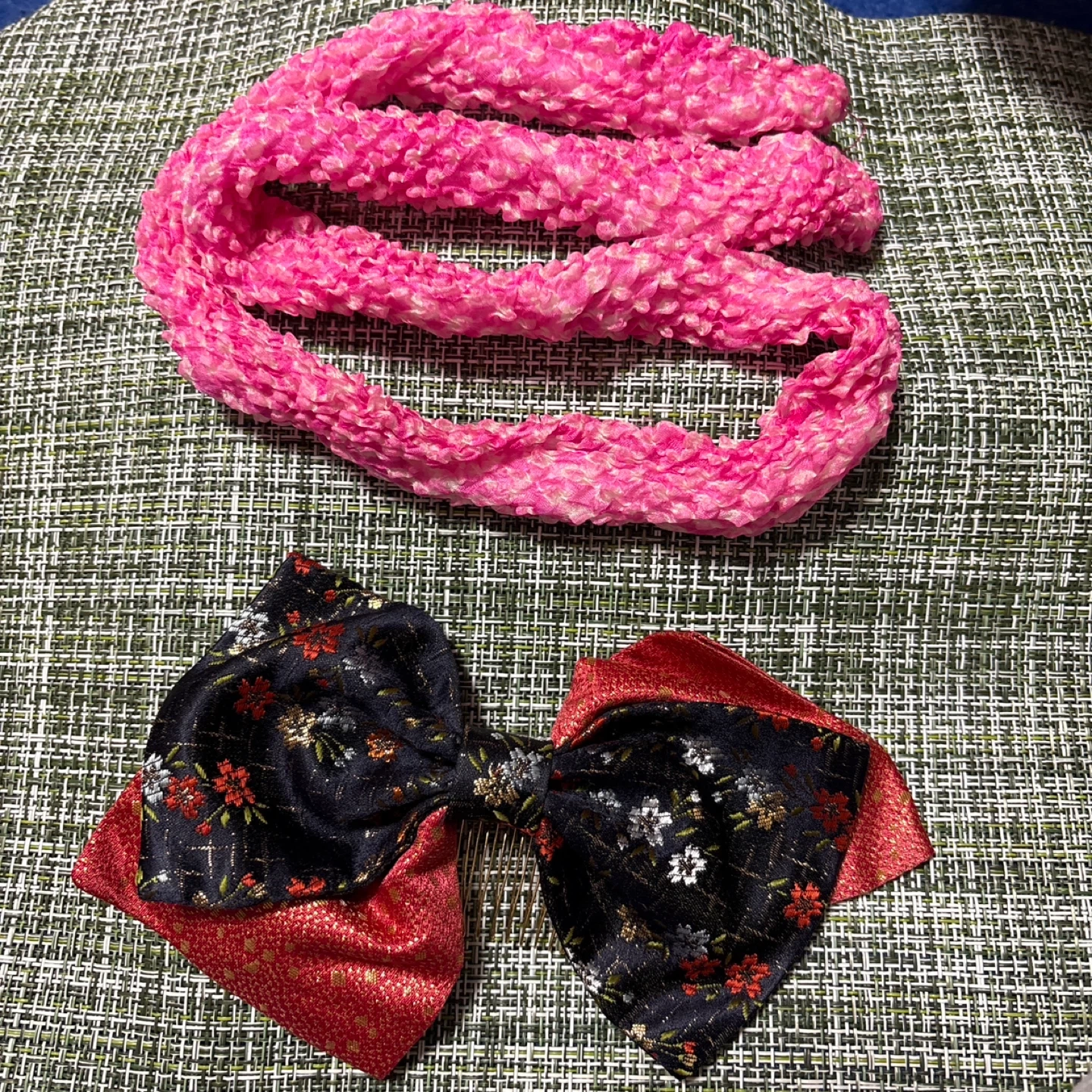 ヘアアクセサリー2点セットです。 ・ピンクのシュシュのようなヘアバンド ・黒と赤のリボンの髪飾り(コーム付き) 中古品であることをご了承ください。 華やかな花柄のリボンで、七 五三の装飾に最適です。 - 色: ピンク - デザイン: 花柄のリボン - 素材: 布製 - 装飾: コーム付きのリボン 横長さ 一番長いところで19㎝ リポンの長さは82㎝ リボンは自分の髪に結ぶ物だと思います。 箱は付いておりません。