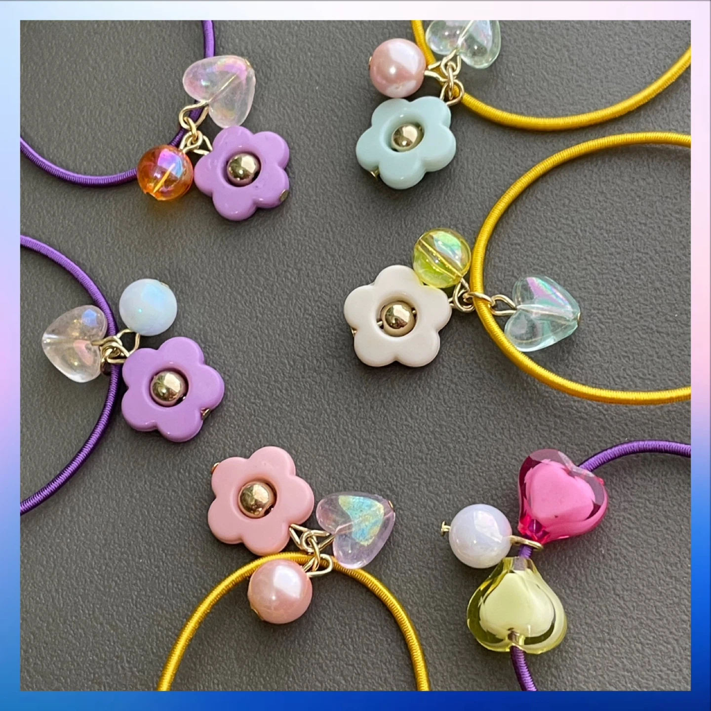 あたたかさベビー・キッズヘアゴムのまとめ売り(6個)です。 ・ハンドメイド ・ゴム色:紫、黄色 ・花とハート・ビーズの飾りが付いています ・状態:新品