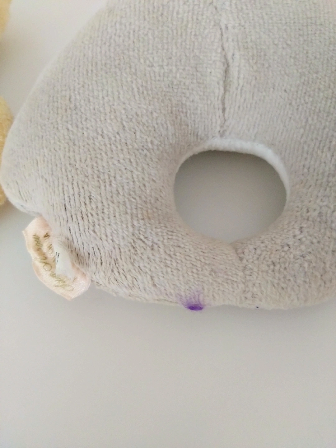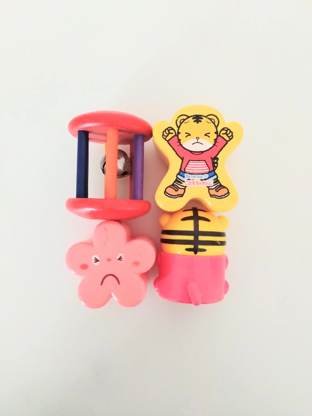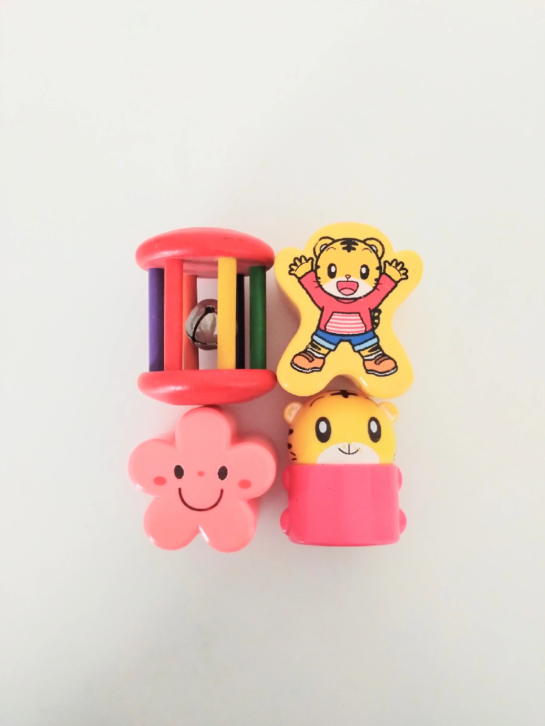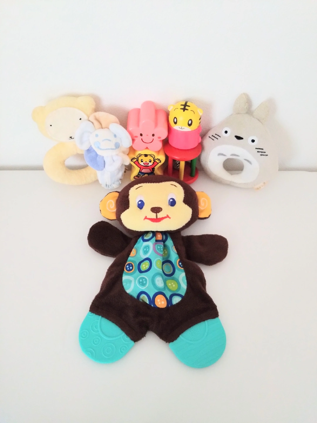 猿のおもちゃはお腹の緑色の部分にビニール素材が入っており、握るとシャカシャカ音がします。 ピンクの桜型のおもちゃ以外は振ると音がなります。 トトロ、黄色いクマのガラガラは一部汚れがあります。 分かりづらいですが写真参照下さい。 黄色いクマの首の一部が糸がほつれております。 桜型おもちゃに一部汚れがあります。 布製のおもちゃは全て洗濯済みですが汚れは完全に落ちませんでした。 中古品であることご了承ください。