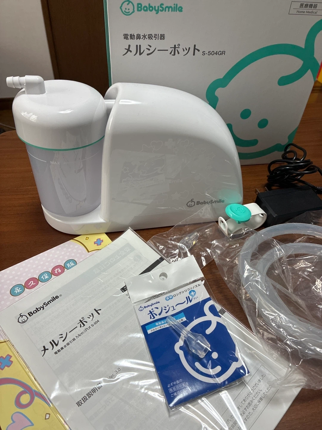 ベビースマイルの電動鼻水吸引器です。 【情報】 ブランド:ベビースマイル 商品名:メルシーポット 型番:S-504GR 【状態】 使用感少なめ 目立つキズは見当たりません。 ボンジュールをつけて数回使用しています。 使用済みを理解していただける方のみお願い致します。 転居の為12月14日までの掲載です。 【付属品】 箱、説明書、その他付属品 中古品であることご了承ください。