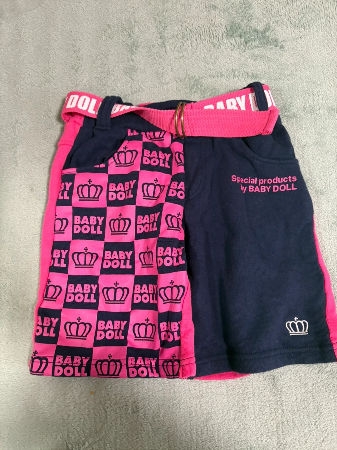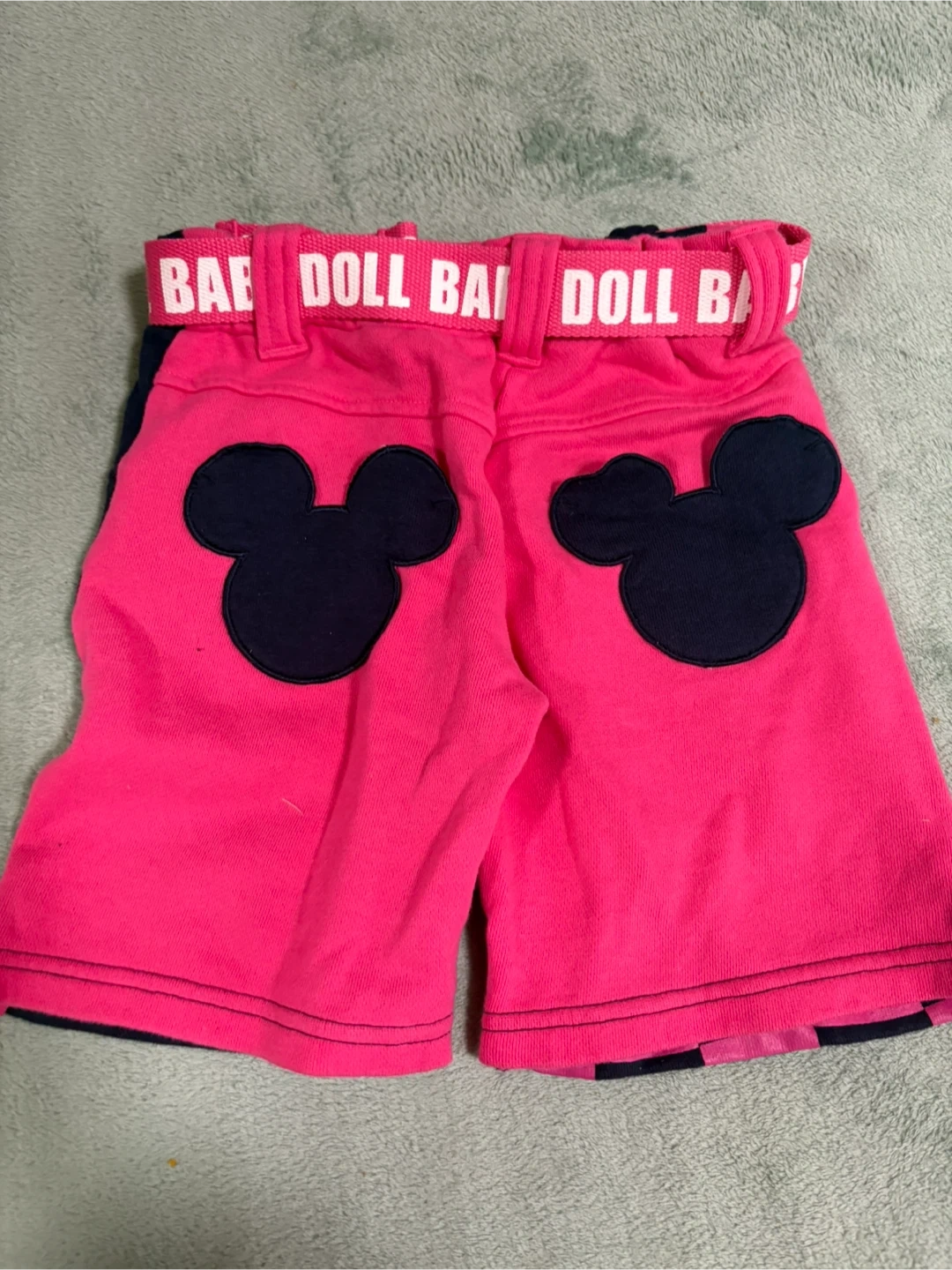 ベビードールのハーフパンツです ・サイズ:100cm ・カラー:ピンク、ネイビー ・後ろにミッキーマウスのデザイン ・ベルト付き ・使用感あり 中古品であることご了承ください 返金返品は,ないのでご了承ください。 よろしくお願いします。
